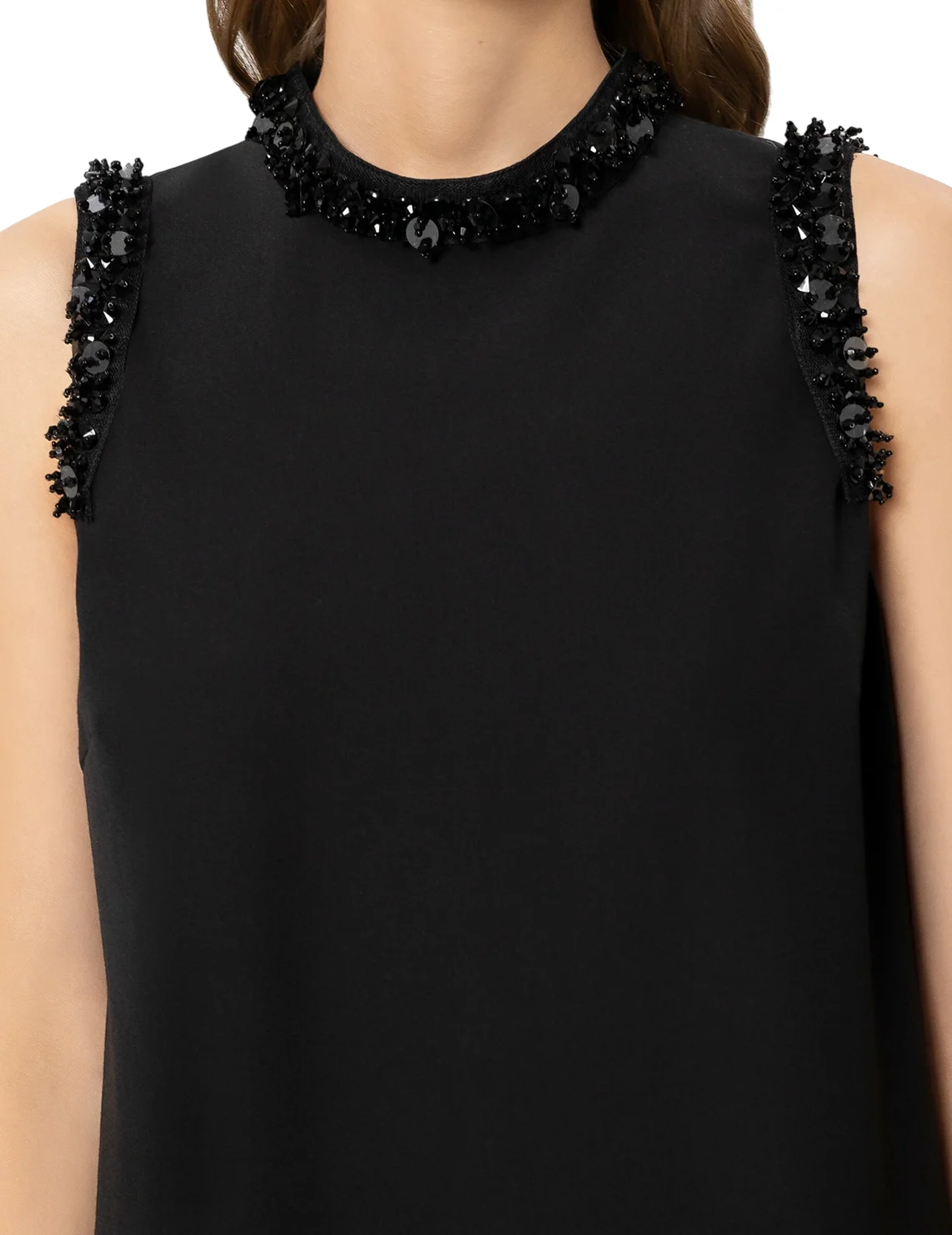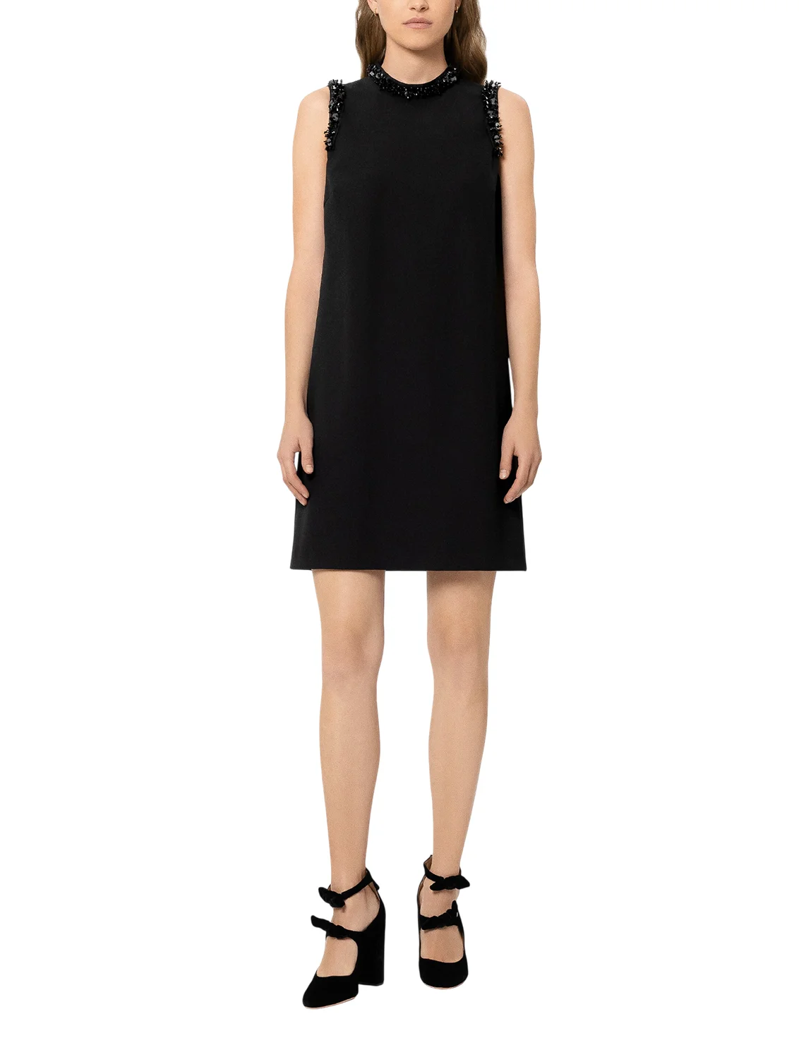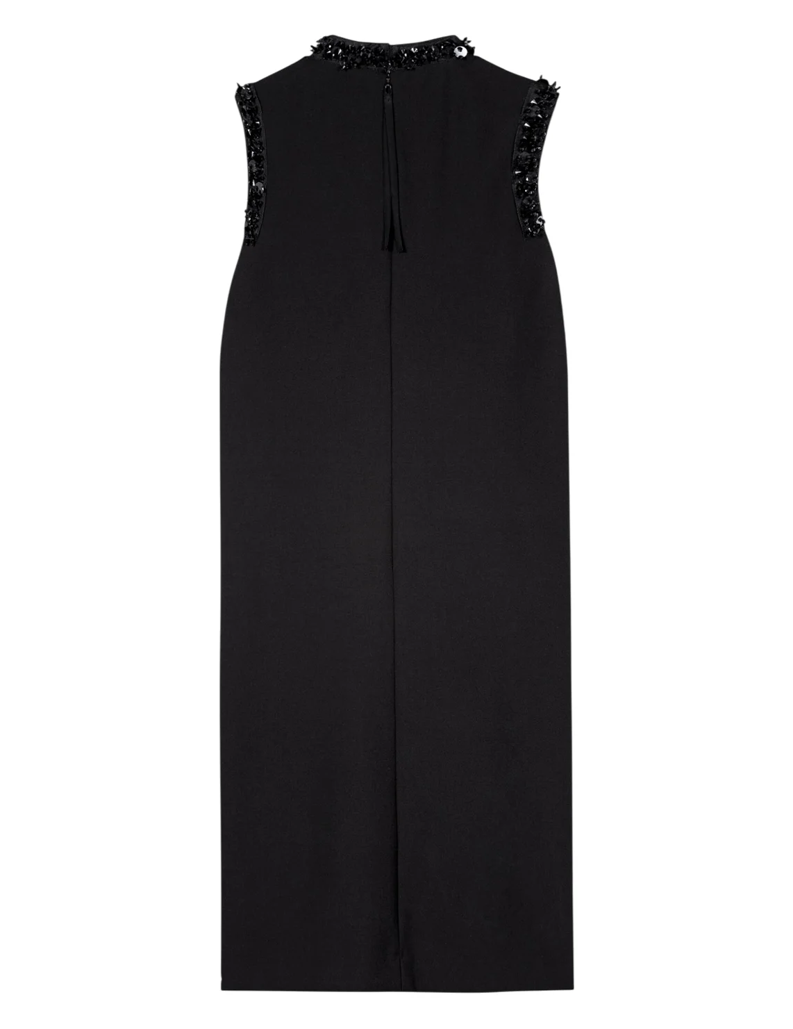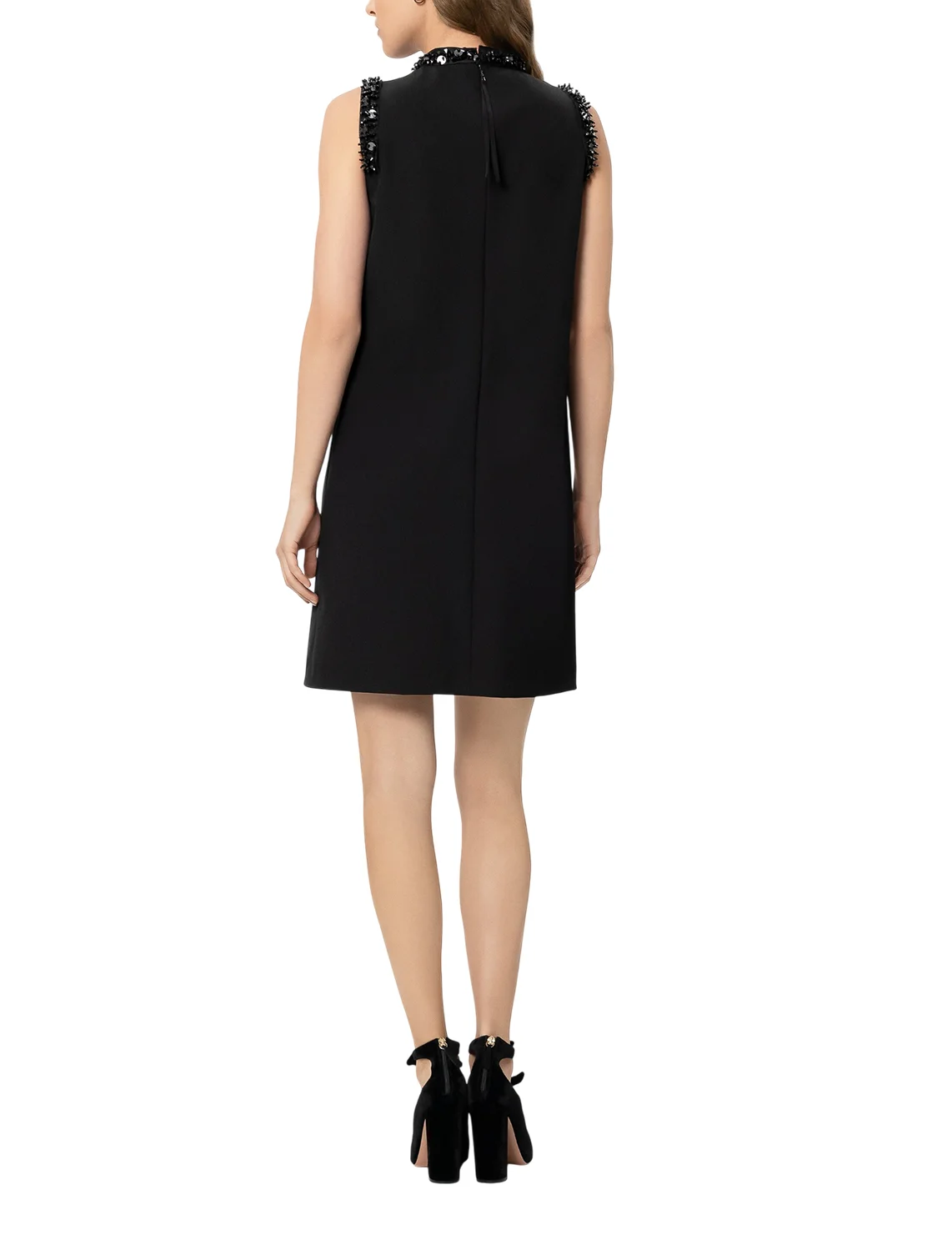 Сукня виготовлена з поліестеру, віскози та еластану. Модель довжини міні виконана в прямому крої. Має комір-стійку та застібку на блискавці ззаду. Декорована паєтками та стразами.