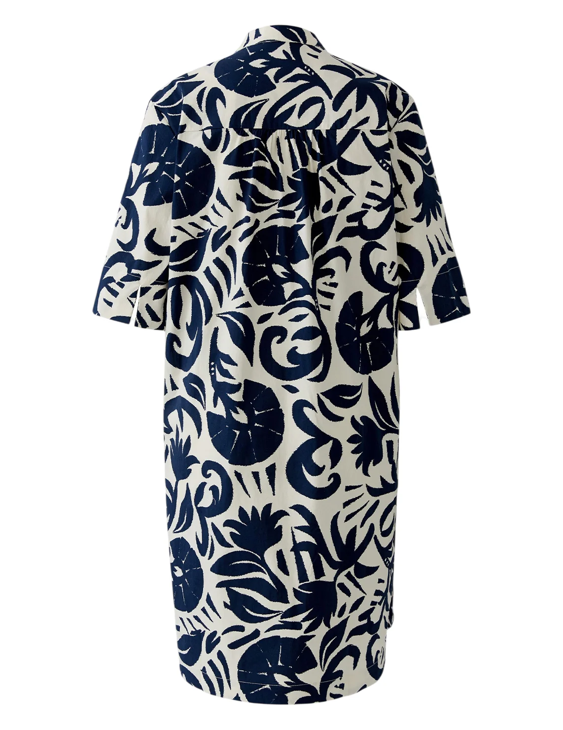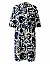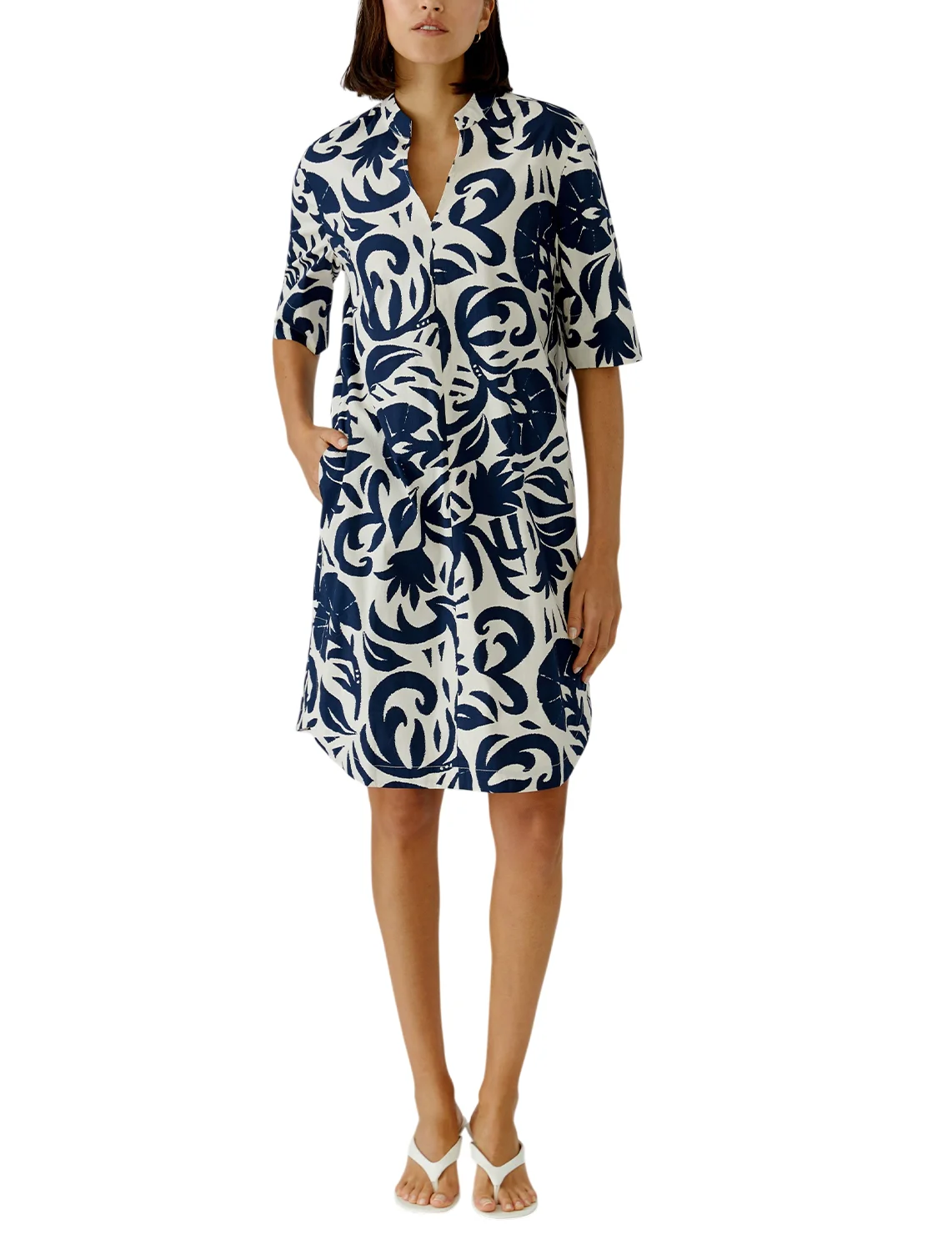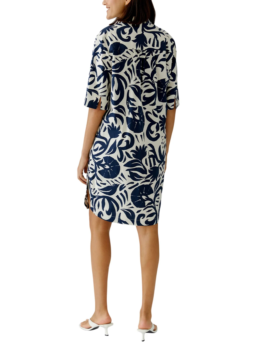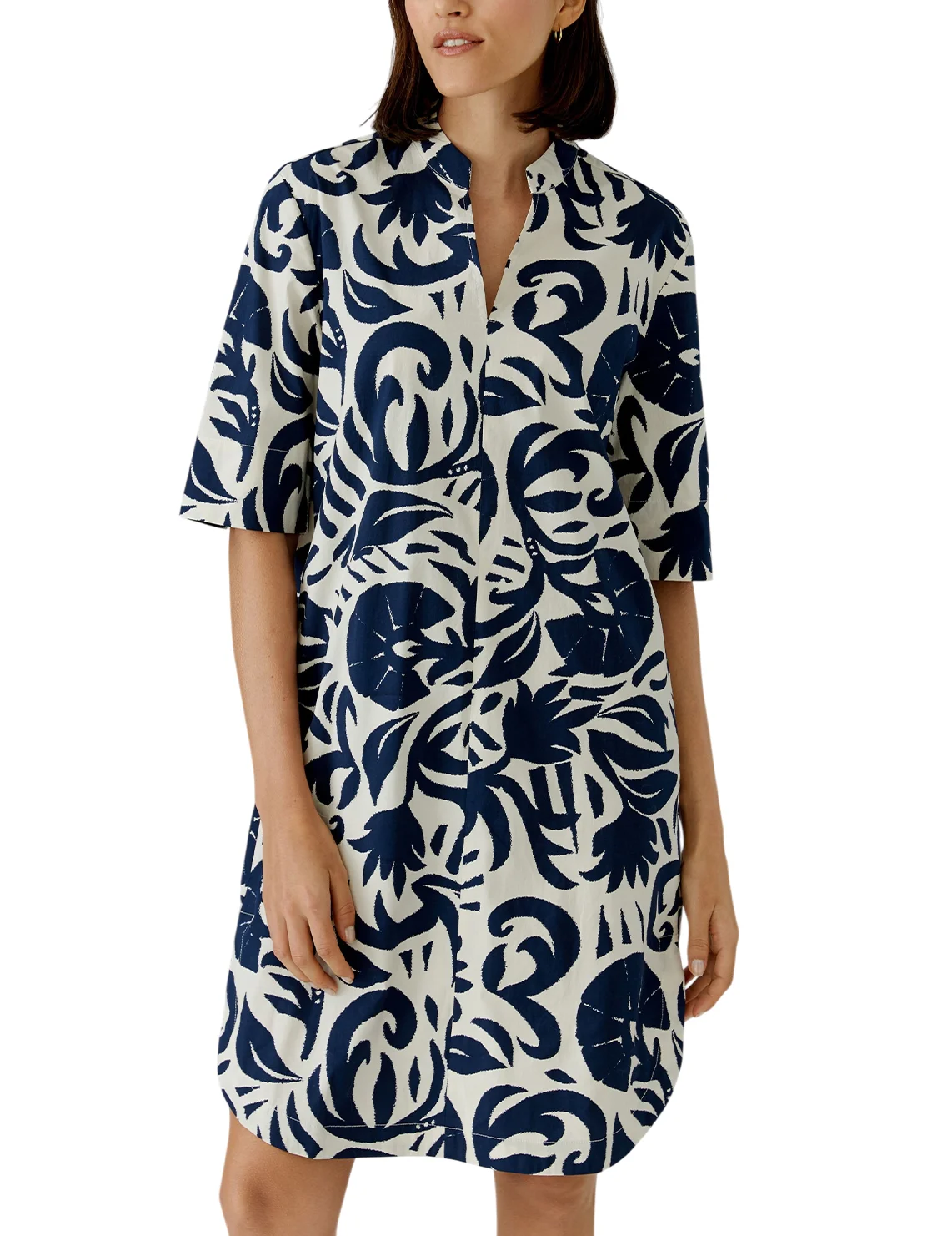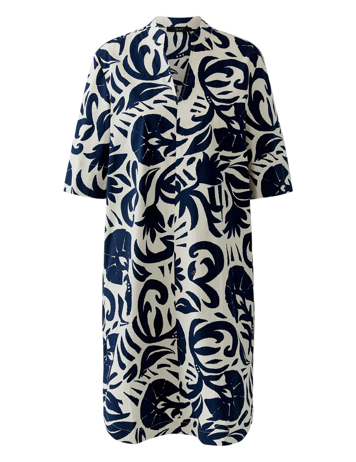 Сукня виготовлена з бавовни та еластану. Модель довжини міні виконана у прямому крої. Має комір-стійку з V-подібним вирізом, бічні прорізні кишені та рукави довжиною 3/4 з розрізами на манжетах. Декорована оригінальним принтом.