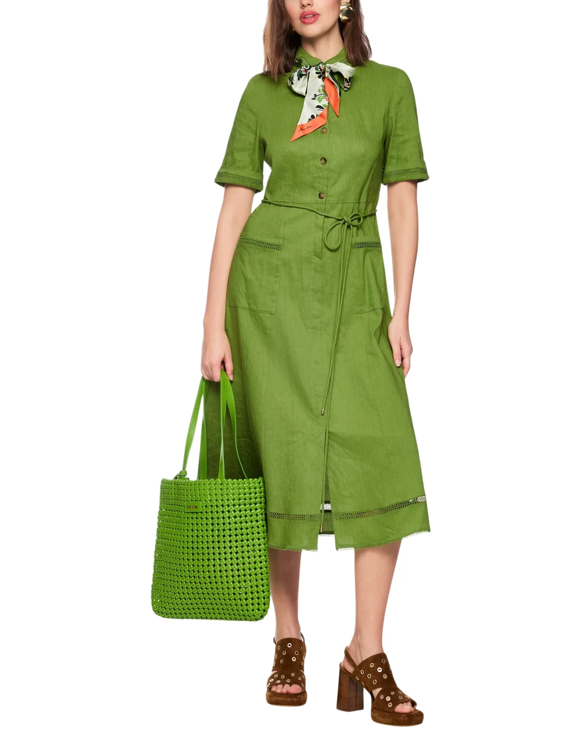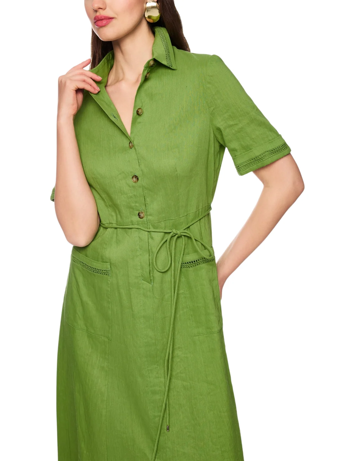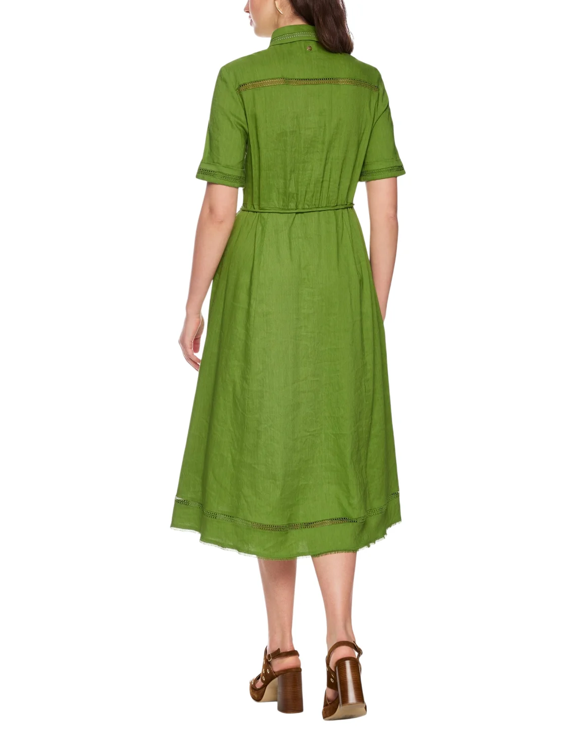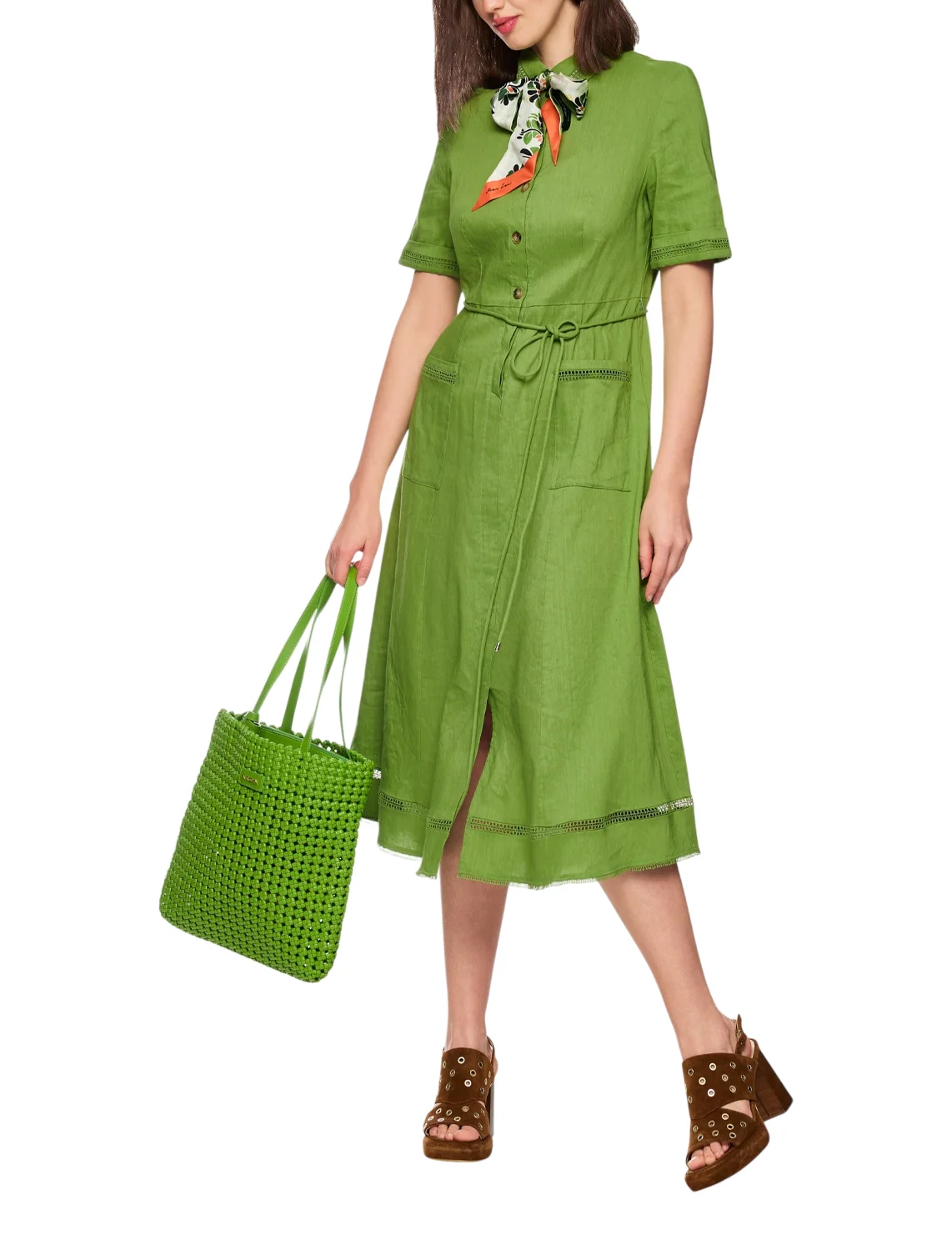 Сукня виготовлена з льону, віскози та еластану. Модель довжиною міді виконана в розкльошеному крої. Має відкладний комір, короткі рукави з перфорованими манжетами, накладні кишені та пояс-шнур у тон. Декорована перфорацією на спинці та подолі. Застібається на ґудзики.