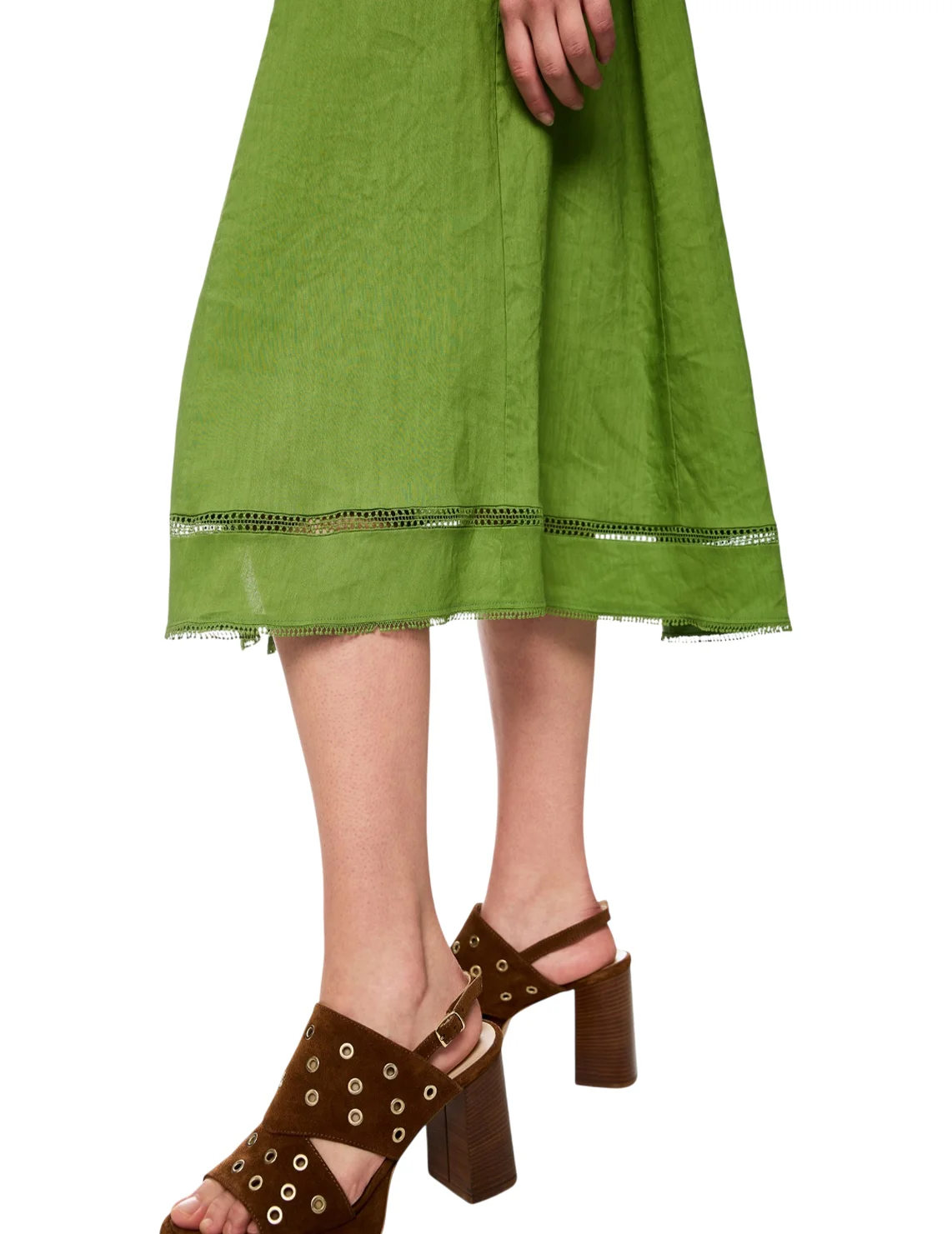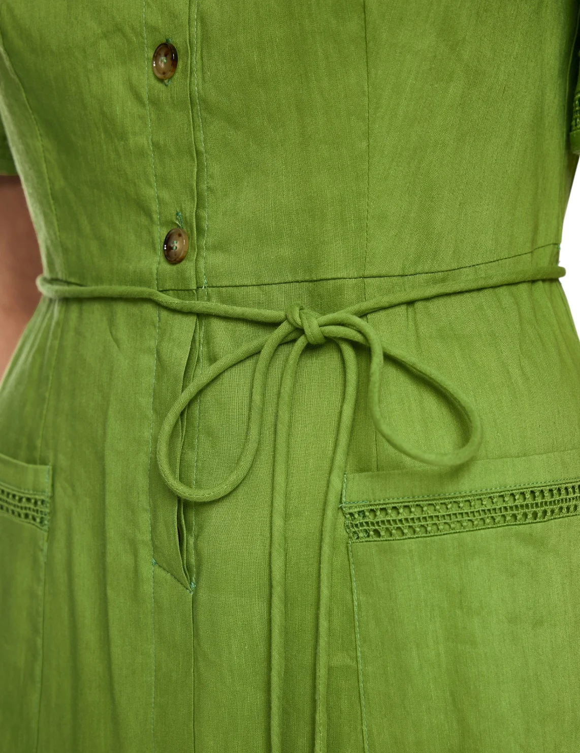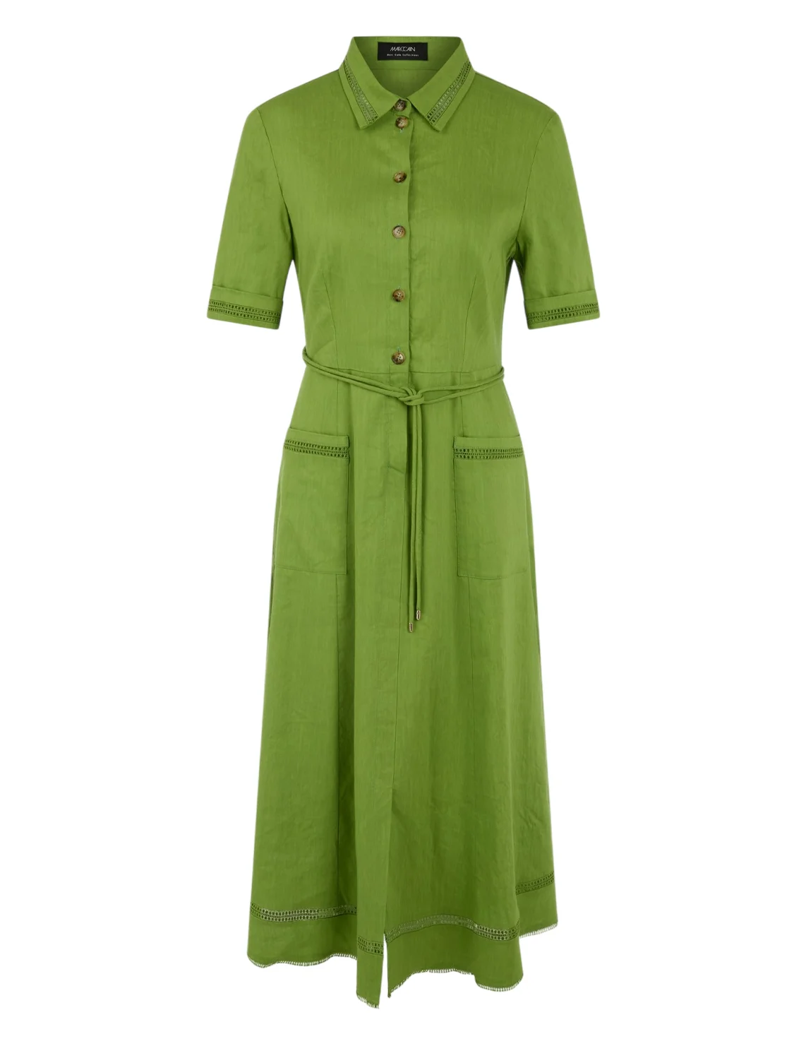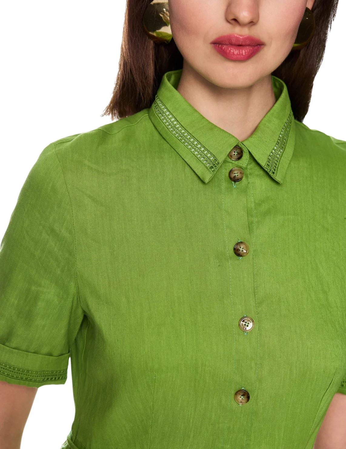 Сукня виготовлена з льону, віскози та еластану. Модель довжиною міді виконана в розкльошеному крої. Має відкладний комір, короткі рукави з перфорованими манжетами, накладні кишені та пояс-шнур у тон. Декорована перфорацією на спинці та подолі. Застібається на ґудзики.
