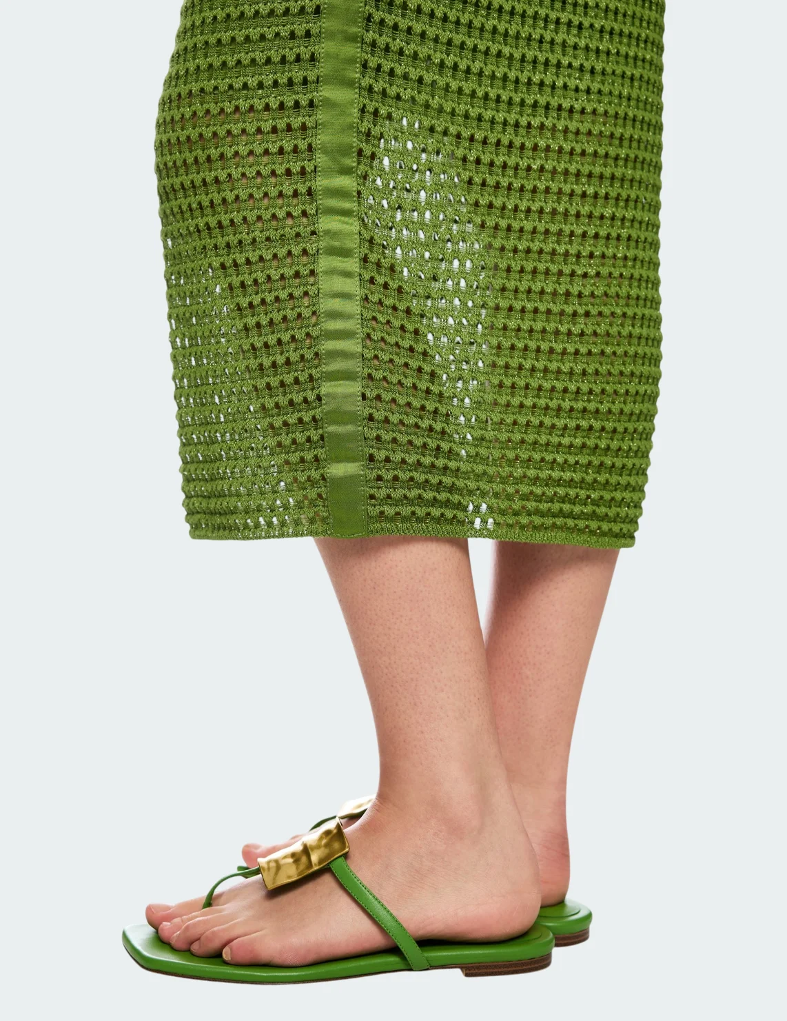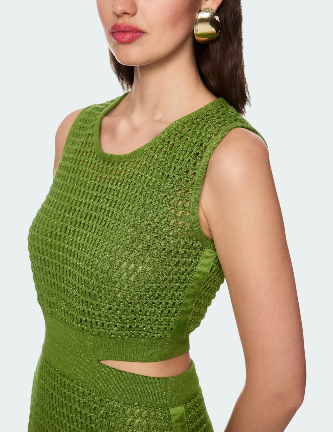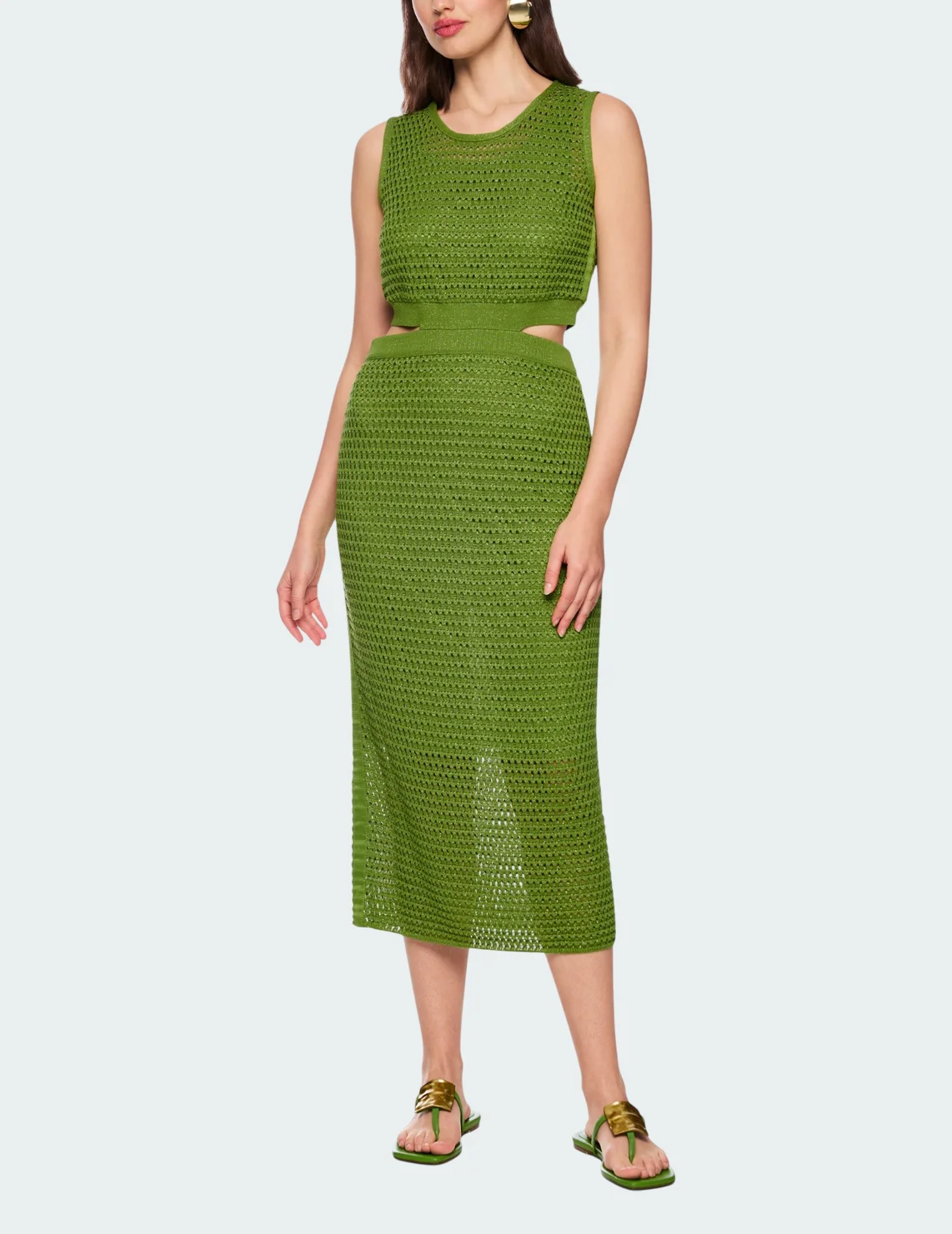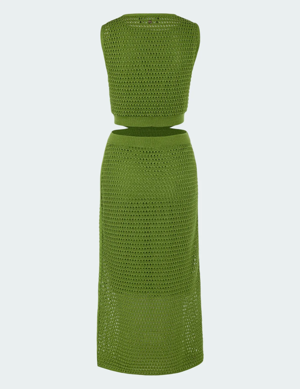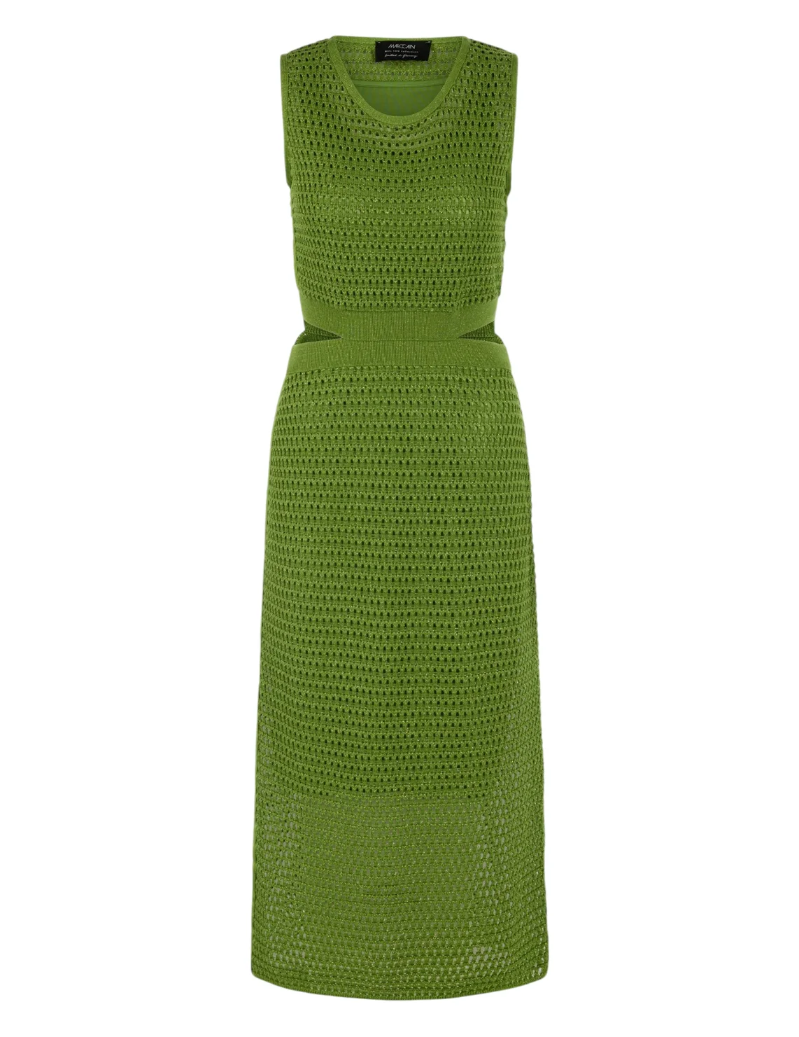 Сукня виготовлена з бавовни, віскози та металізованого поліестеру. Модель довжиною міді з підкладкою. Має круглий виріз горловини, еластичний пояс із розрізом навколо талії.