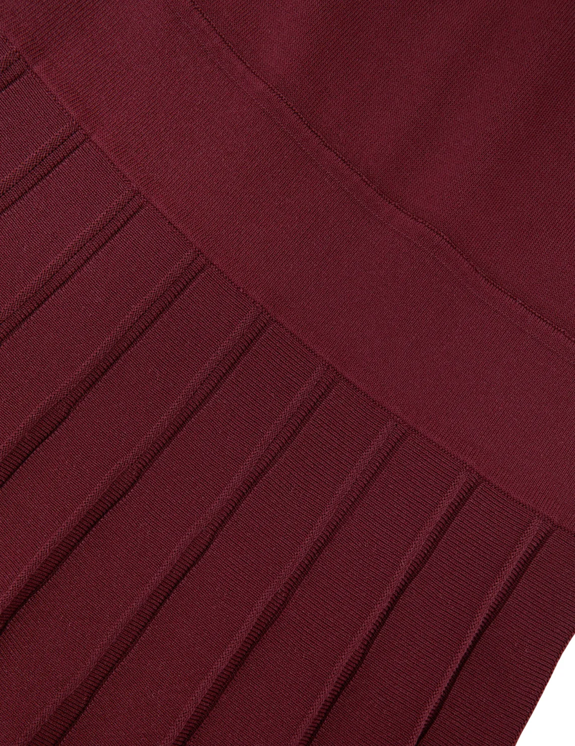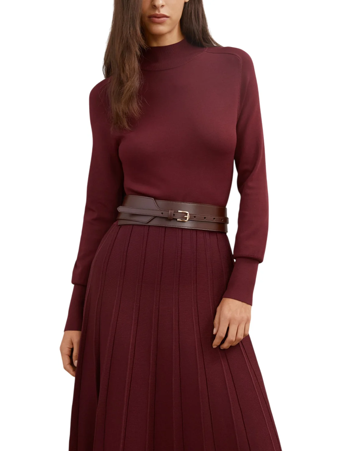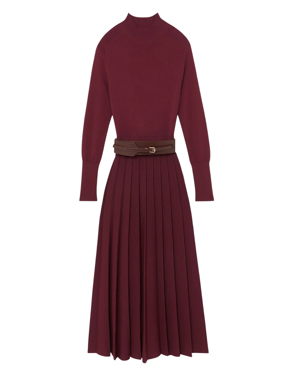 Сукня виготовлена з віскози, поліаміду та еластану. Модель довжини максі виконана в розкльошеному крої. Має комір-стійку, оригінальний ремінь, плісирування і довгі рукави з манжетами.