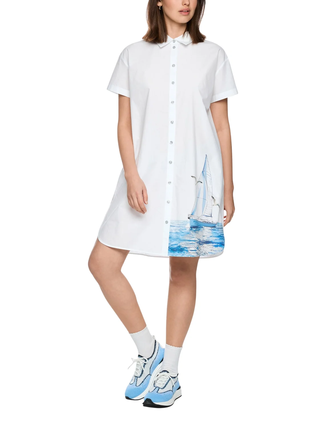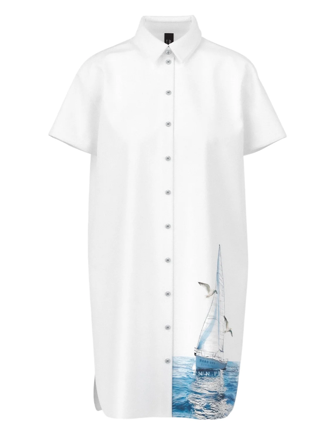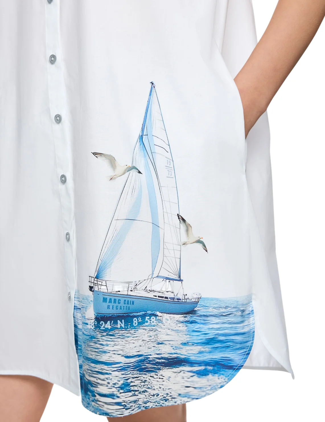 Сукня-сорочка виготовлена зі 100% бавовни. Виконана у прямому крої. Має відкладний комір, короткі рукави та бічні кишені. Застібається на ґудзики. Декорована морським фотопринтом.