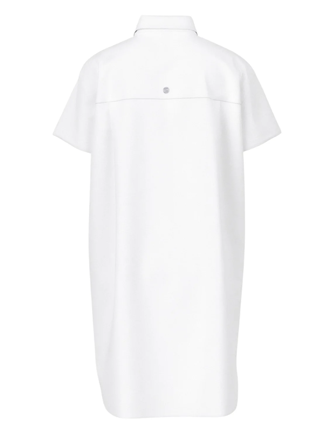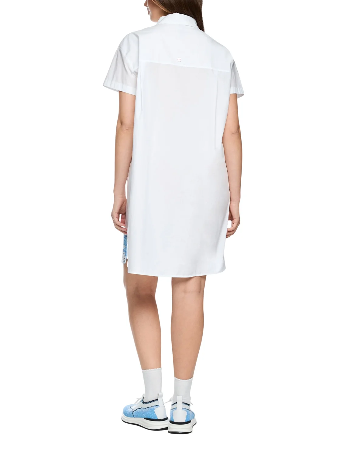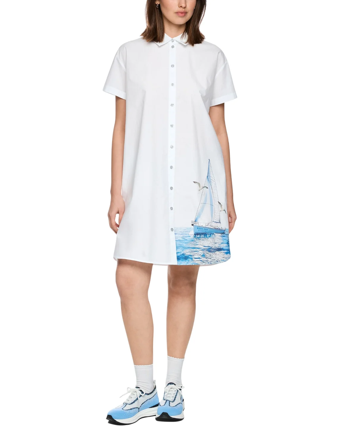 Сукня-сорочка виготовлена зі 100% бавовни. Виконана у прямому крої. Має відкладний комір, короткі рукави та бічні кишені. Застібається на ґудзики. Декорована морським фотопринтом.
