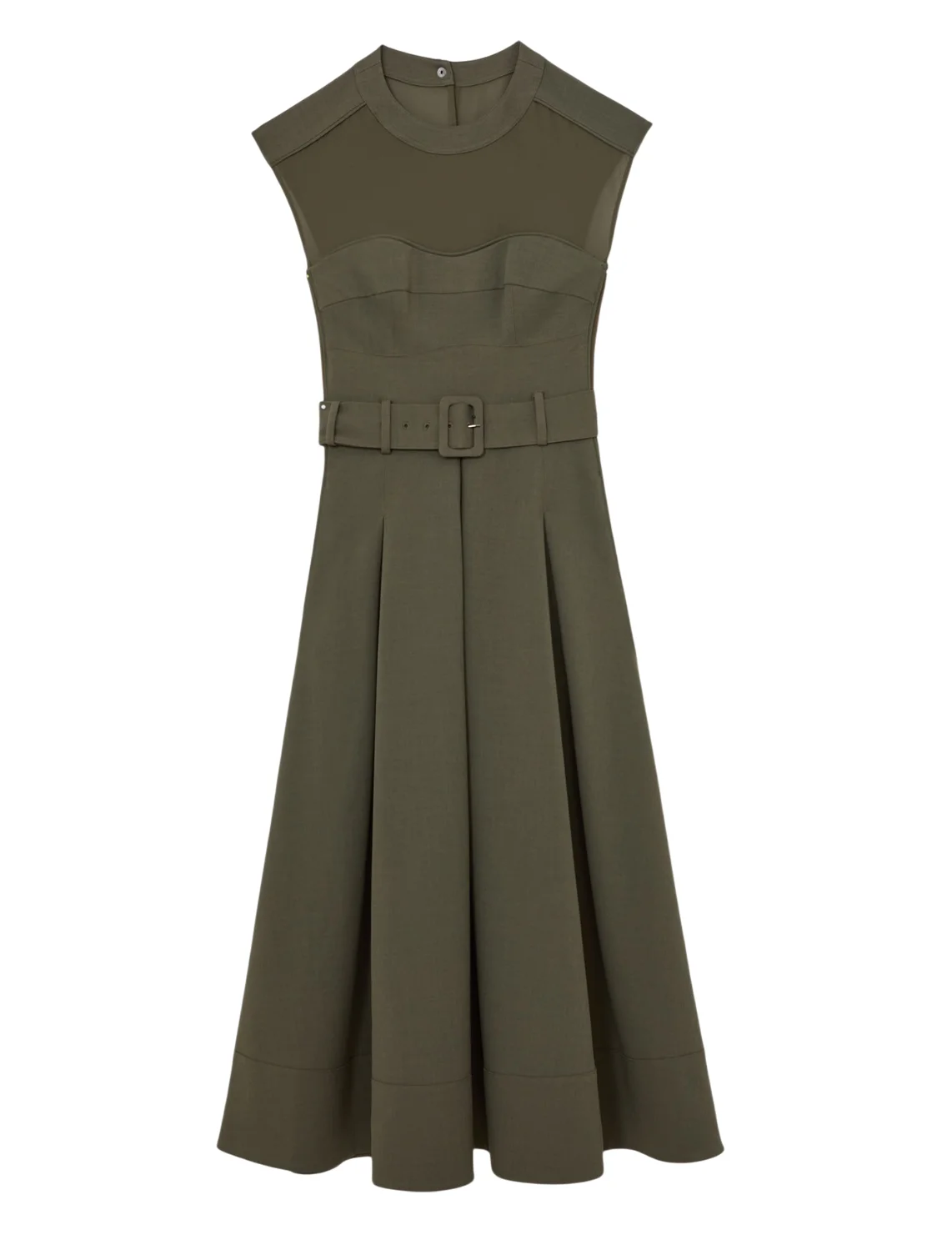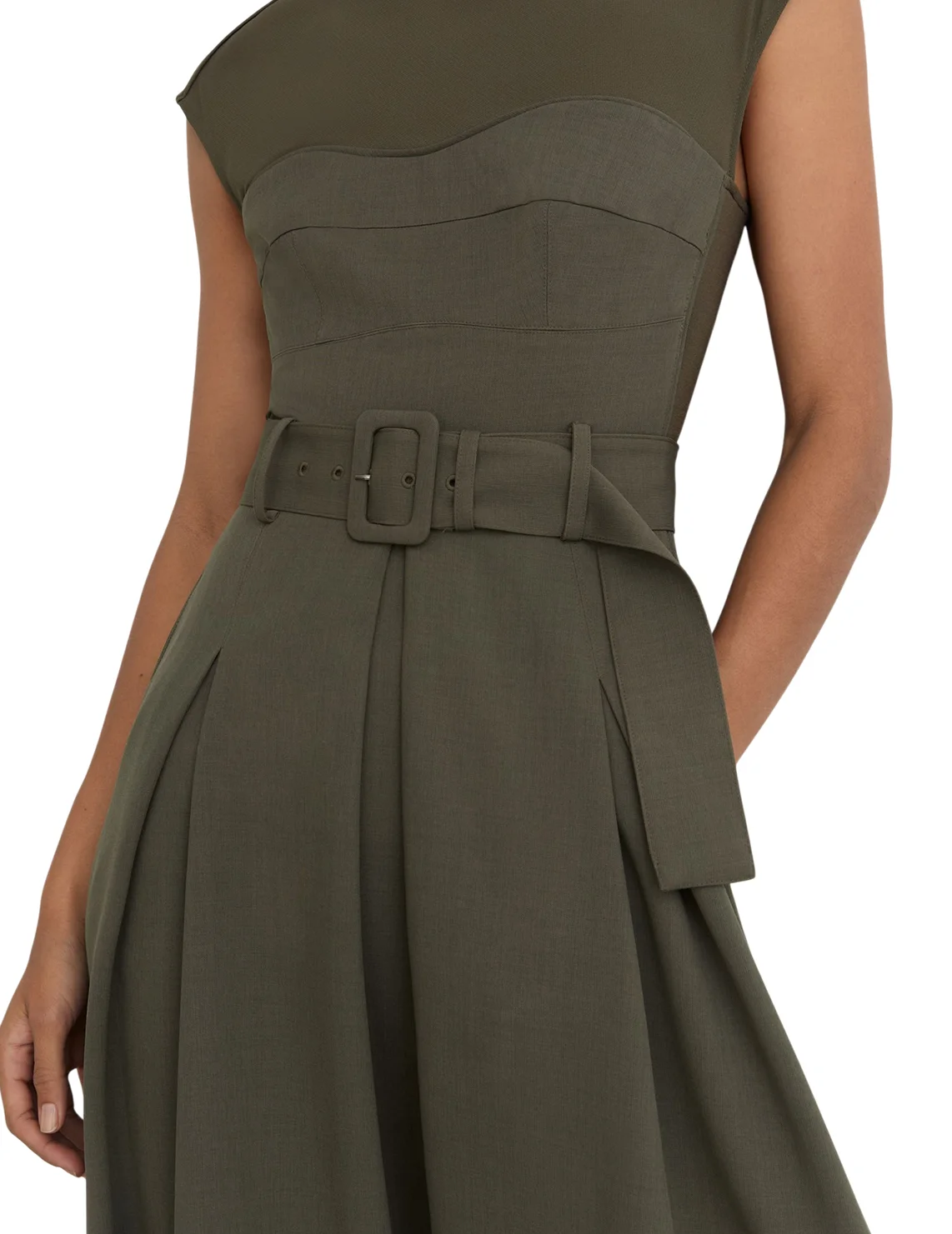 Сукня виготовлена з поліестеру та еластану. Модель довжини міді виконана в розкльошеному крої. Має круглий виріз горловини, прорізні кишені, шльовки для ременя, пояс у тон з пряжкою і застібку-блискавку з кнопкою ззаду. Декоровано складками та сітчастими вставками.