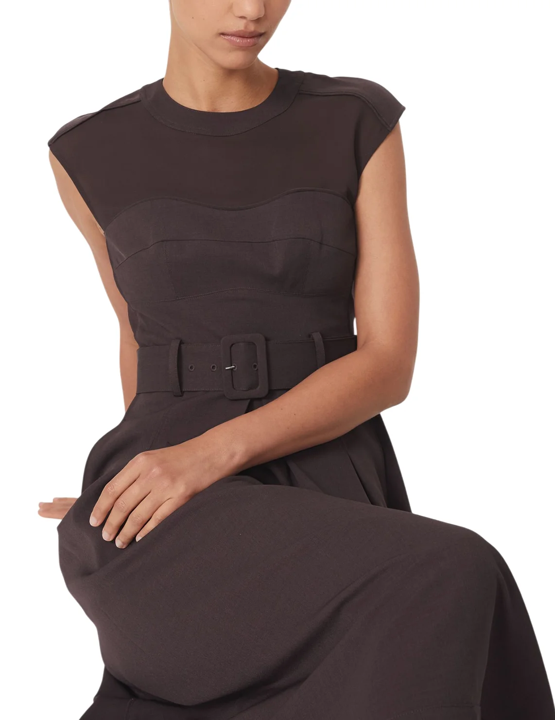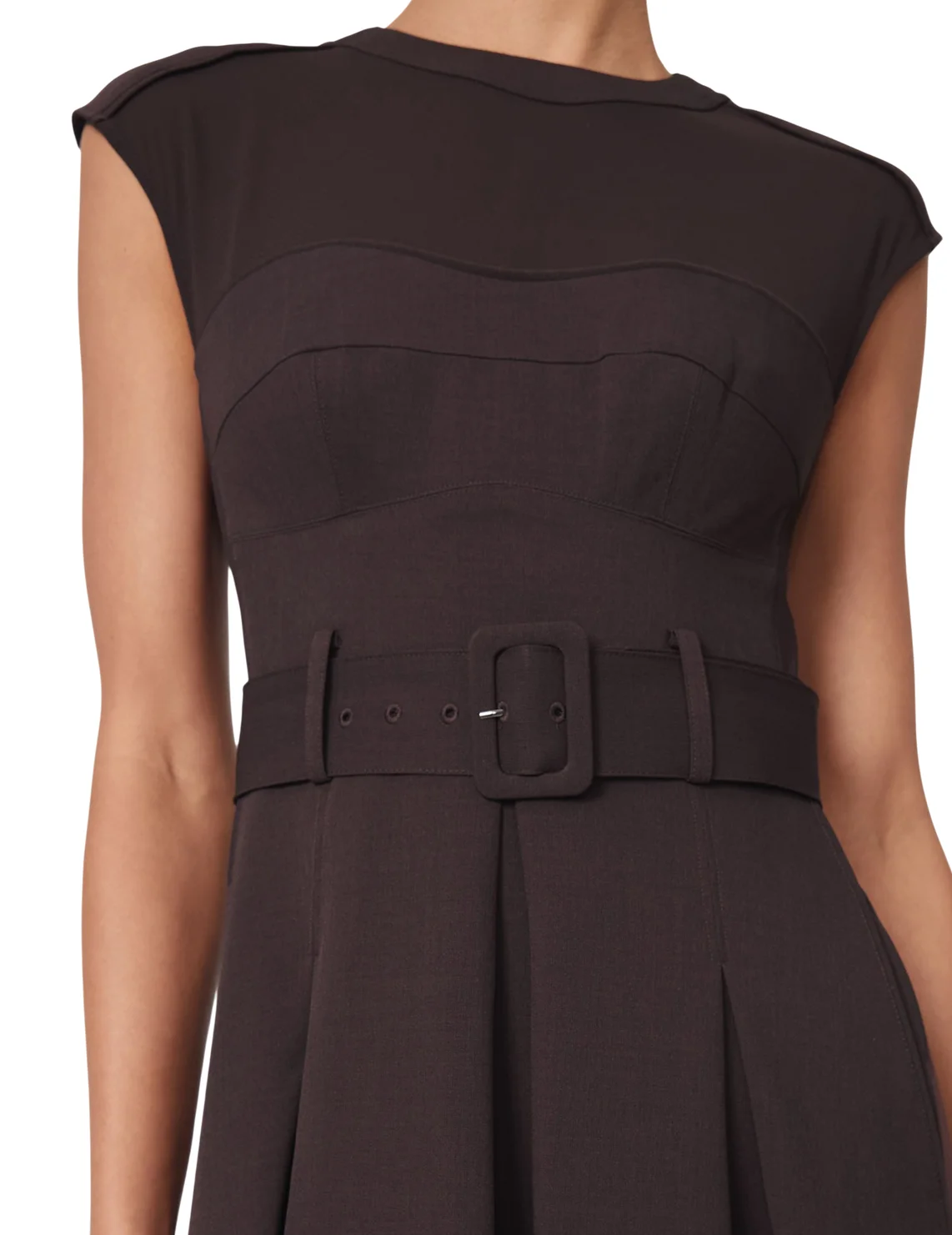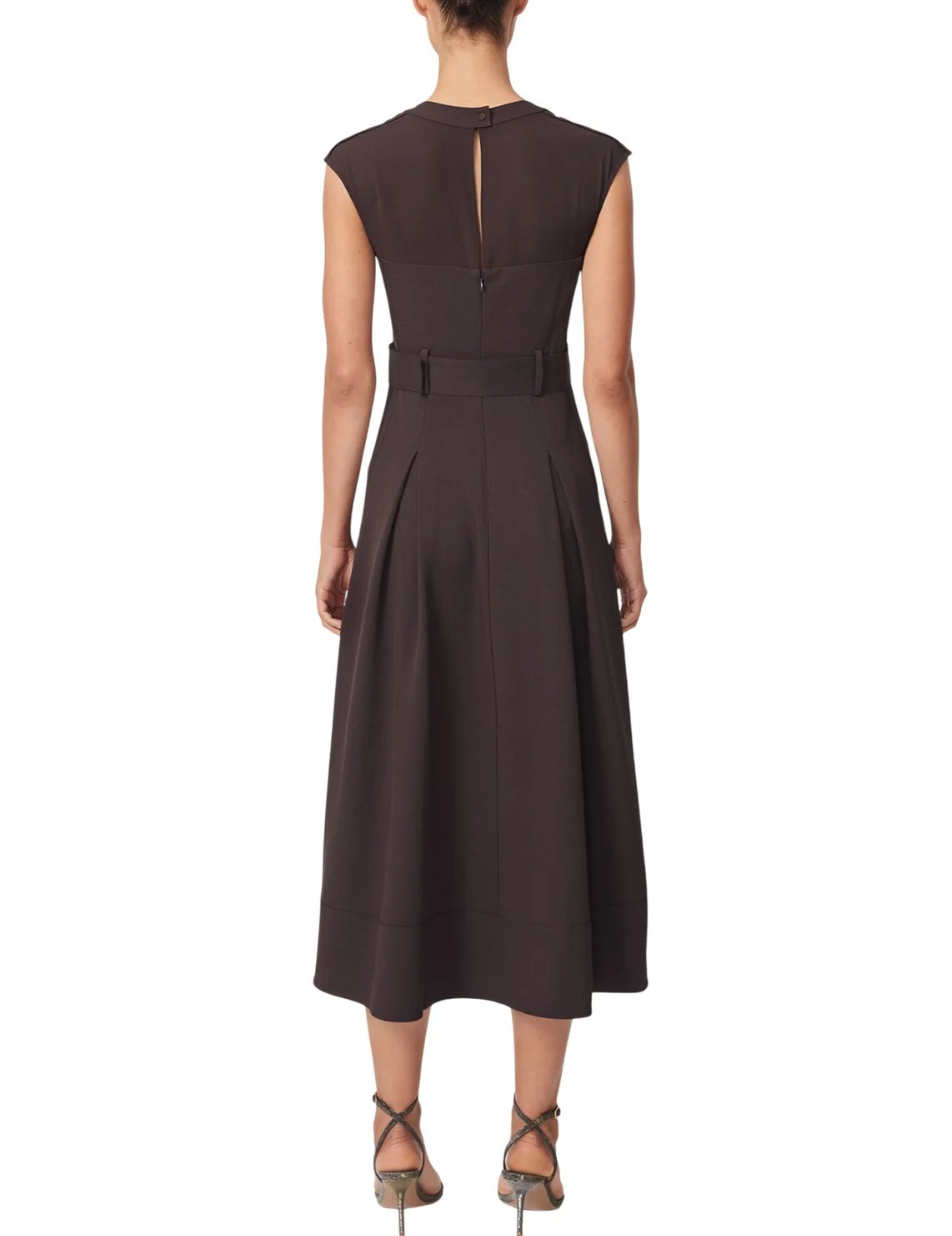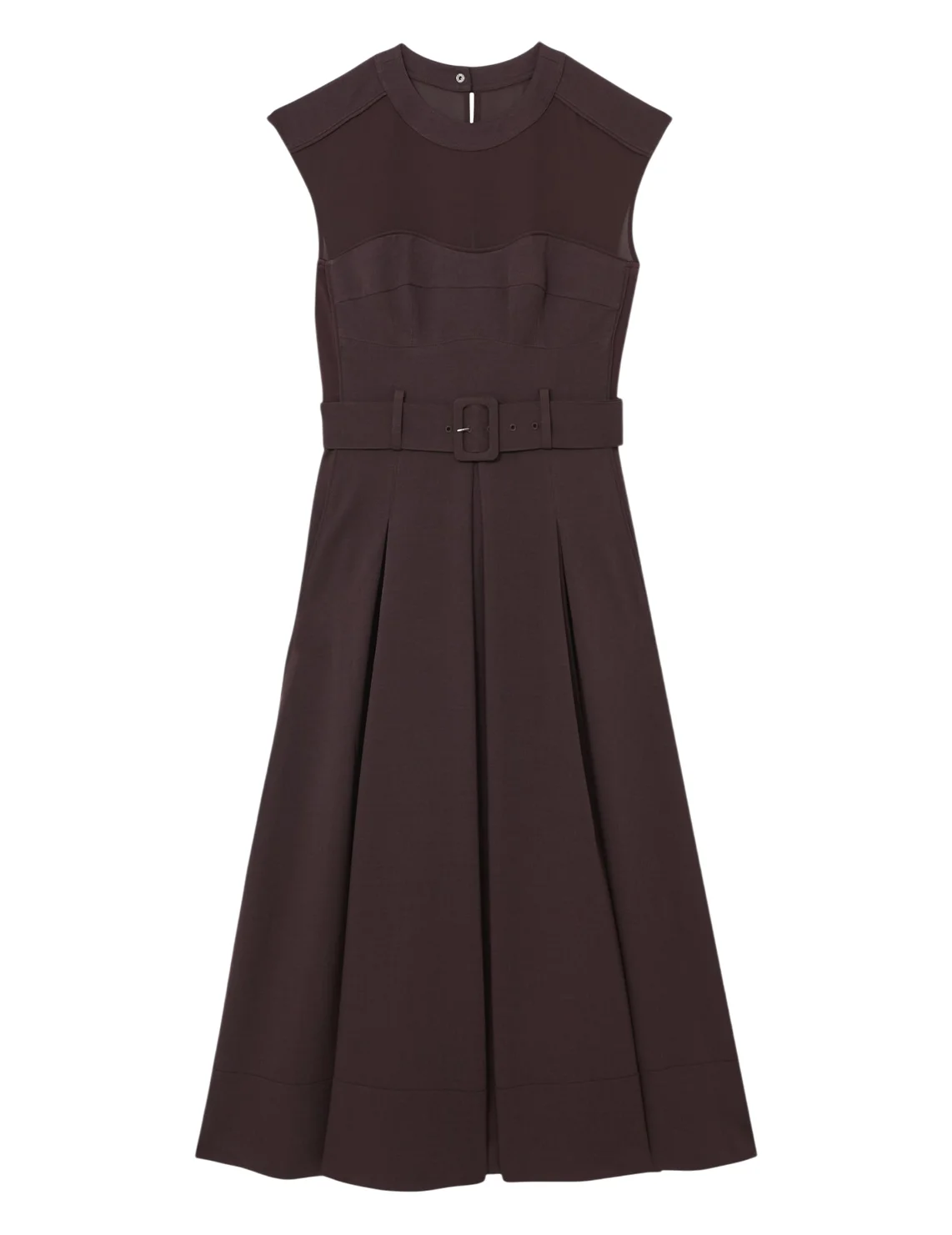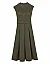 Сукня виготовлена з поліестеру та еластану. Модель довжини міді виконана в розкльошеному крої. Має круглий виріз горловини, прорізні кишені, шльовки для ременя, пояс у тон з пряжкою і застібку-блискавку з кнопкою ззаду. Декоровано складками та сітчастими вставками.