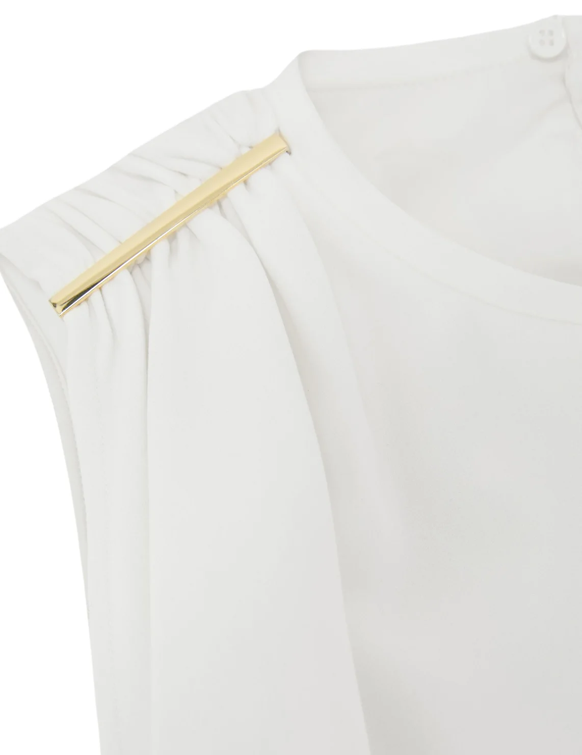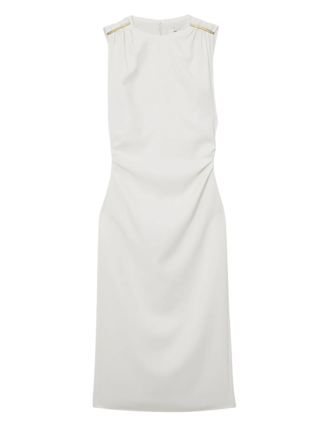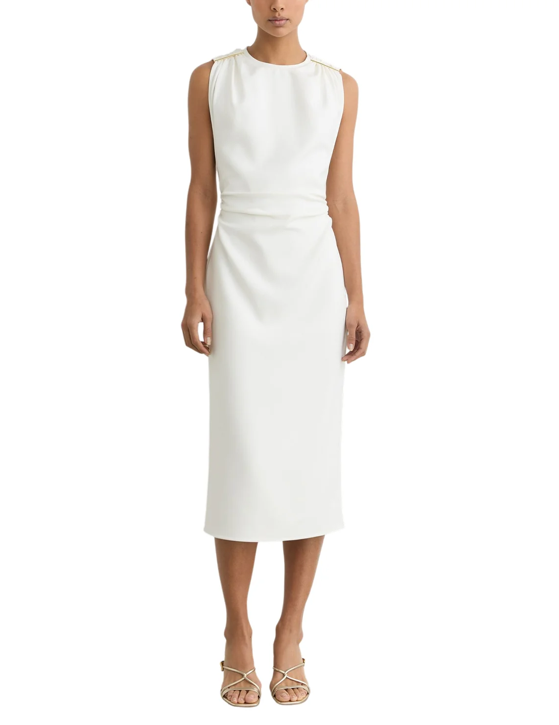 Сукня виготовлена з поліестеру, віскози та еластану. Модель довжини міді виконана в приталеному крої. Має круглий виріз горловини, застібку на ґудзику ззаду, розріз і приховану застібку на блискавці ззаду. Декорована золотистими елементами на плечах і складками.