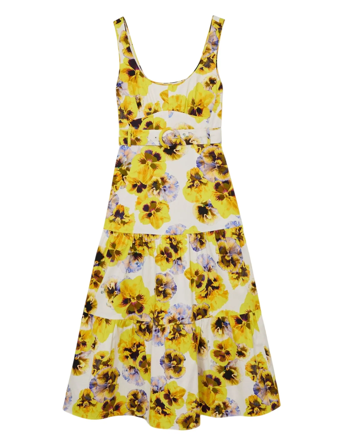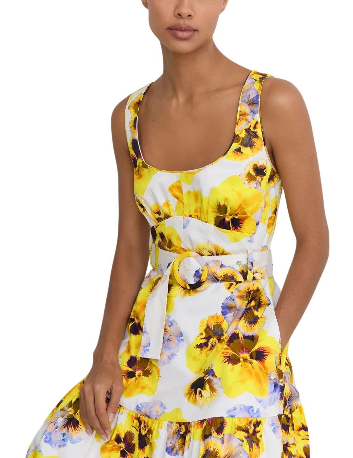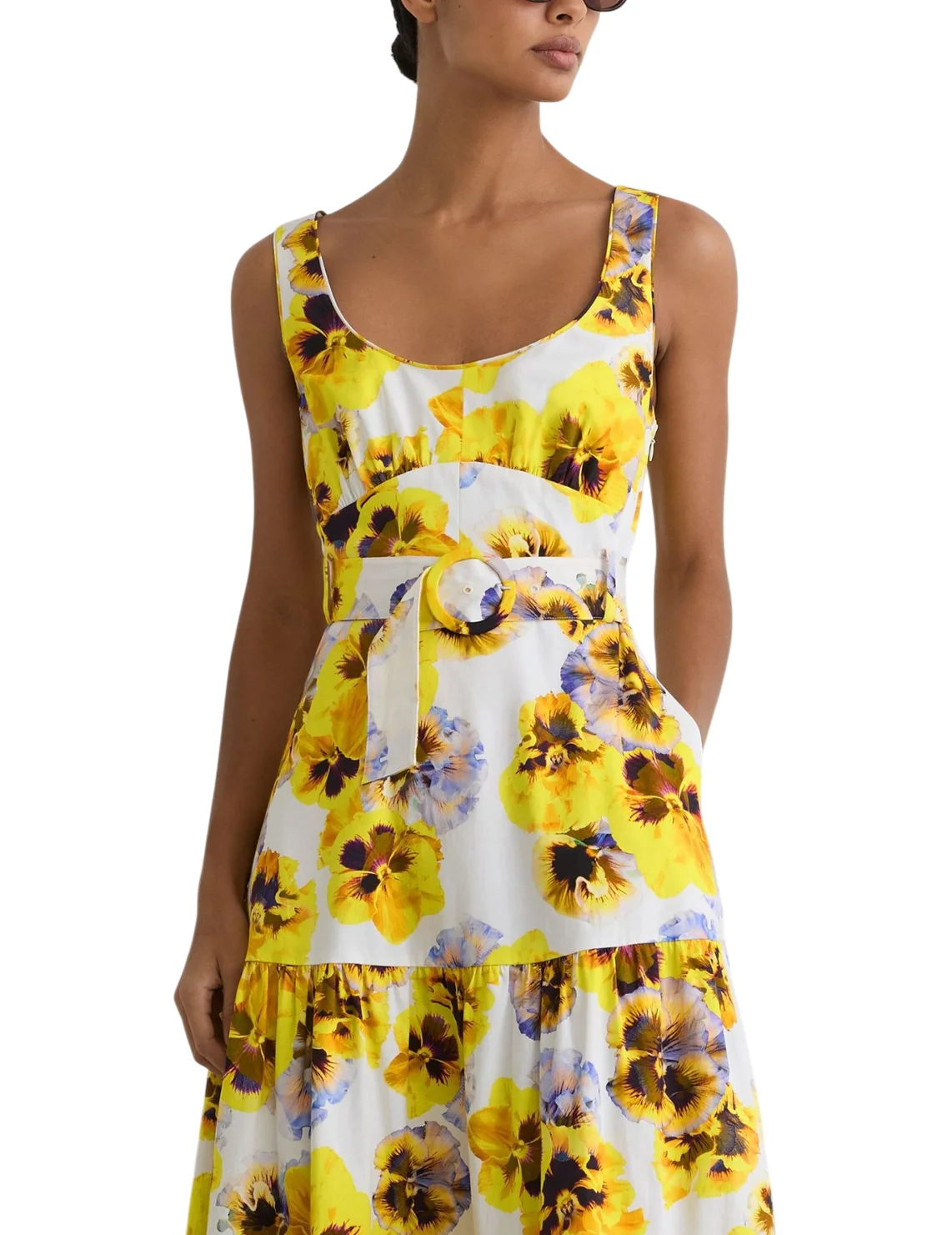 Сукня виготовлена з бавовни та еластану. Модель довжини міді в розкльошеному крої. Має широкі бретелі, бічні кишені, виріз на спині та приховану бічну застібку-блискавку. Виріб доповнює ремінь на пряжці в тон та квітковий принт.