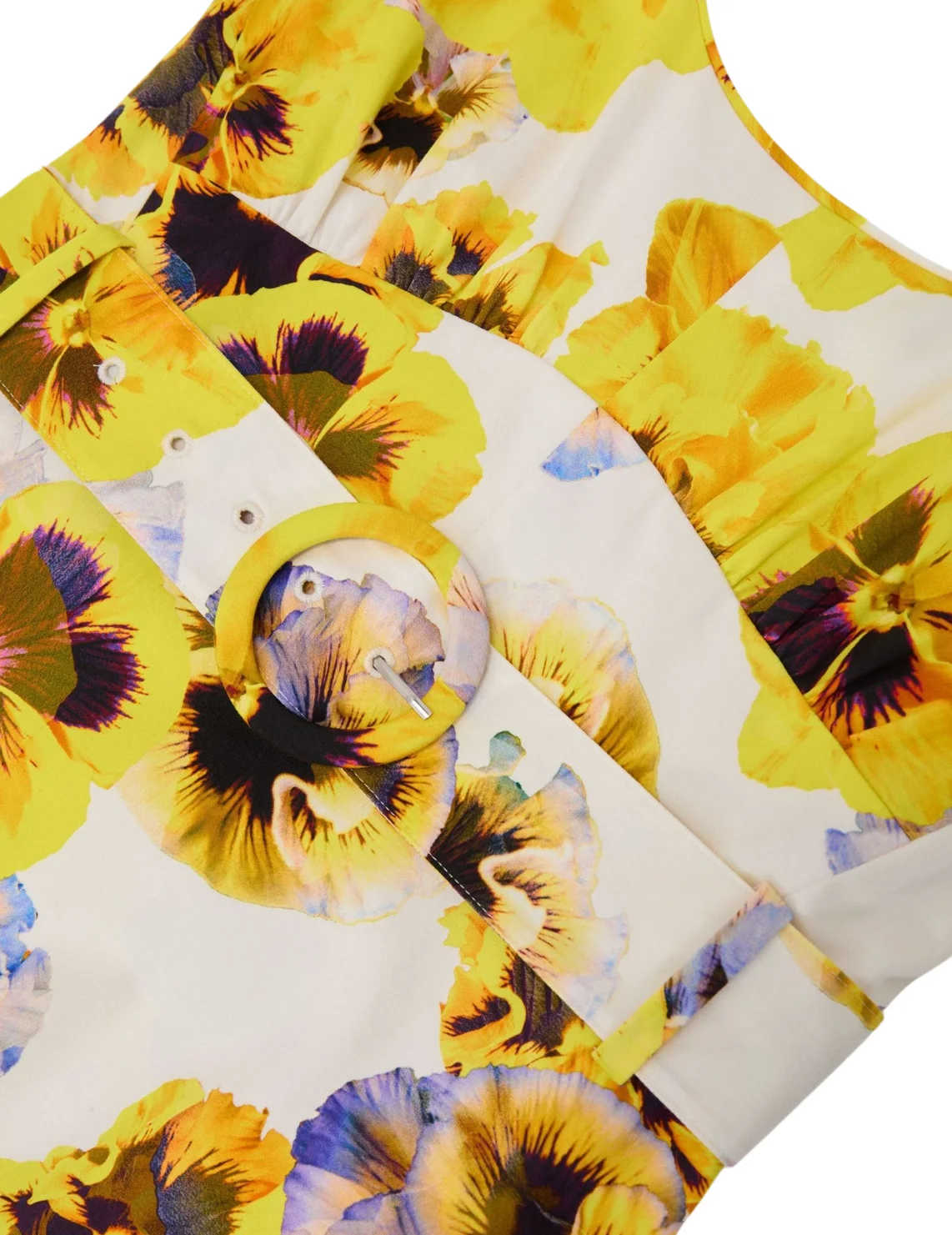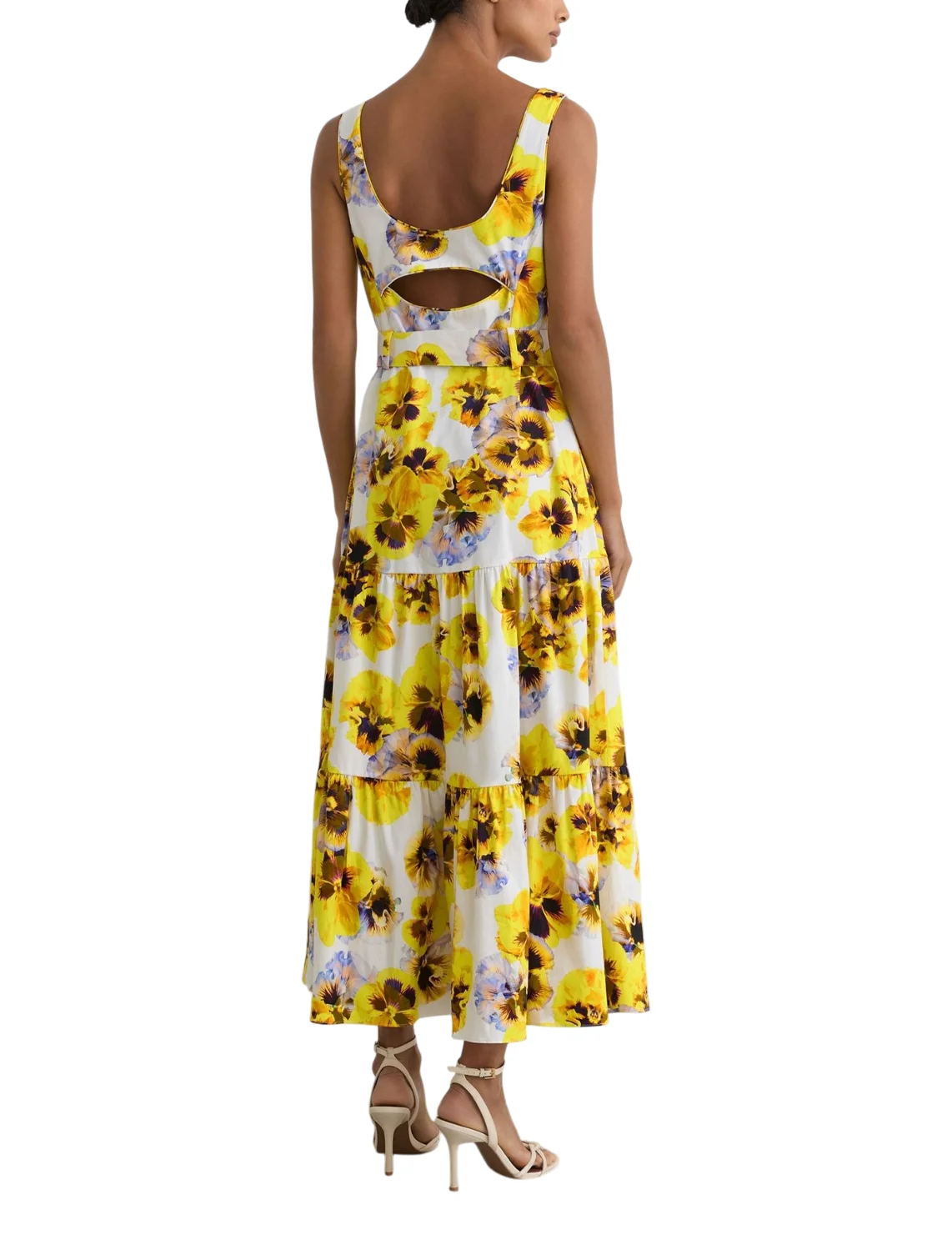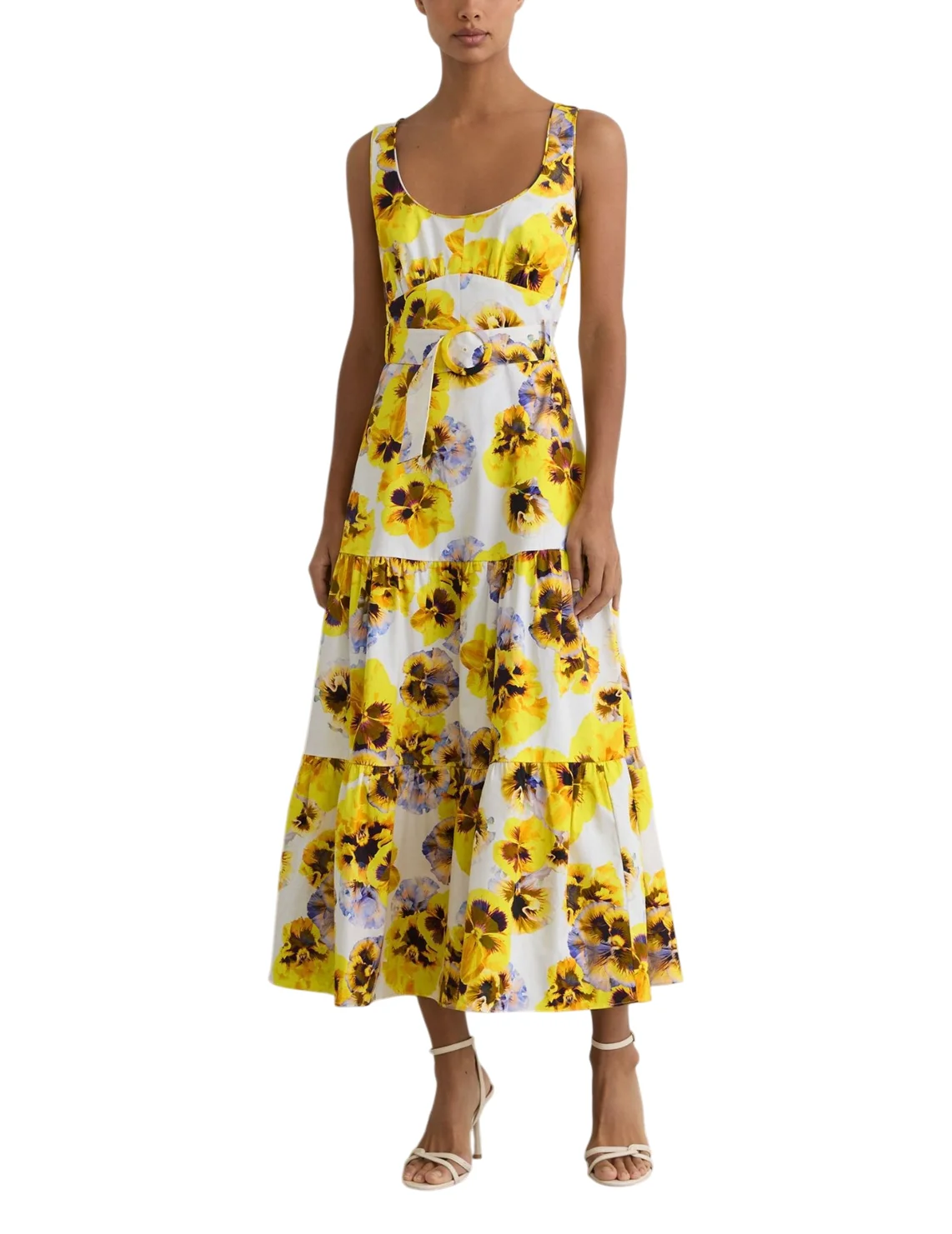 Сукня виготовлена з бавовни та еластану. Модель довжини міді в розкльошеному крої. Має широкі бретелі, бічні кишені, виріз на спині та приховану бічну застібку-блискавку. Виріб доповнює ремінь на пряжці в тон та квітковий принт.