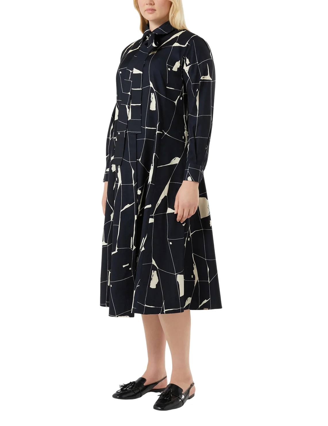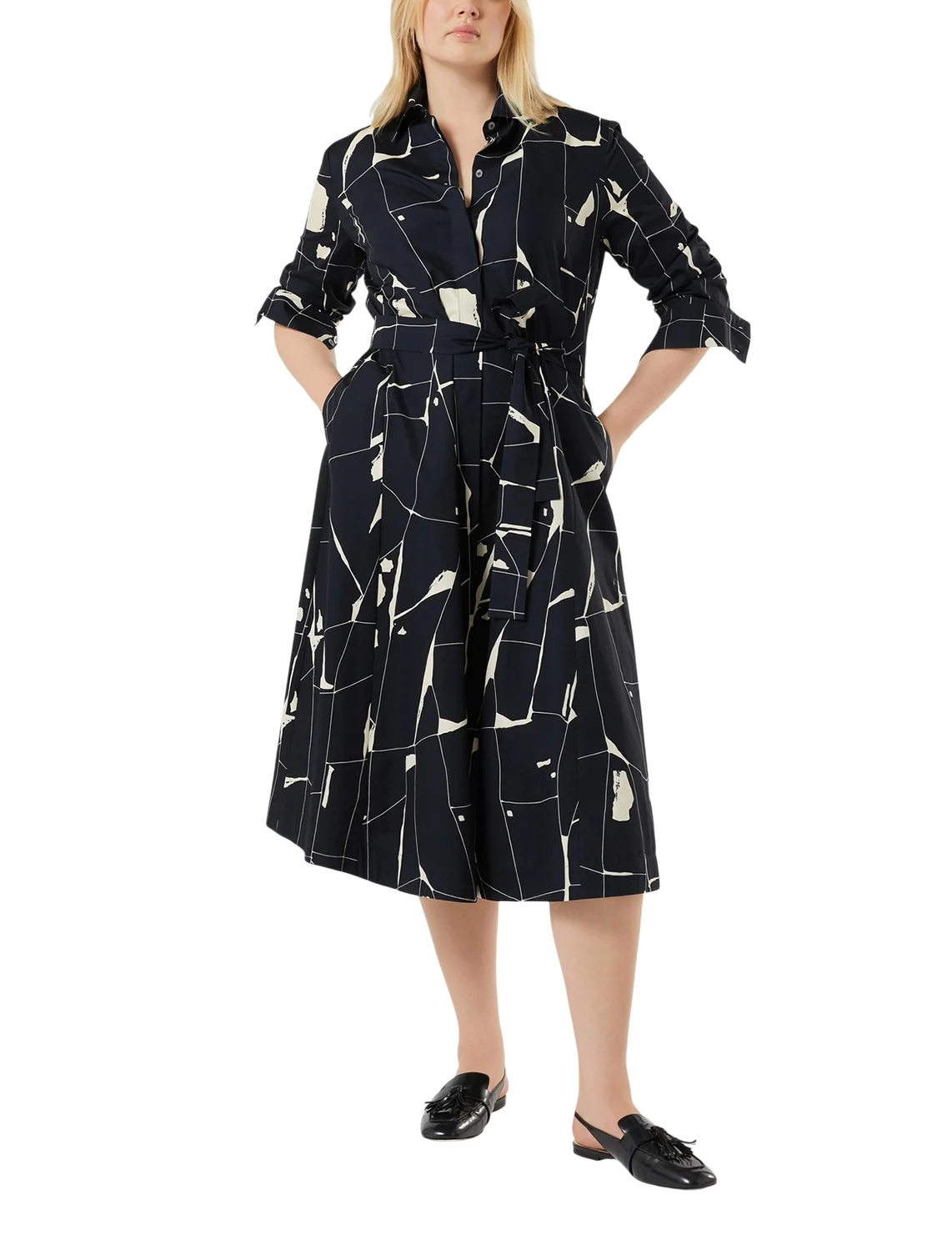 Сукня виготовлена зі 100% бавовни високої якості. Модель довжини міді виконана в розкльошеному крої. Має відкладний комір, приховану застібку на ґудзиках, прорізні кишені, пояс у тон і довгі рукави з манжетами. Декорована оригінальним принтом.