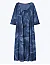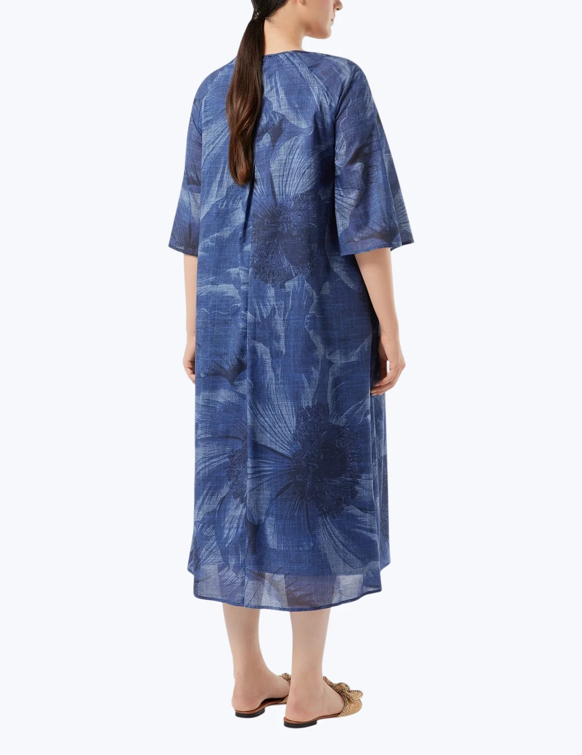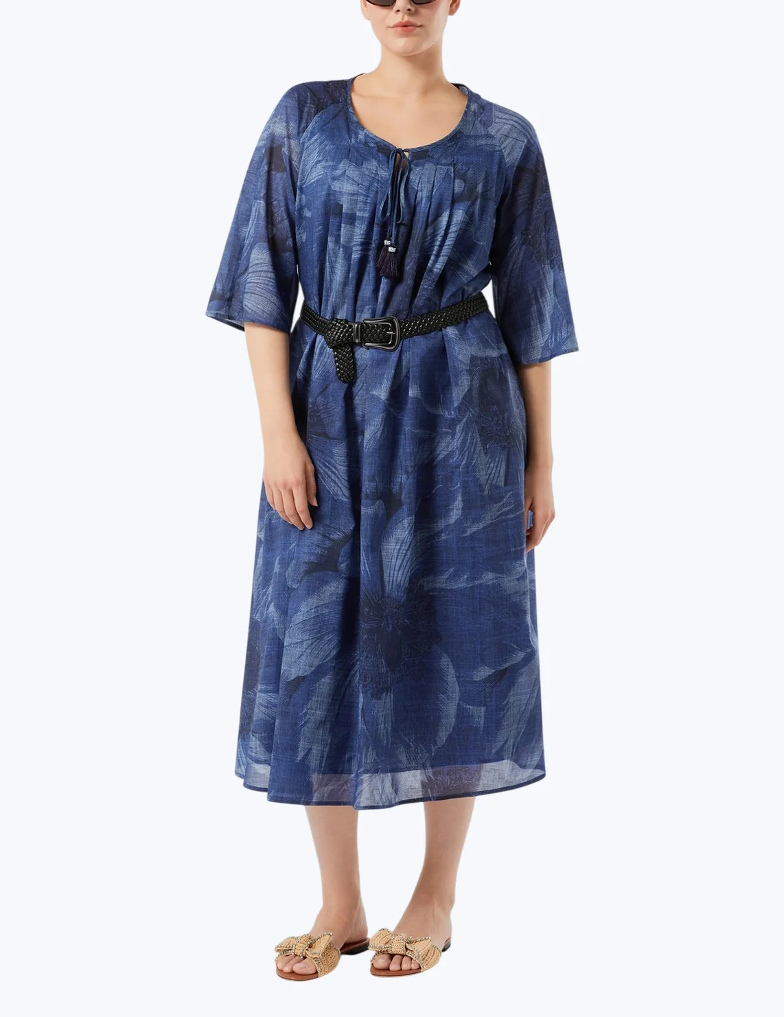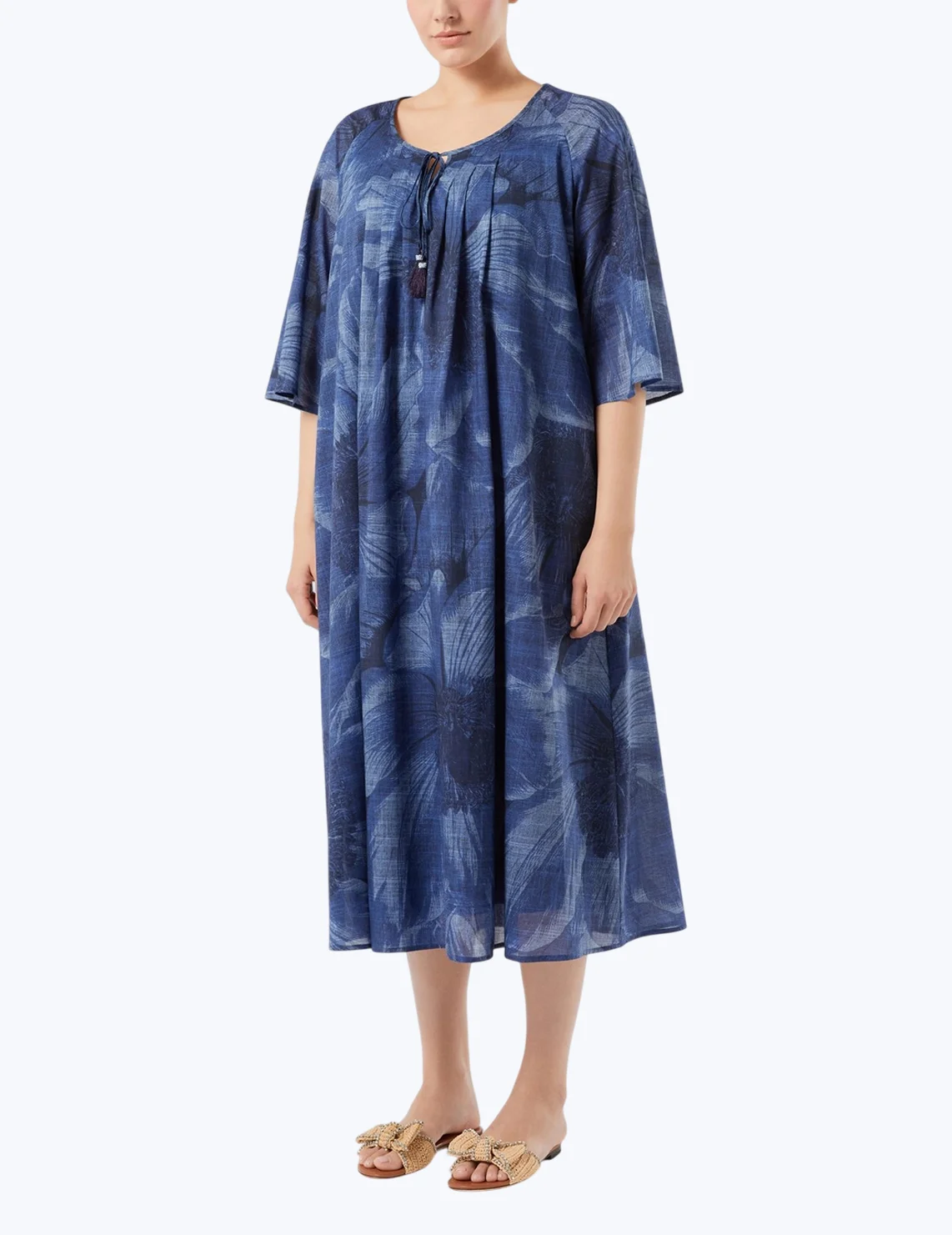 Сукня виготовлена із 100% бавовни. Модель довжини міді виконана у розкльошеному крої. Має круглий виріз горловини, шнурок із китицями, рукави довжиною 3/4 та декорована квітковим принтом.
