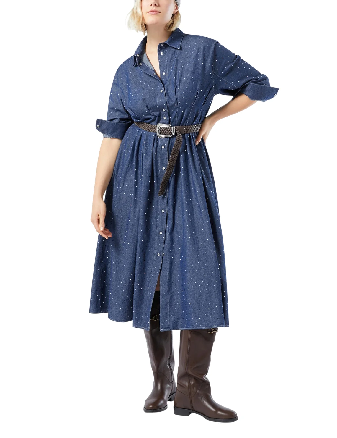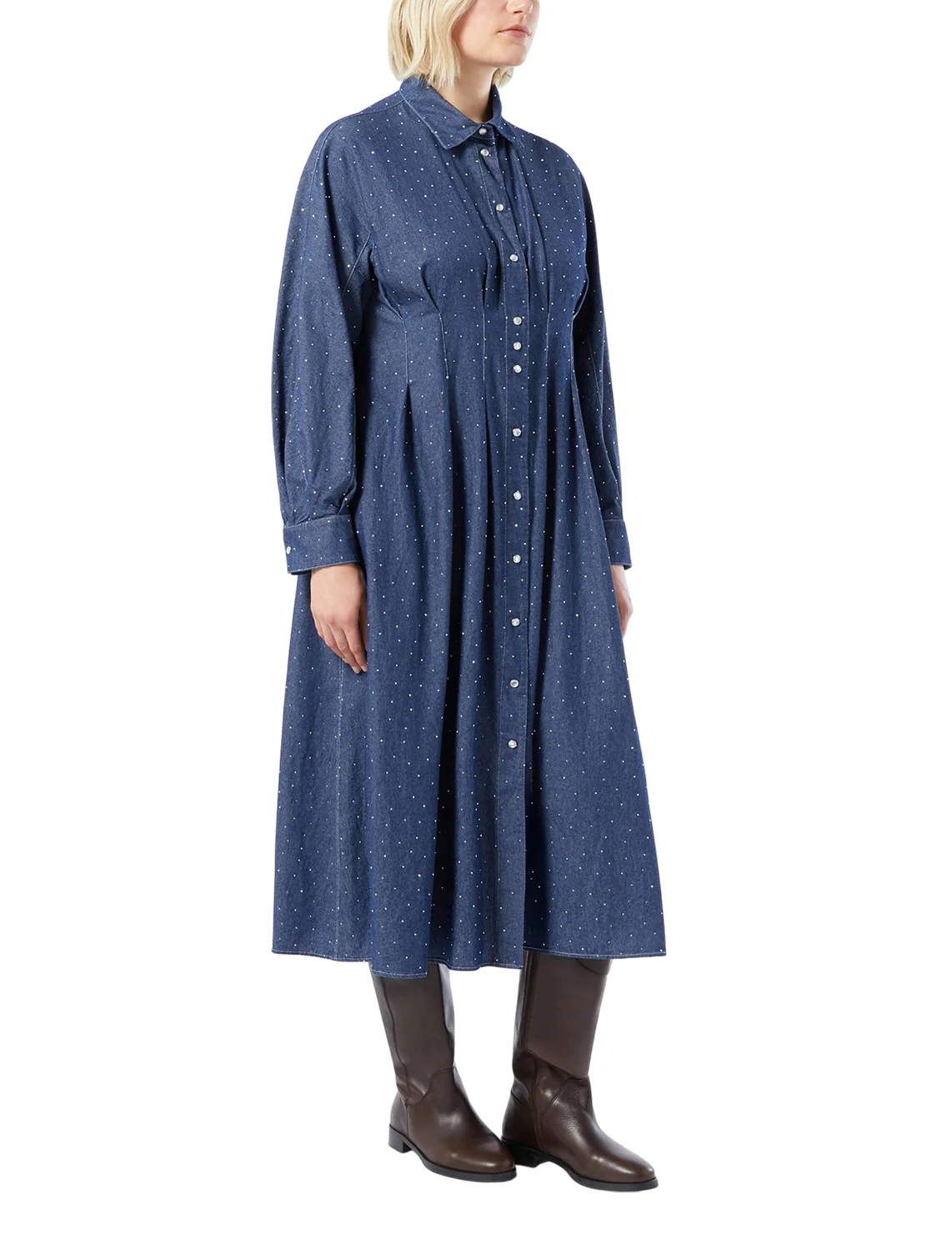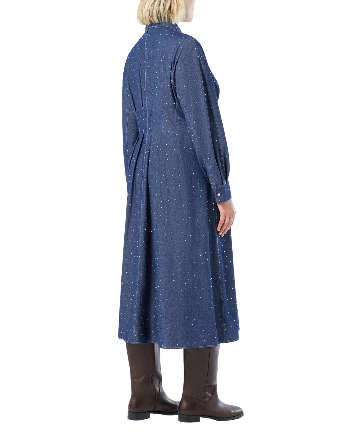 Сукня виготовлена зі 100% бавовни високої якості. Модель довжини міді виконана в розкльошеному крої. Має відкладний комір, застібку на кнопках, прорізні кишені та довгі рукави з манжетами. Декорована стразами.