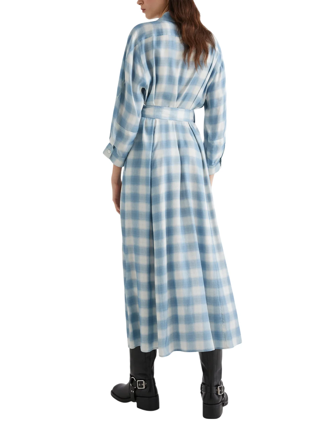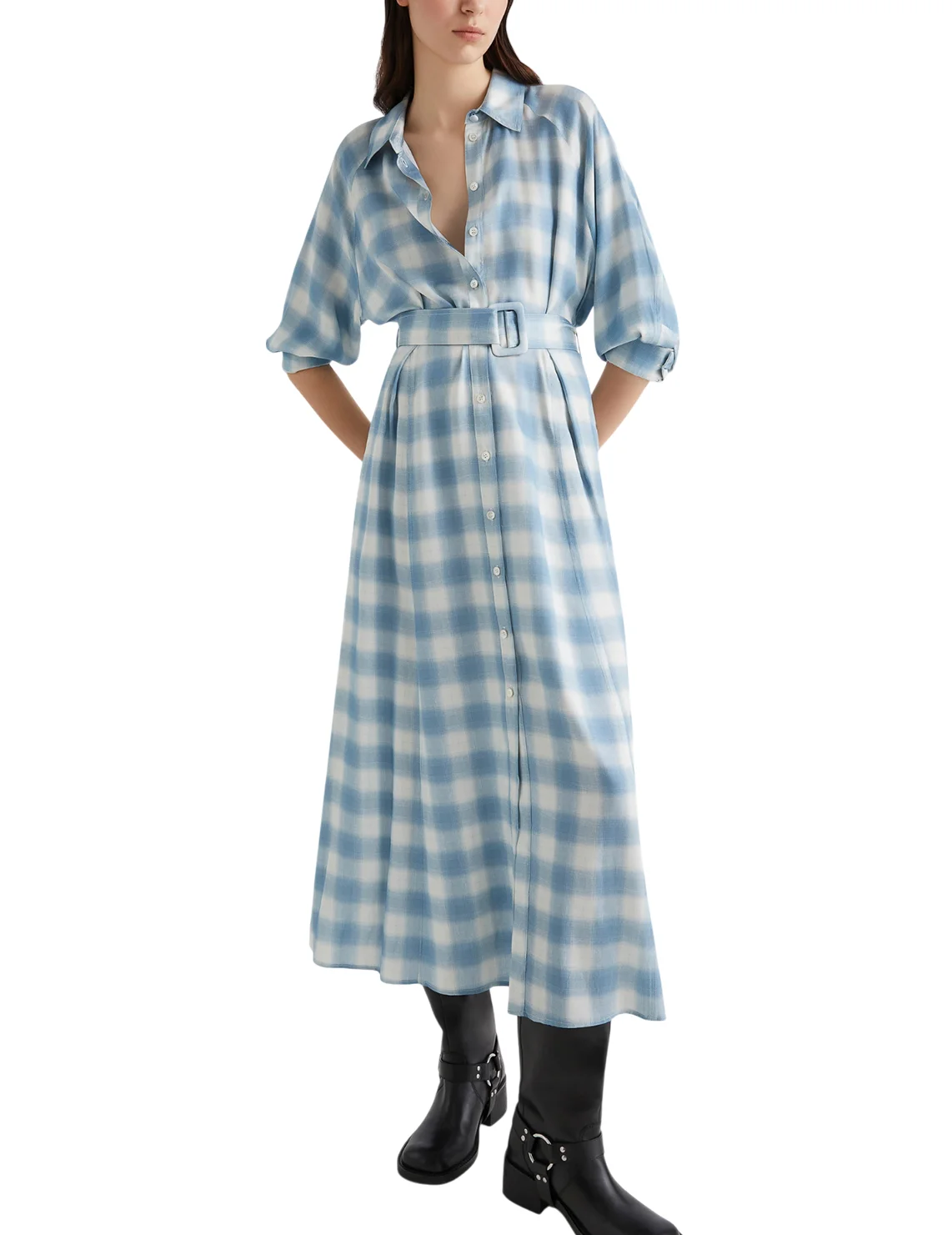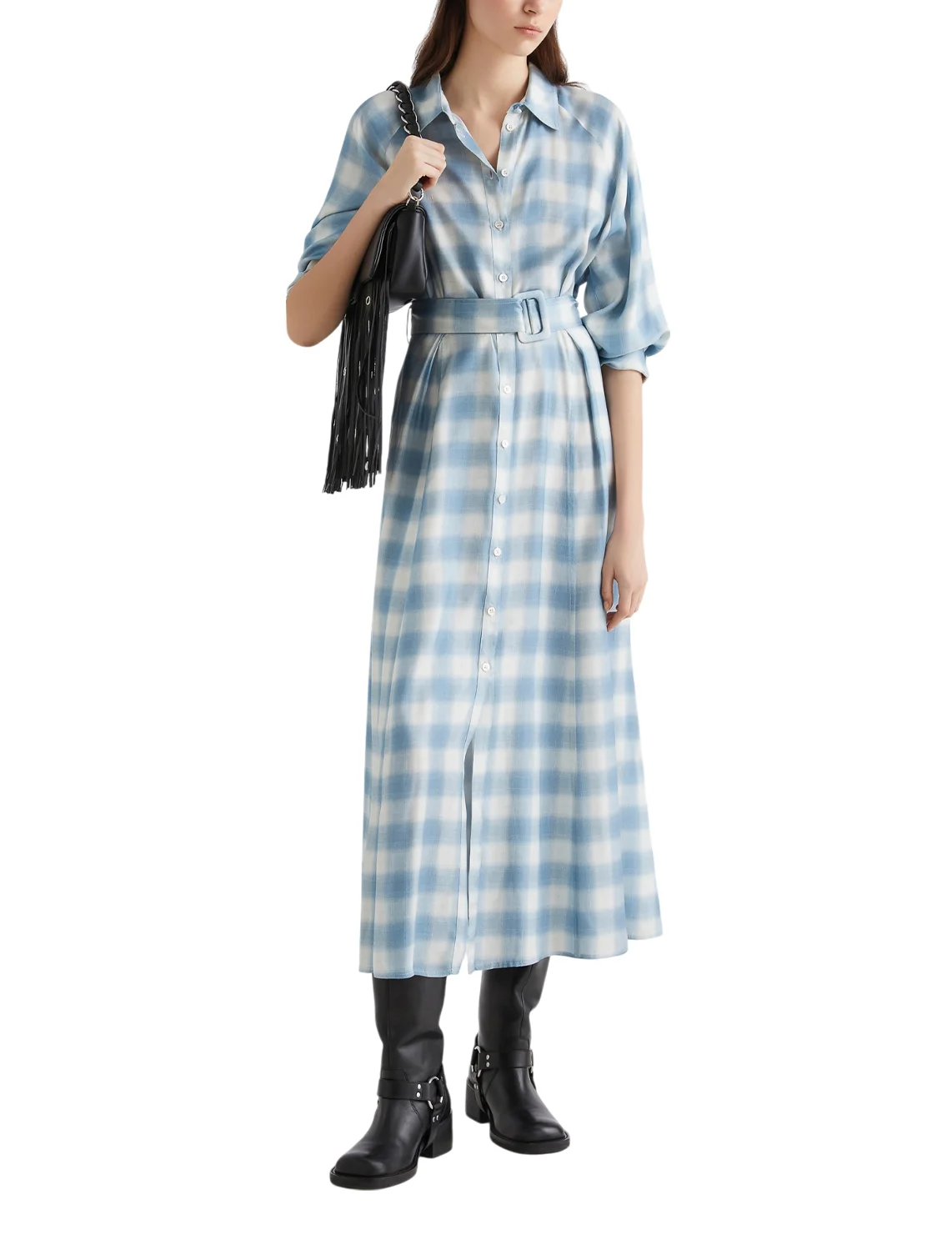 Сукня виготовлена зі 100% віскози високої якості. Модель довжини міді виконана в розкльошеному крої. Має відкладний комір, планку на ґудзиках, прорізні кишені, пояс у тон і рукави довжиною 3/4 з манжетами. Декорована принтом у клітинку.