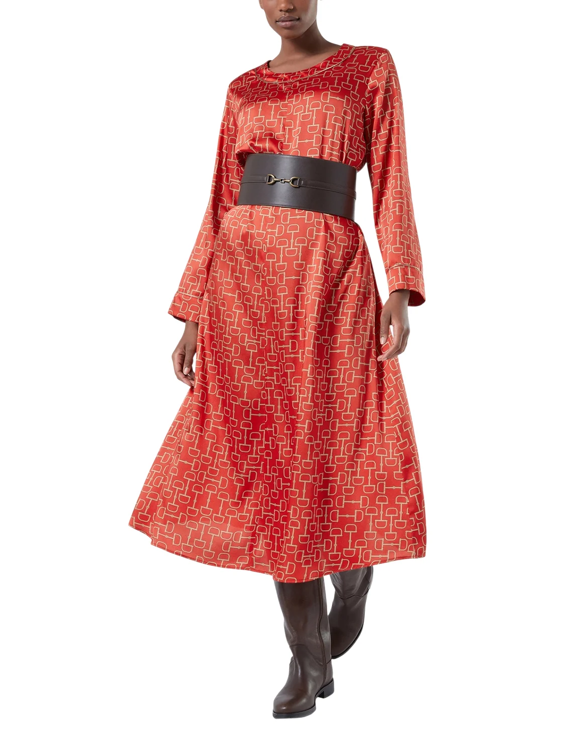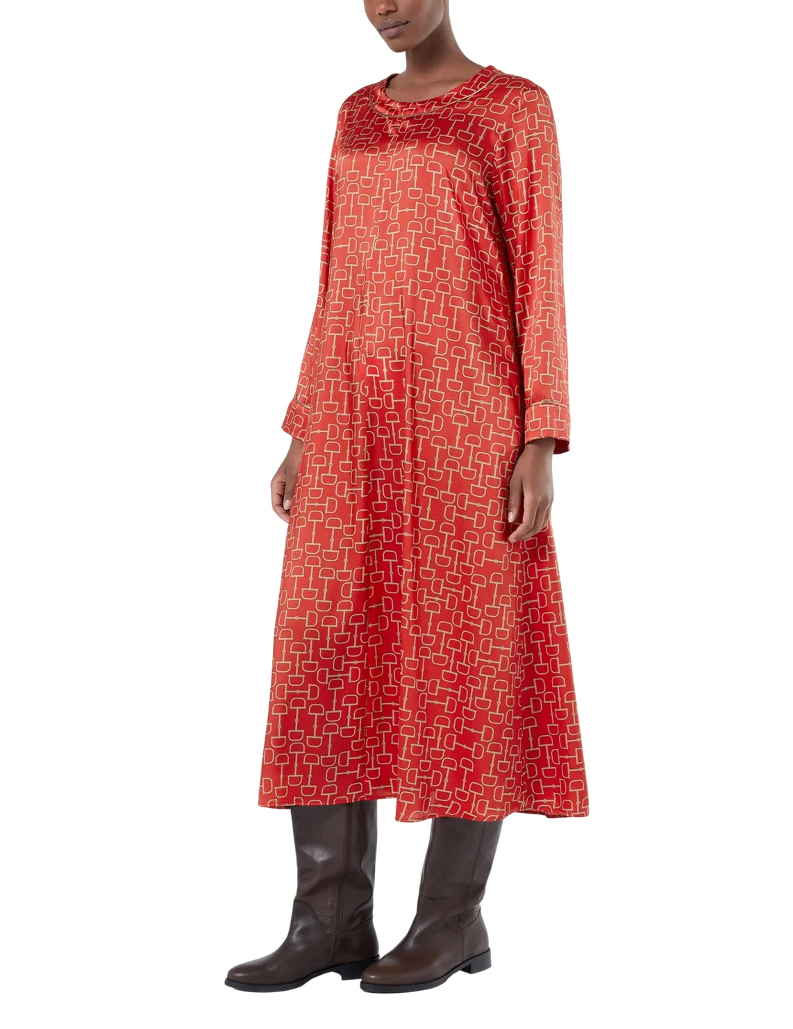 Сукня виготовлена зі 100% поліестеру високої якості. Модель довжини міді виконана в розкльошеному крої. Має круглий виріз горловини із застібкою на ґудзиках ззаду, прорізні кишені та довгі рукави. Декорована оригінальним принтом.