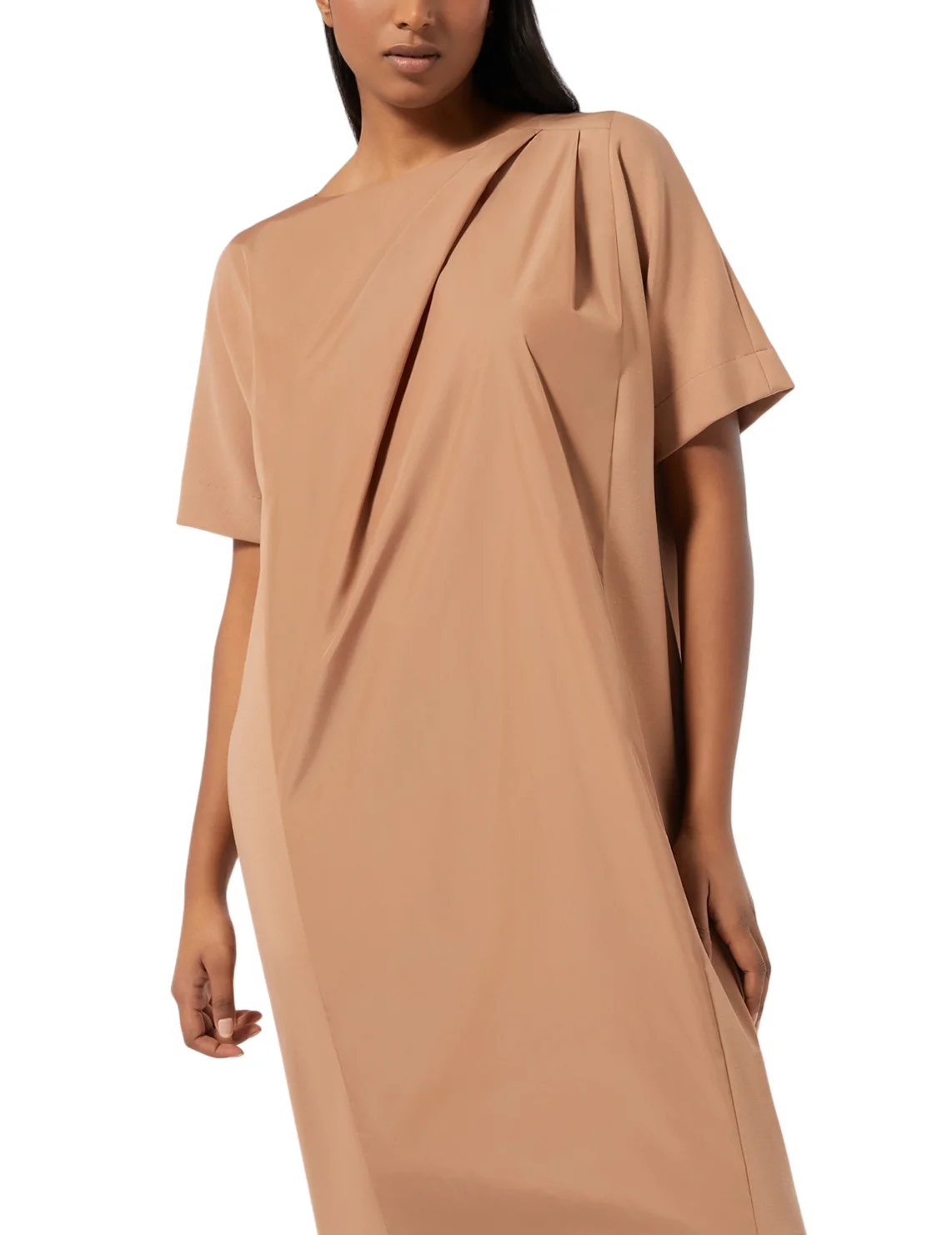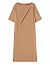 Сукня виготовлена з поліаміду, віскози та еластану. Модель довжини міді виконана в прямому крої. Має круглий виріз горловини, короткі рукави та приховану застібку-блискавку ззаду. Декорована складками.