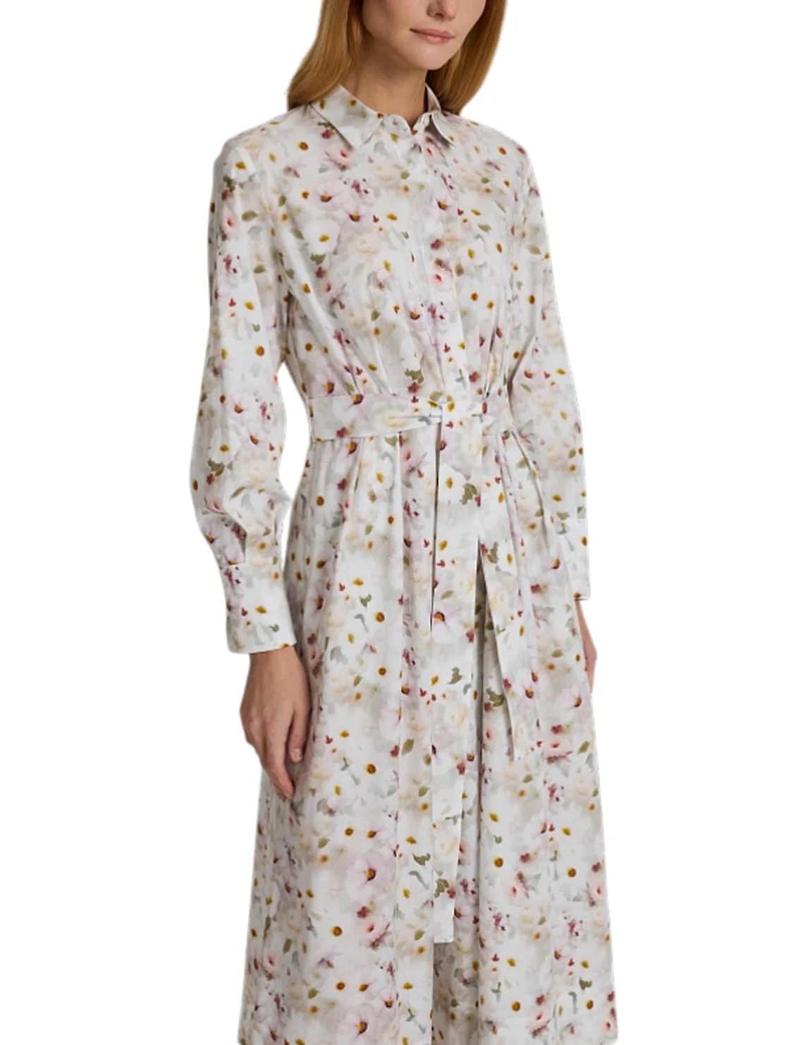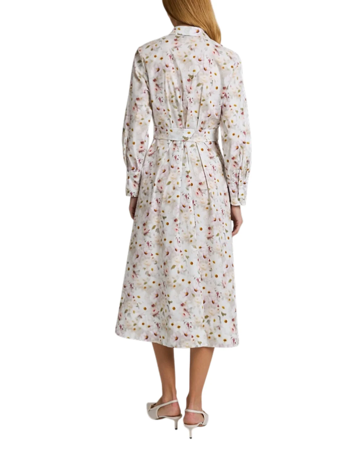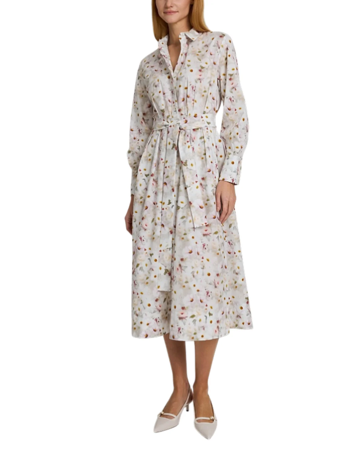Сукня виготовлена з бавовни та еластану. Модель довжини міді виконана в розкльошеному крої. Має відкладний комір, застібку на ґудзиках, пояс у тон і довгі рукави з манжетами. Декорована квітковим принтом.