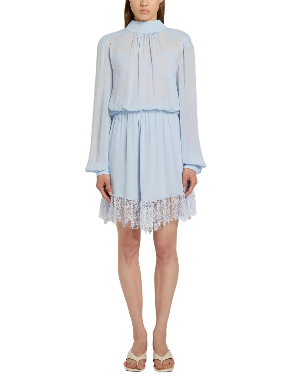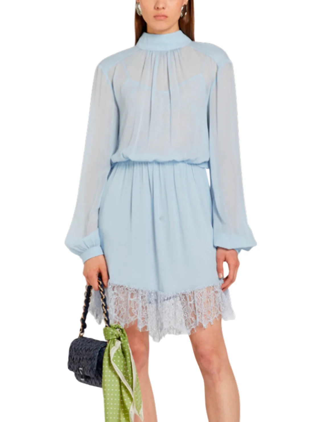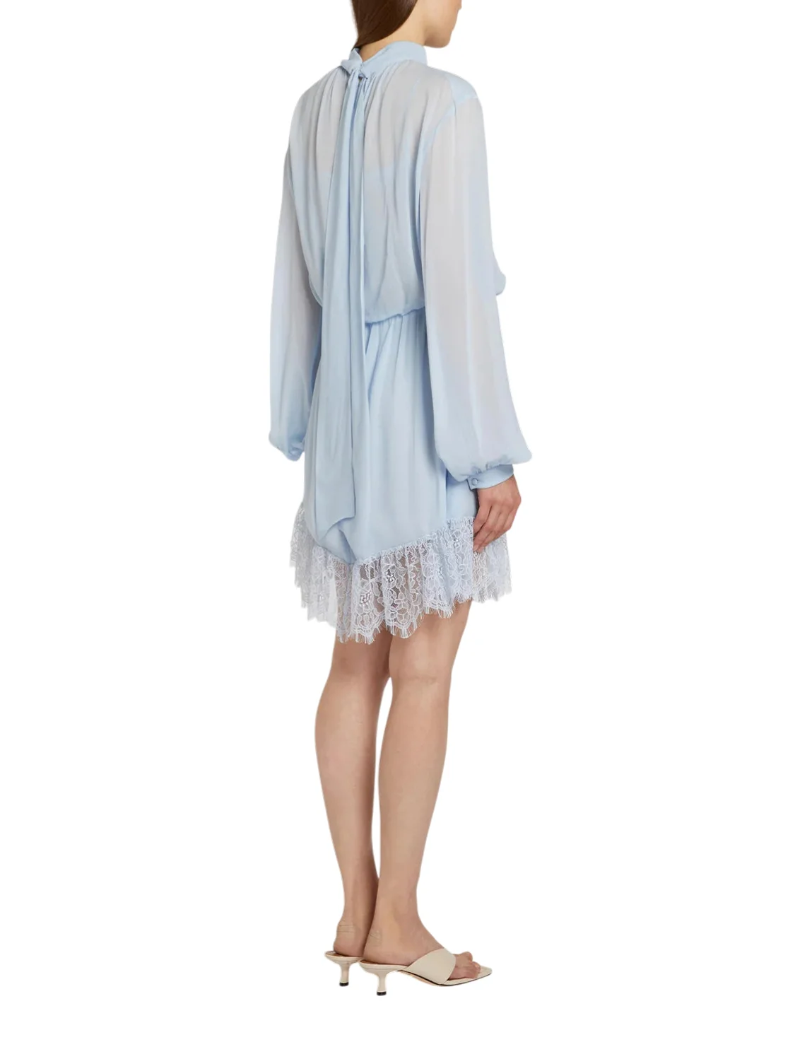 Сукня виготовлена зі 100% віскози, підкладка і мереживо з поліаміду. Модель довжини міні виконана в розкльошеному крої. Має комір-стійку із зав'язками та довгі рукави з манжетами. Декорована мереживом.