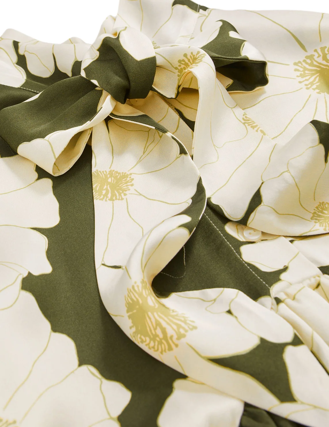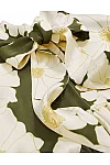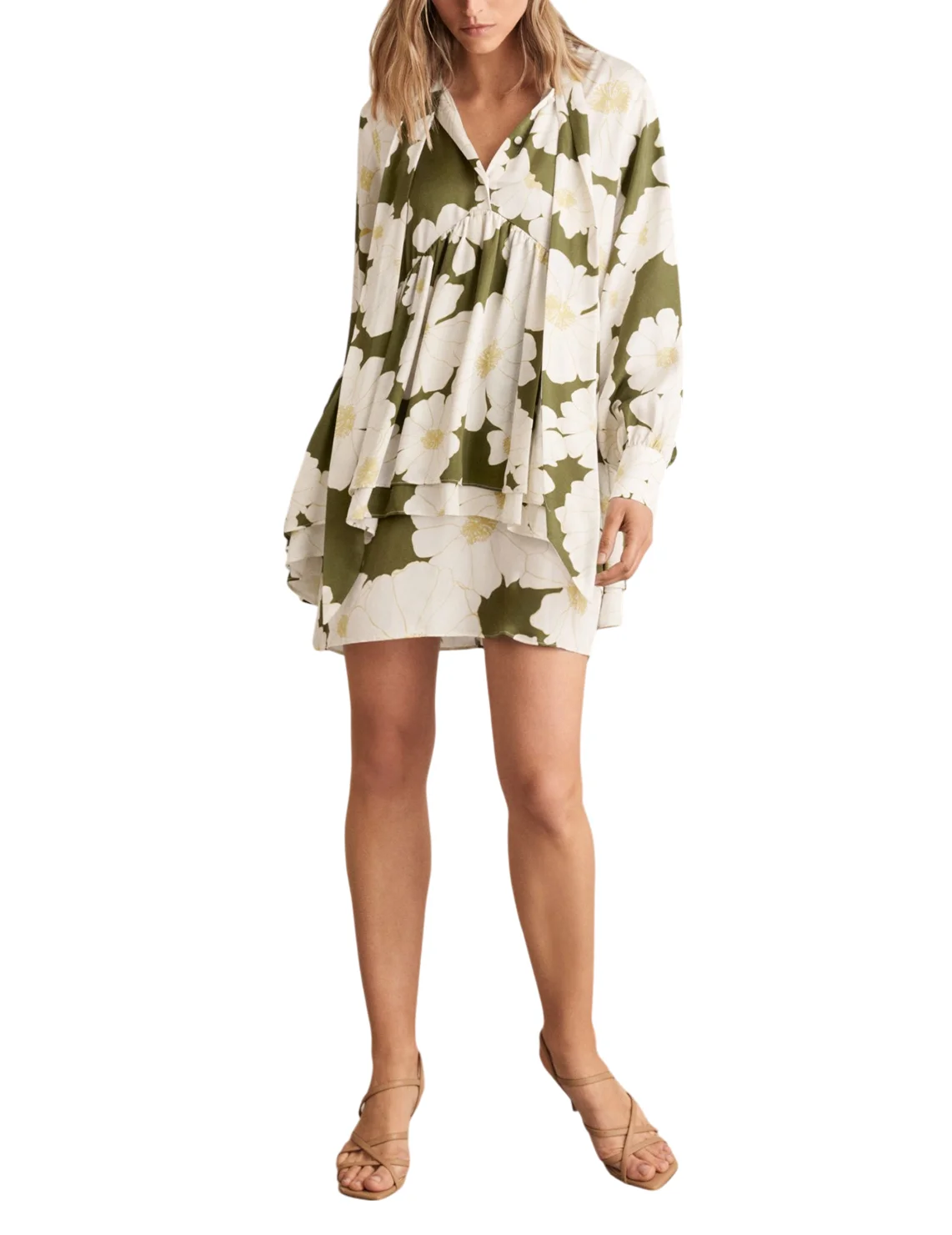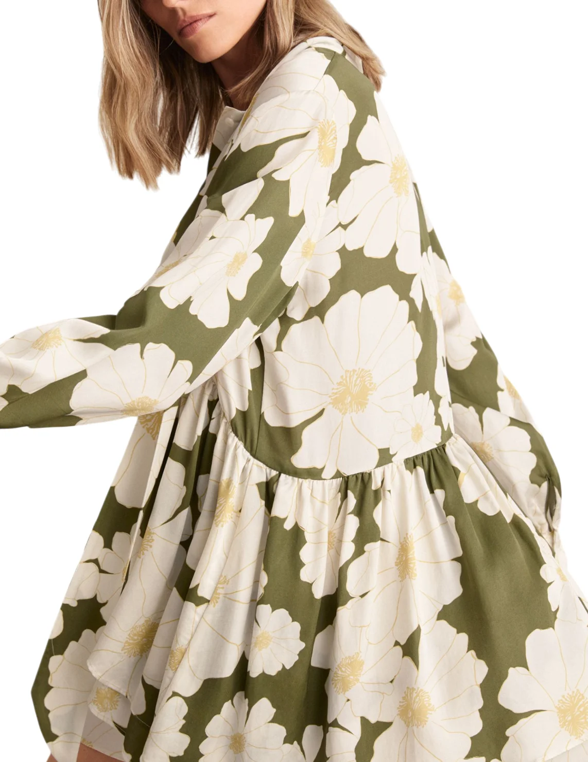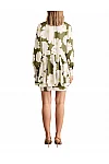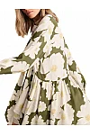 Сукня виготовлена зі 100% бавовни високої якості. Модель довжини міні виконана в розкльошеному крої. Має комір-стійку із зав'язками, потайну планку з ґудзиками, багатошаровий дизайн і довгі рукави з манжетами. Декорована квітковим принтом.