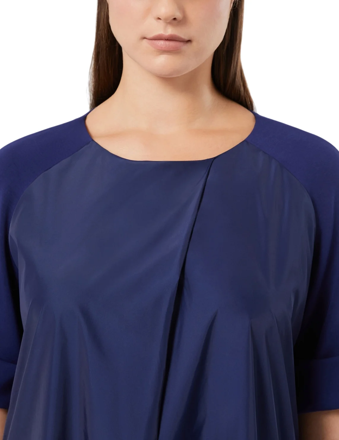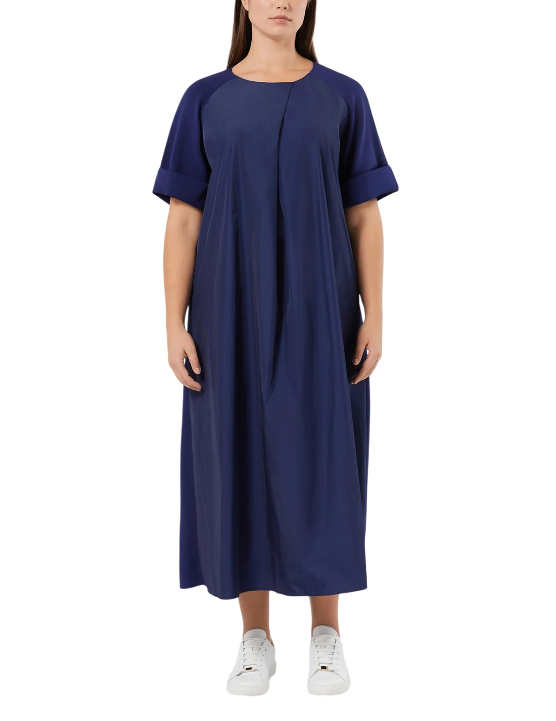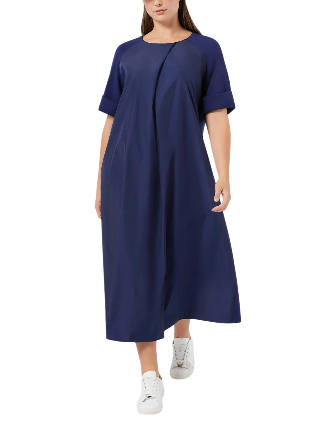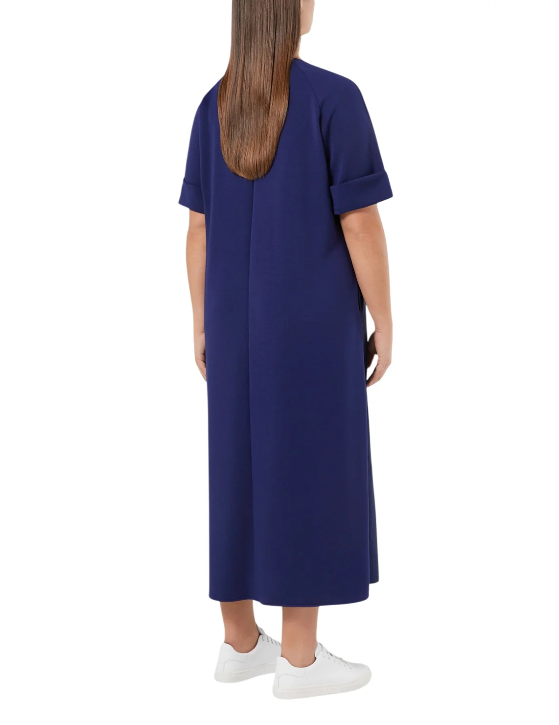 Сукня виготовлена з поліаміду, віскози та еластану. Модель довжини міді виконана в розкльошеному крої. Має круглий виріз горловини, прорізні кишені, короткі рукави з вилогами і приховану застібку-блискавку ззаду.