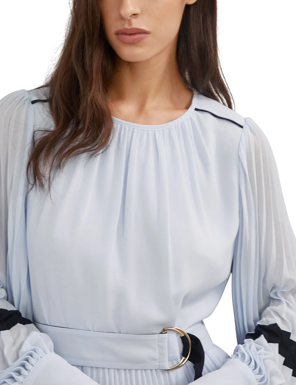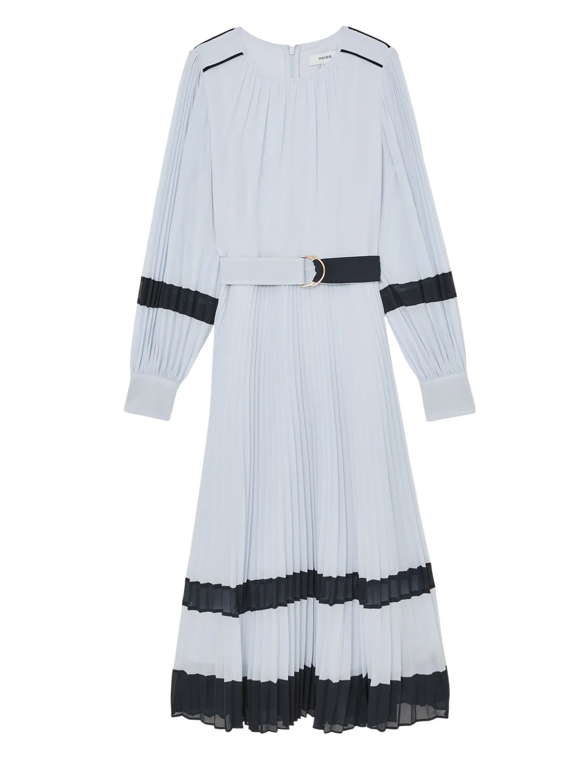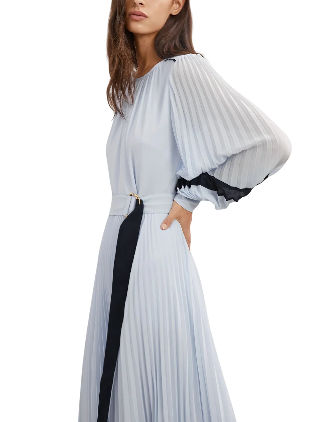 Сукня виготовлена зі 100% поліестеру. Модель довжини міді виконана в розкльошеному крої. Має круглий виріз горловини, застібку на блискавці ззаду, пояс у тон із пряжкою та довгі рукави з манжетами. Декорована плісируванням і принтом у смужку.