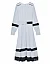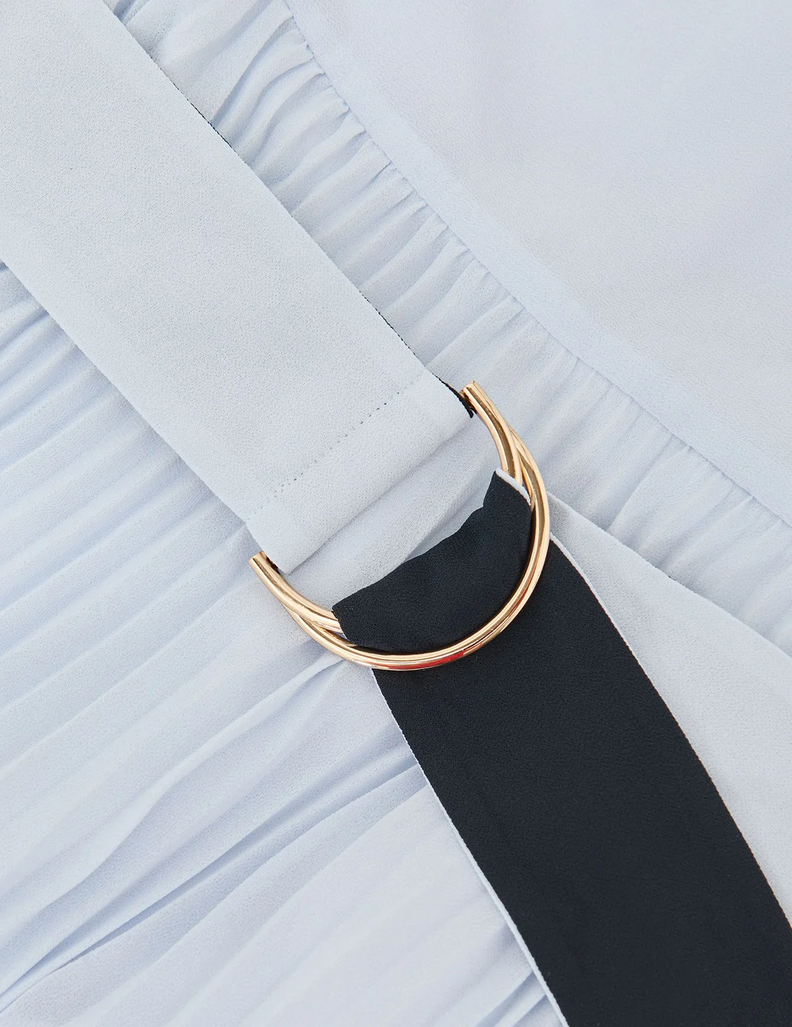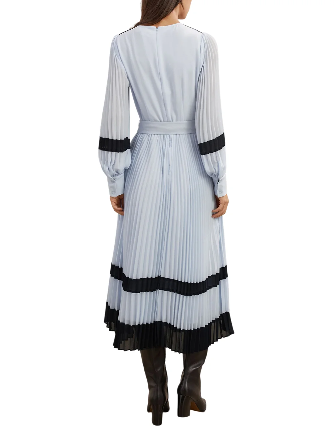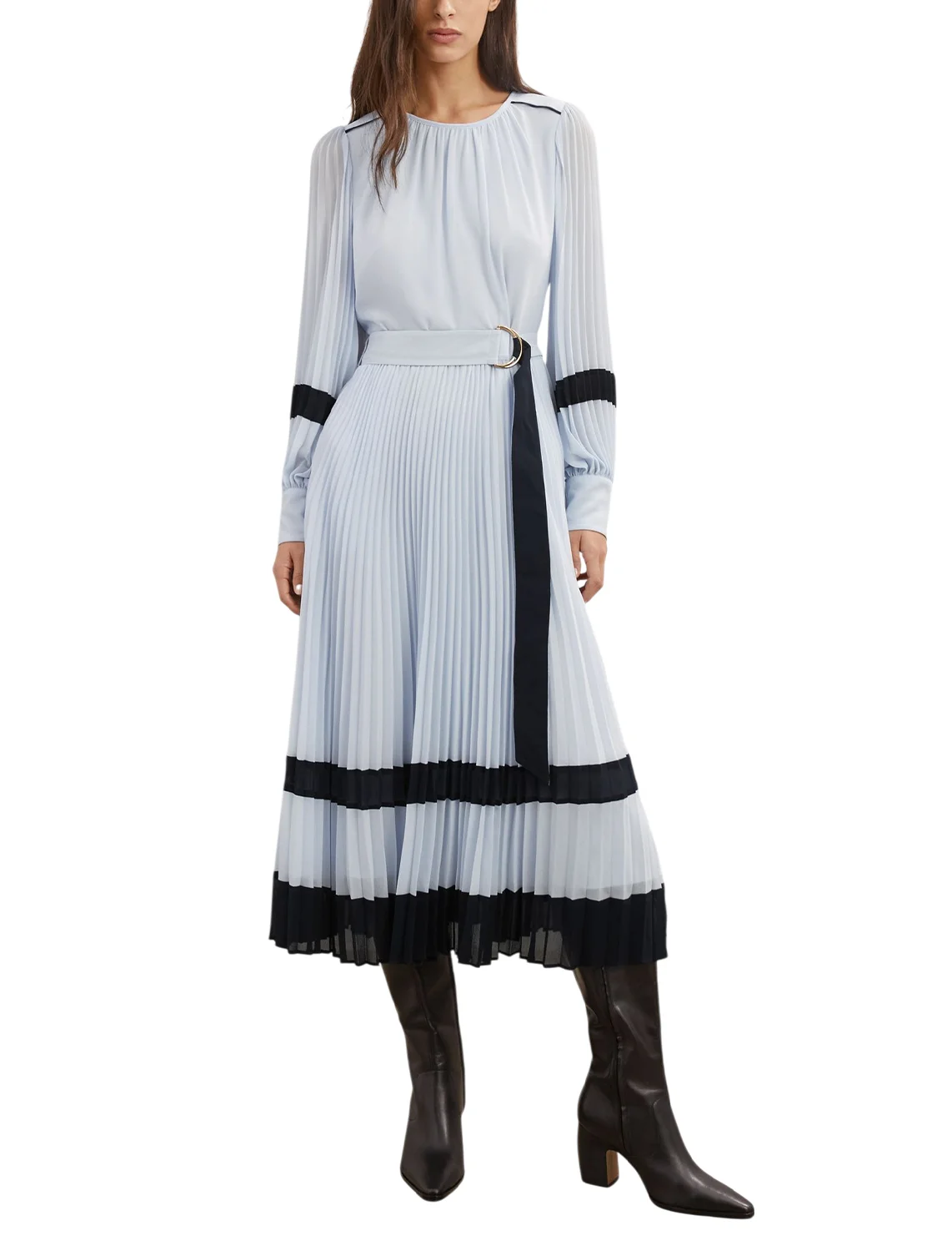 Сукня виготовлена зі 100% поліестеру. Модель довжини міді виконана в розкльошеному крої. Має круглий виріз горловини, застібку на блискавці ззаду, пояс у тон із пряжкою та довгі рукави з манжетами. Декорована плісируванням і принтом у смужку.