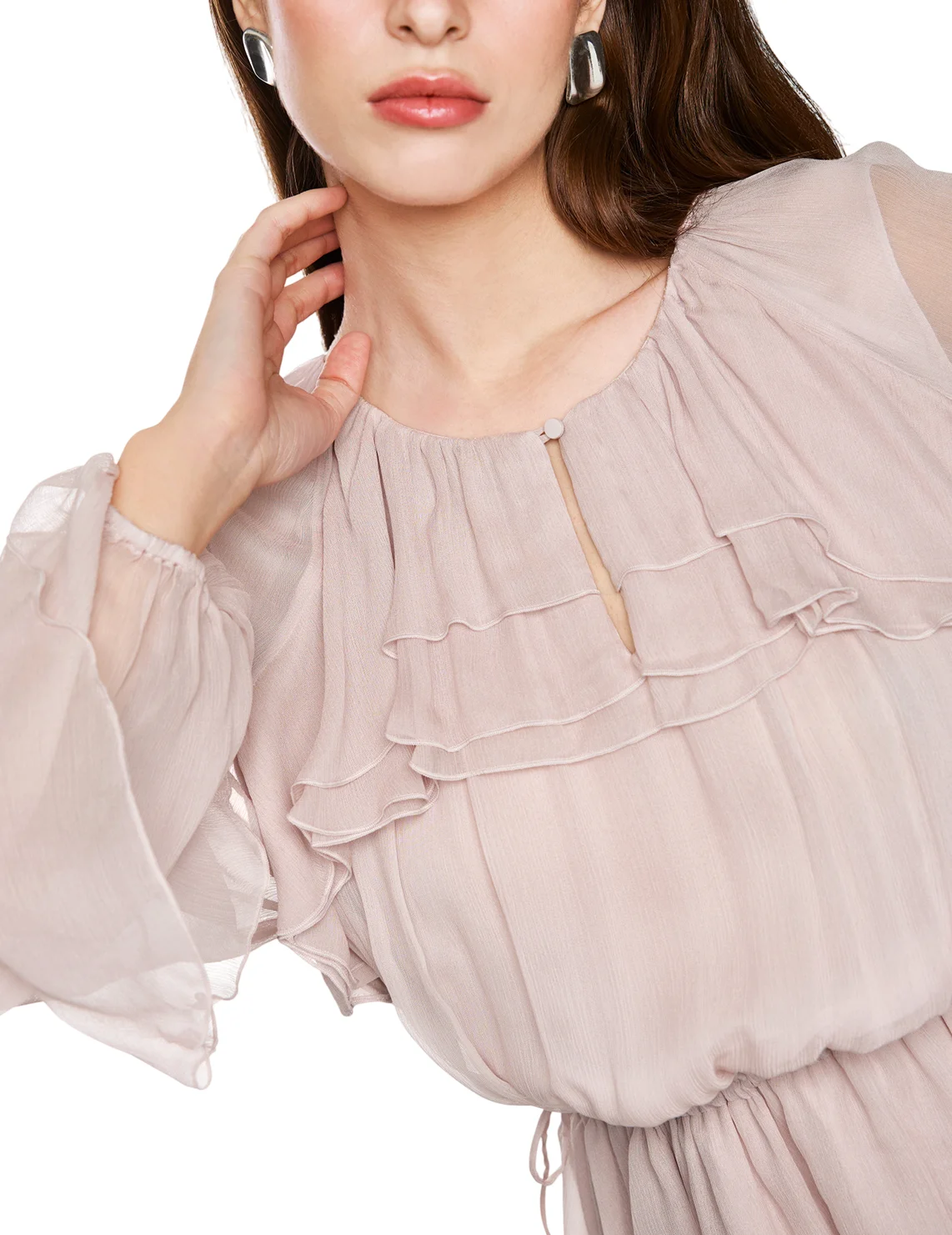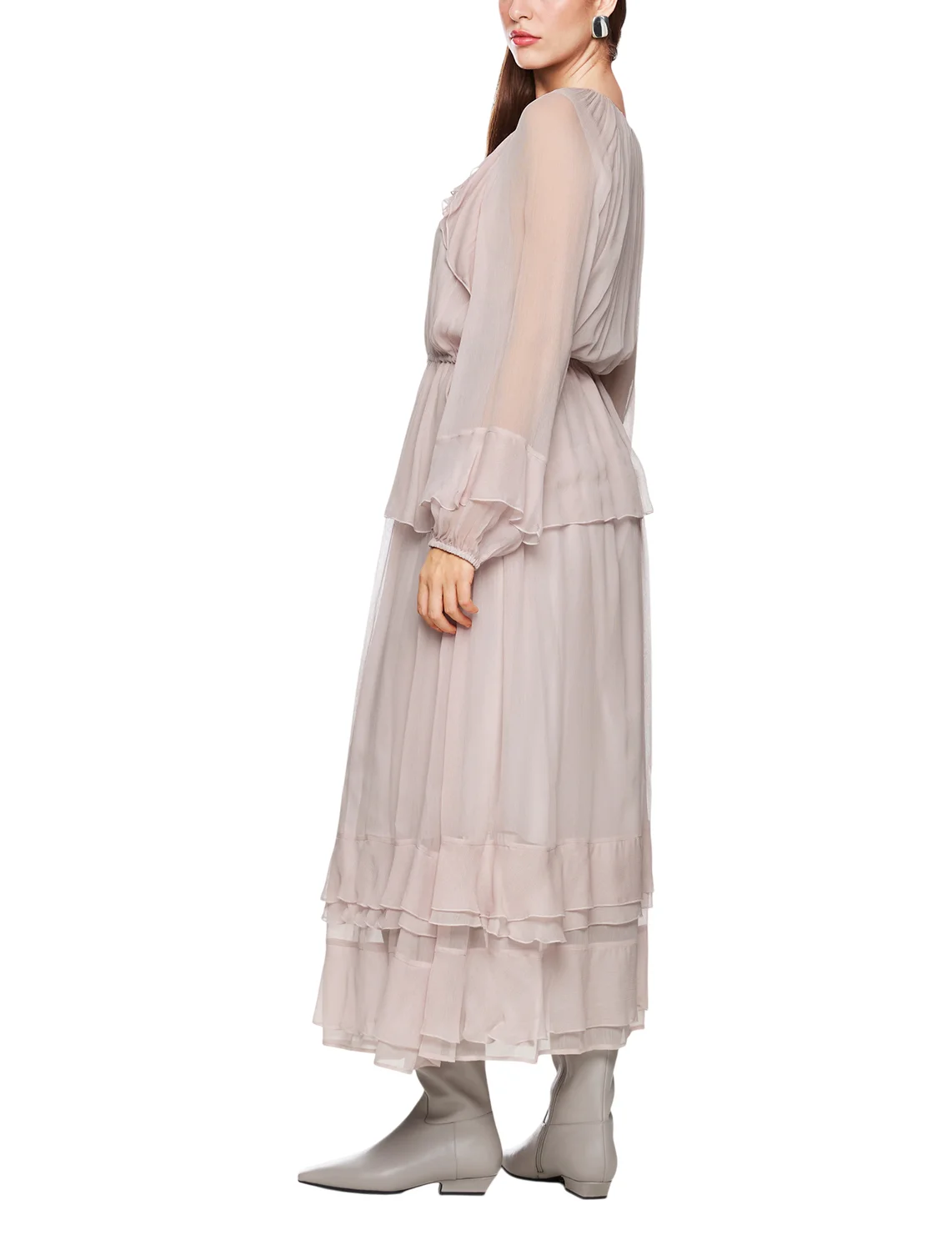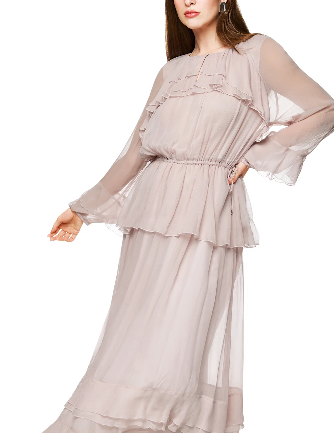 Сукня виготовлена з віскози, підкладка з поліестеру. Модель довжини максі виконана в розкльошеному крої. Має круглий виріз горловини із застібкою на ґудзик, куліску на талії та довгі рукави з манжетами. Декорована воланами.
