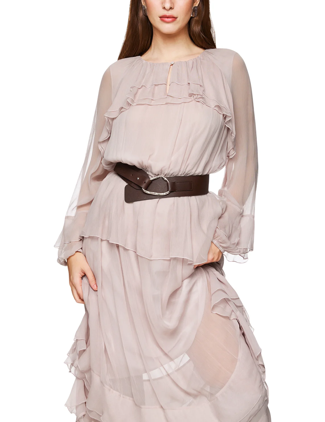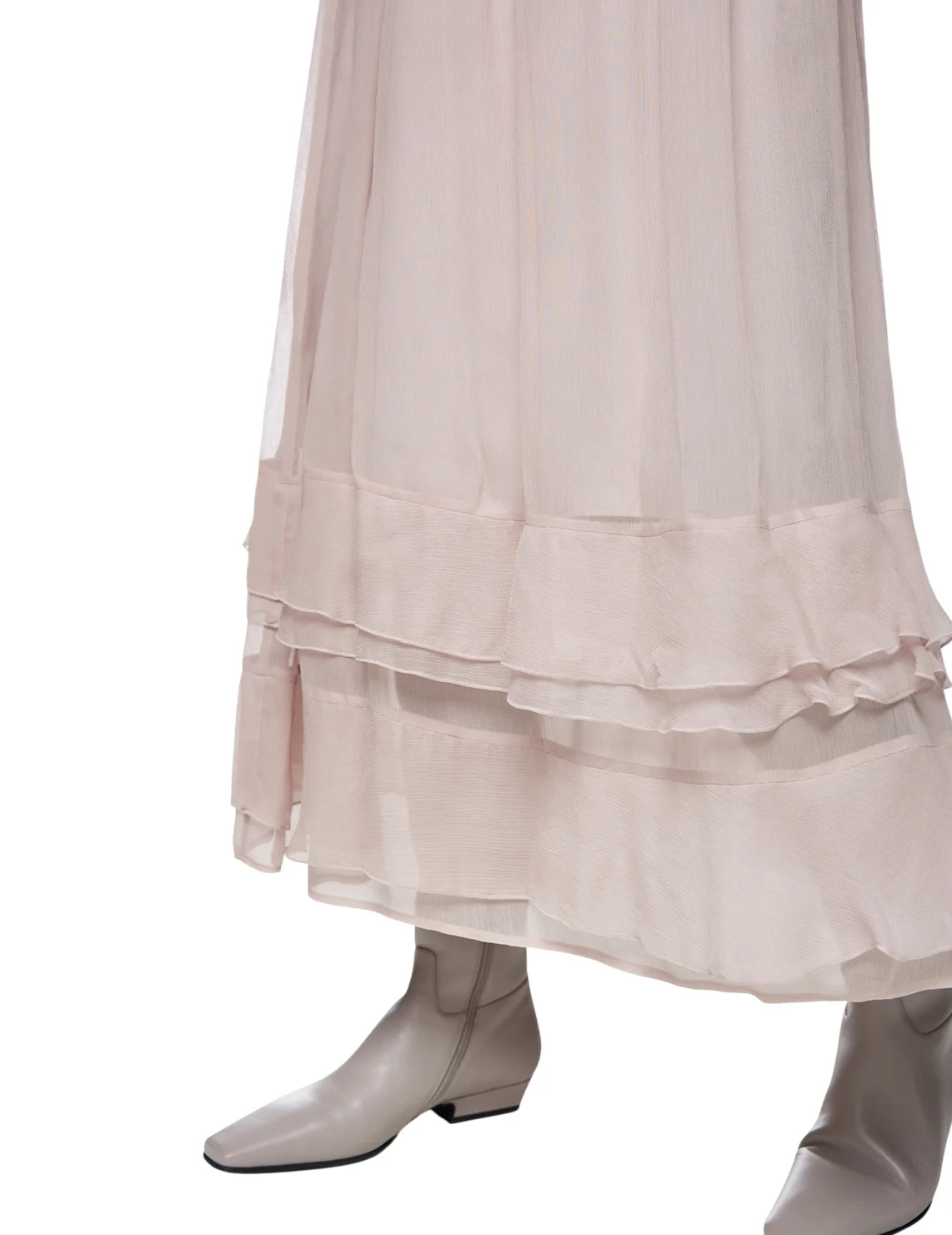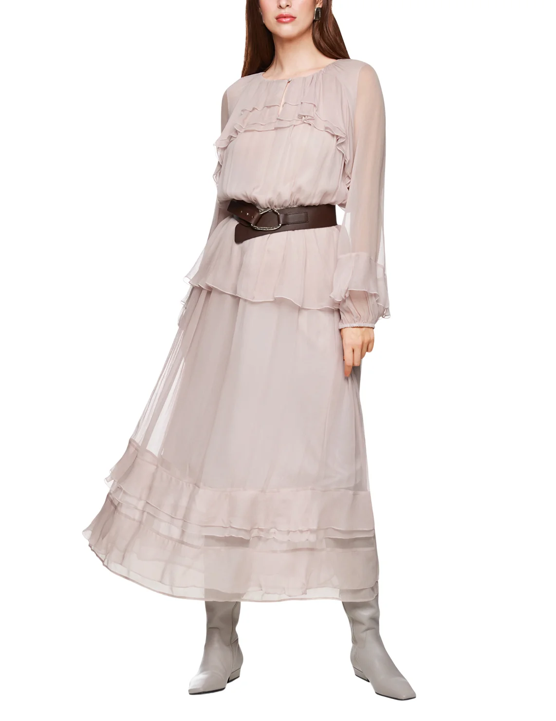 Сукня виготовлена з віскози, підкладка з поліестеру. Модель довжини максі виконана в розкльошеному крої. Має круглий виріз горловини із застібкою на ґудзик, куліску на талії та довгі рукави з манжетами. Декорована воланами.
