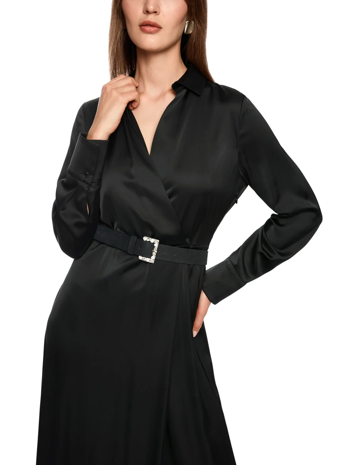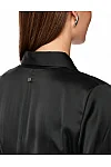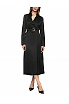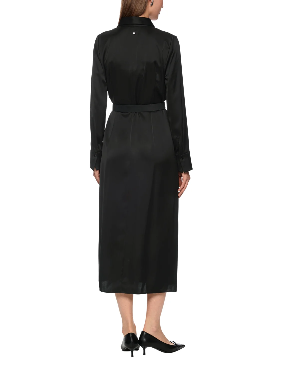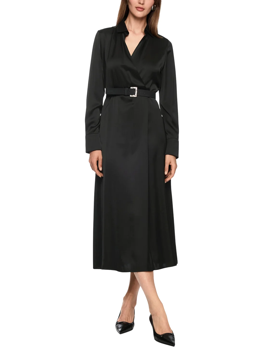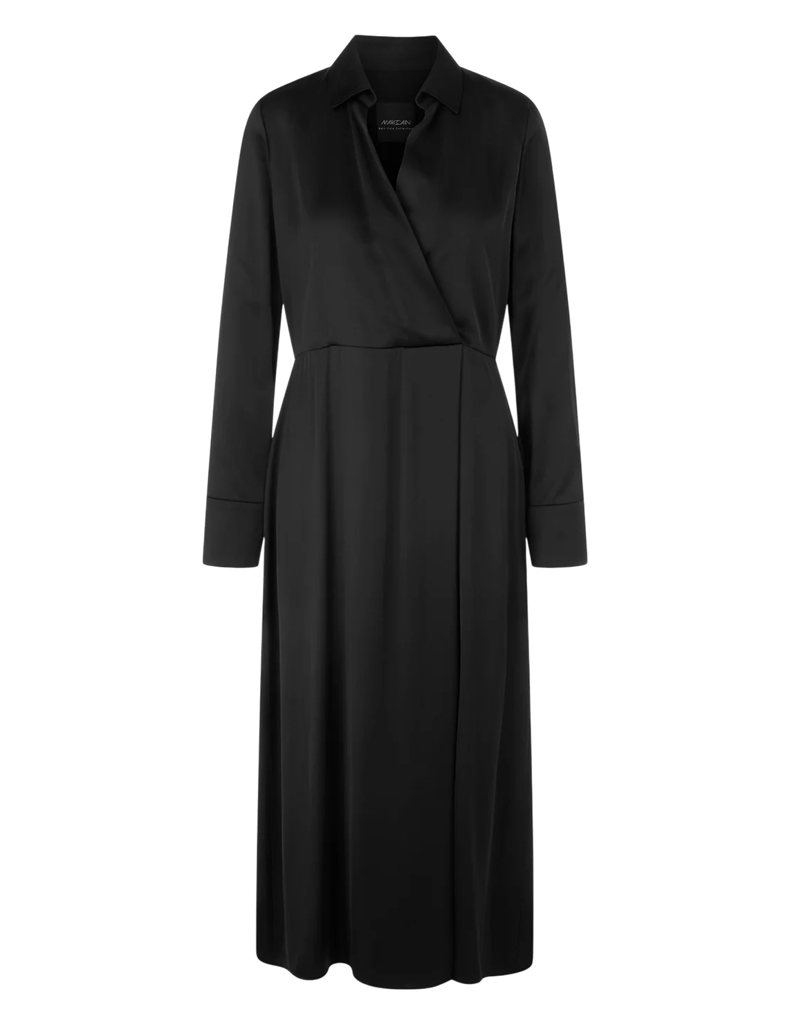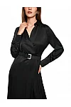 Сукня виготовлена з віскози та поліестеру. Модель довжини міді виконана в розкльошеному крої. Має відкладний комір, приховану застібку на блискавці збоку та довгі рукави з манжетами.