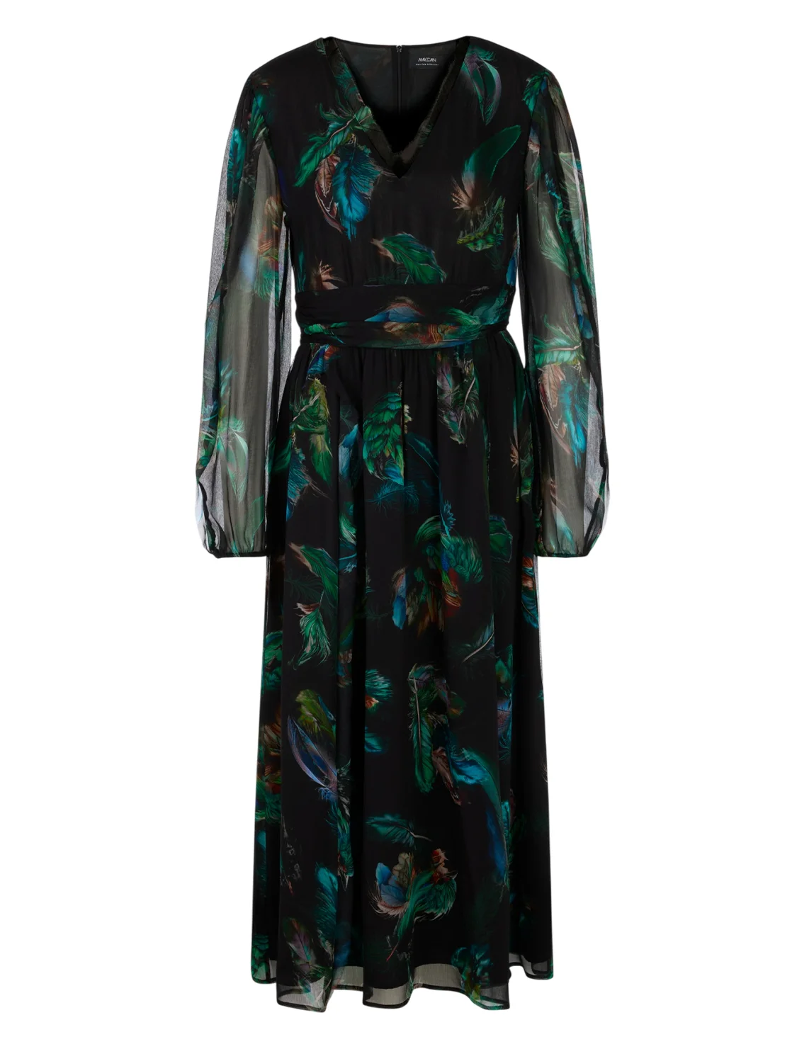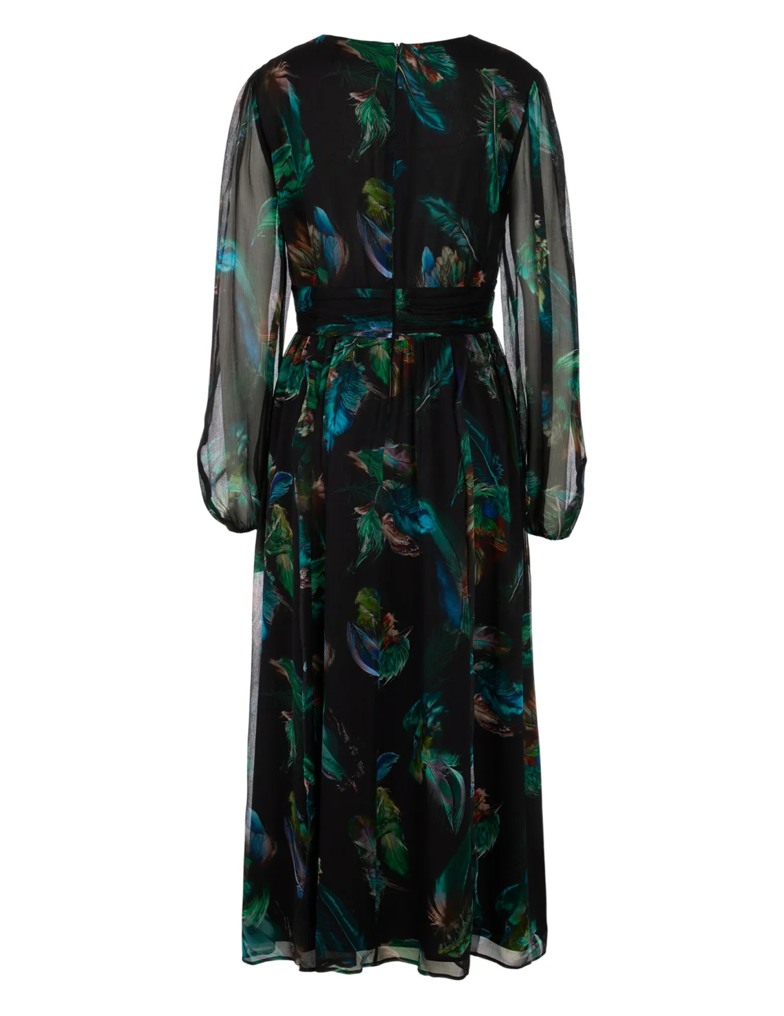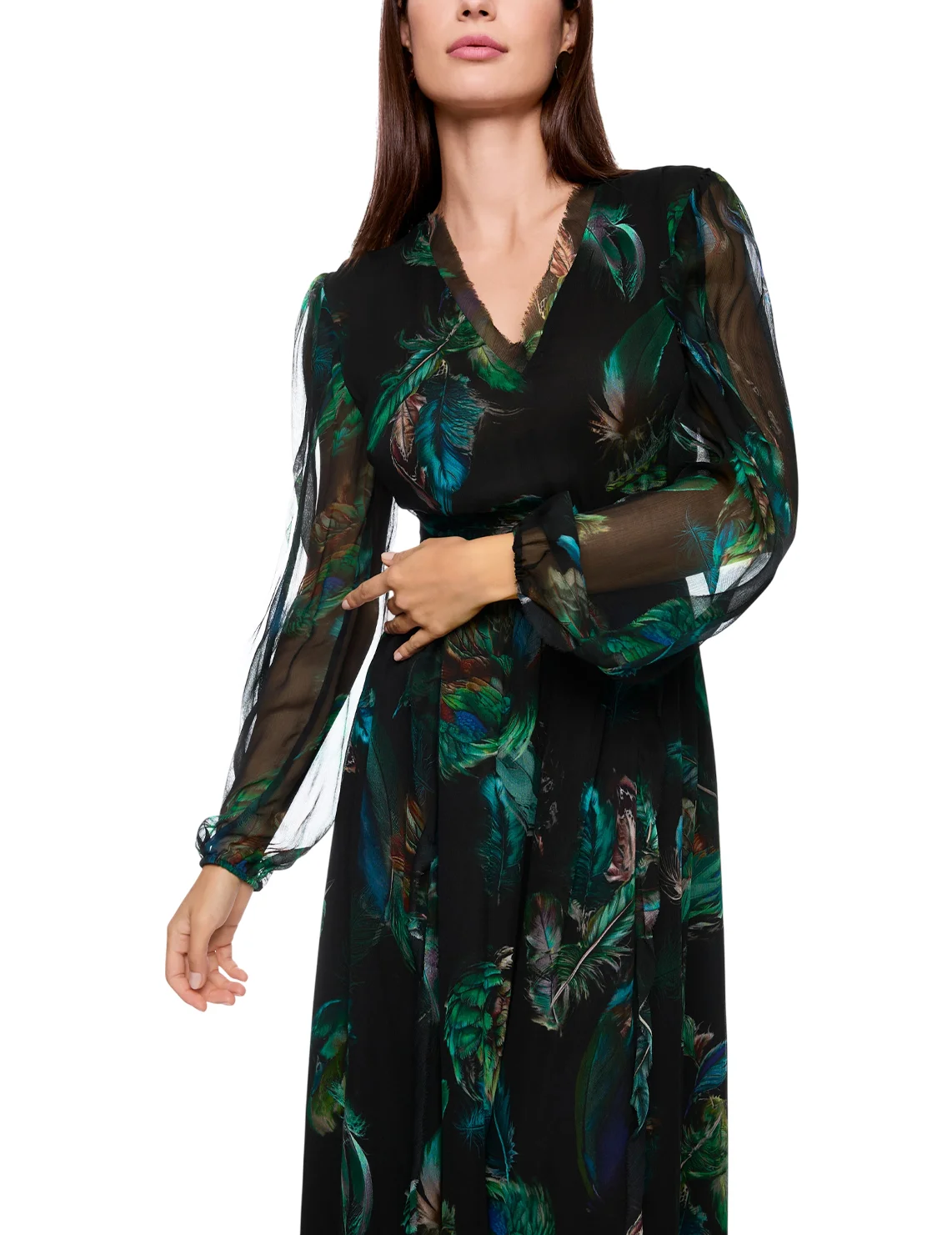 Сукня виготовлена зі 100% віскози високої якості, підкладка з поліестеру. Модель довжини міді виконана в розкльошеному крої. Має V-подібний виріз горловини, застібку на блискавці ззаду і напівпрозорі довгі рукави з манжетами. Декорована оригінальним принтом.
