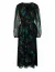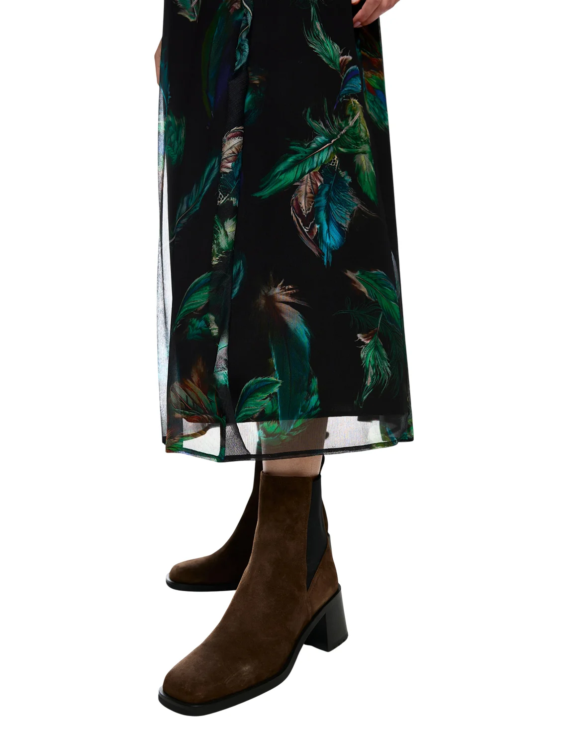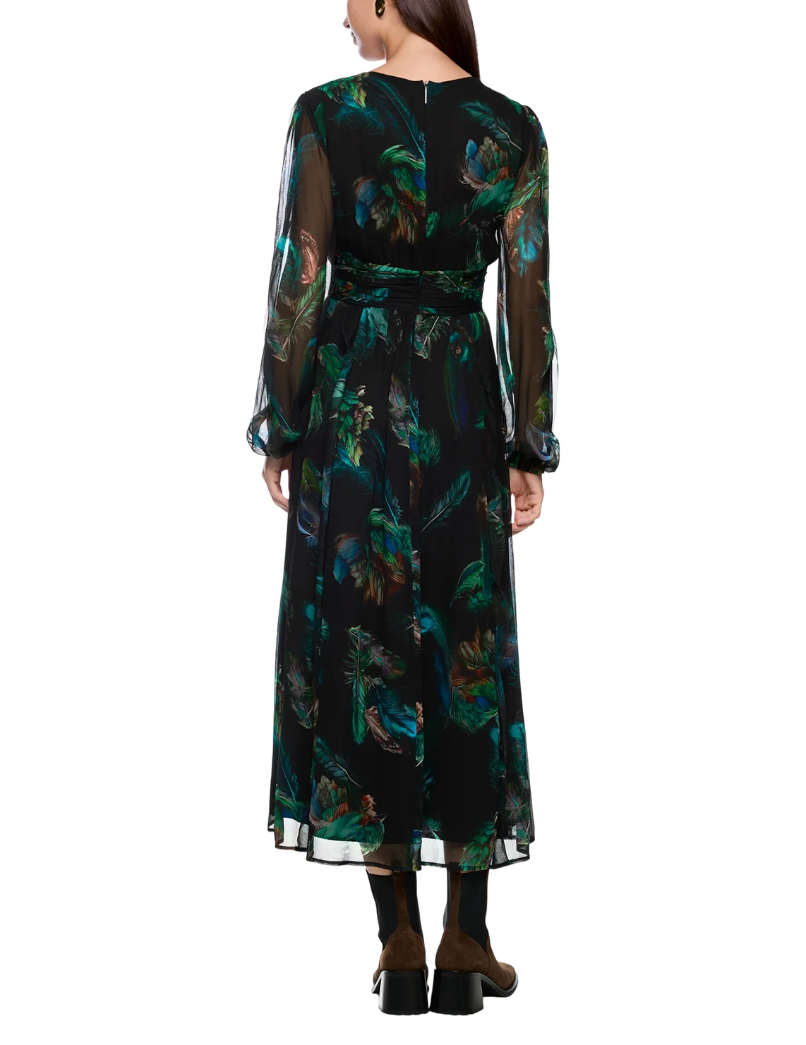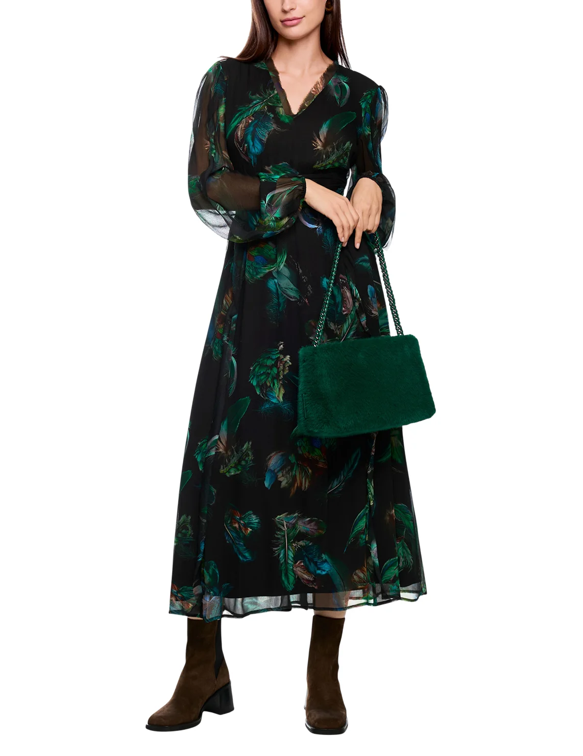 Сукня виготовлена зі 100% віскози високої якості, підкладка з поліестеру. Модель довжини міді виконана в розкльошеному крої. Має V-подібний виріз горловини, застібку на блискавці ззаду і напівпрозорі довгі рукави з манжетами. Декорована оригінальним принтом.