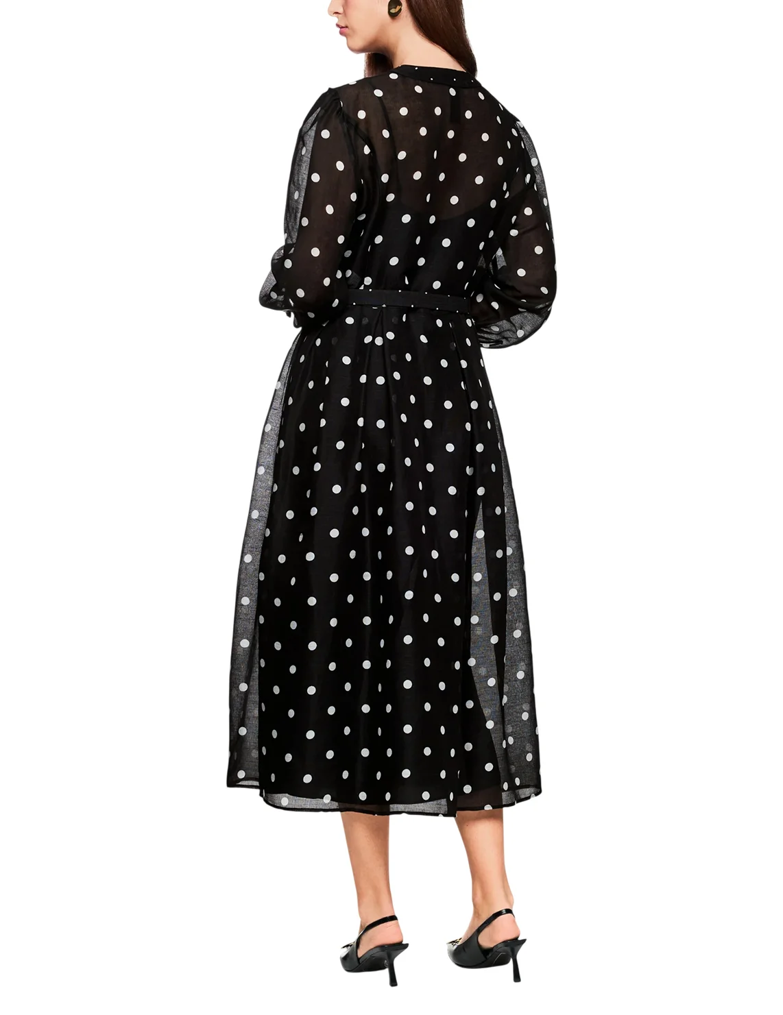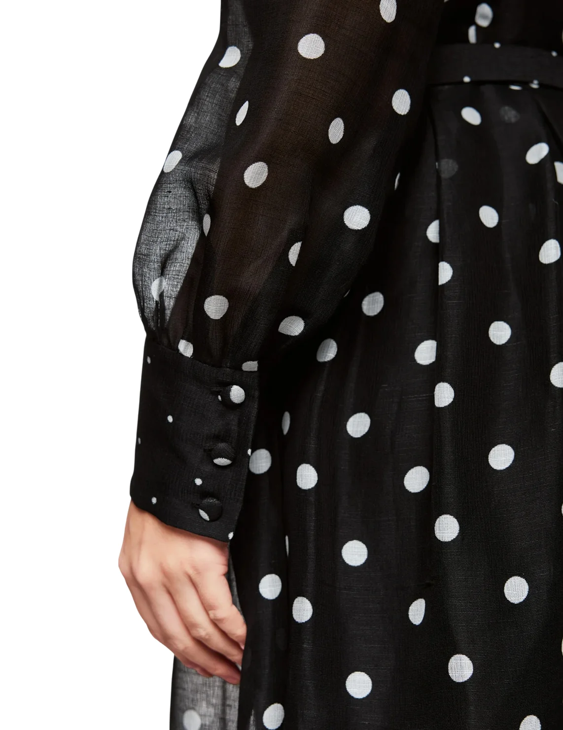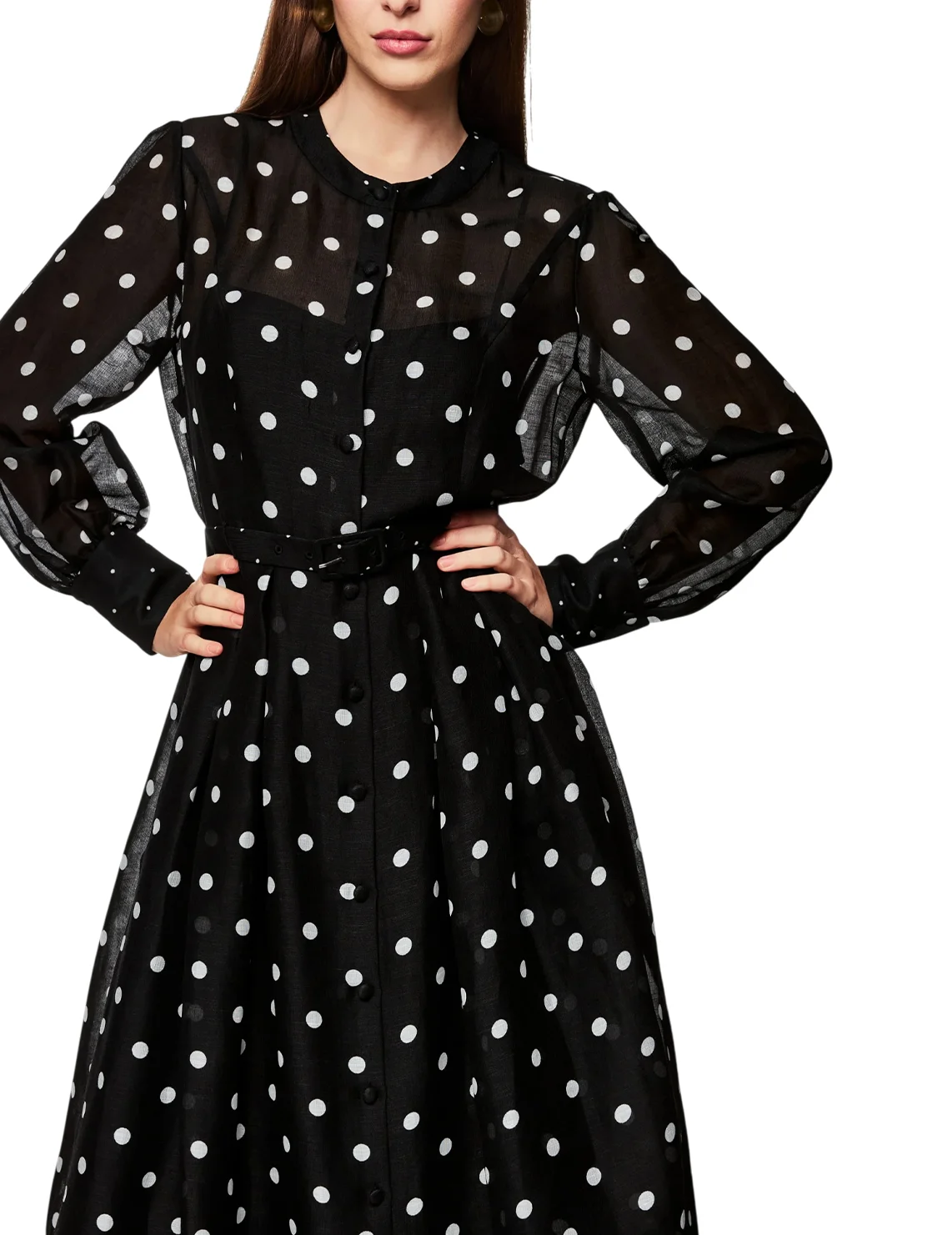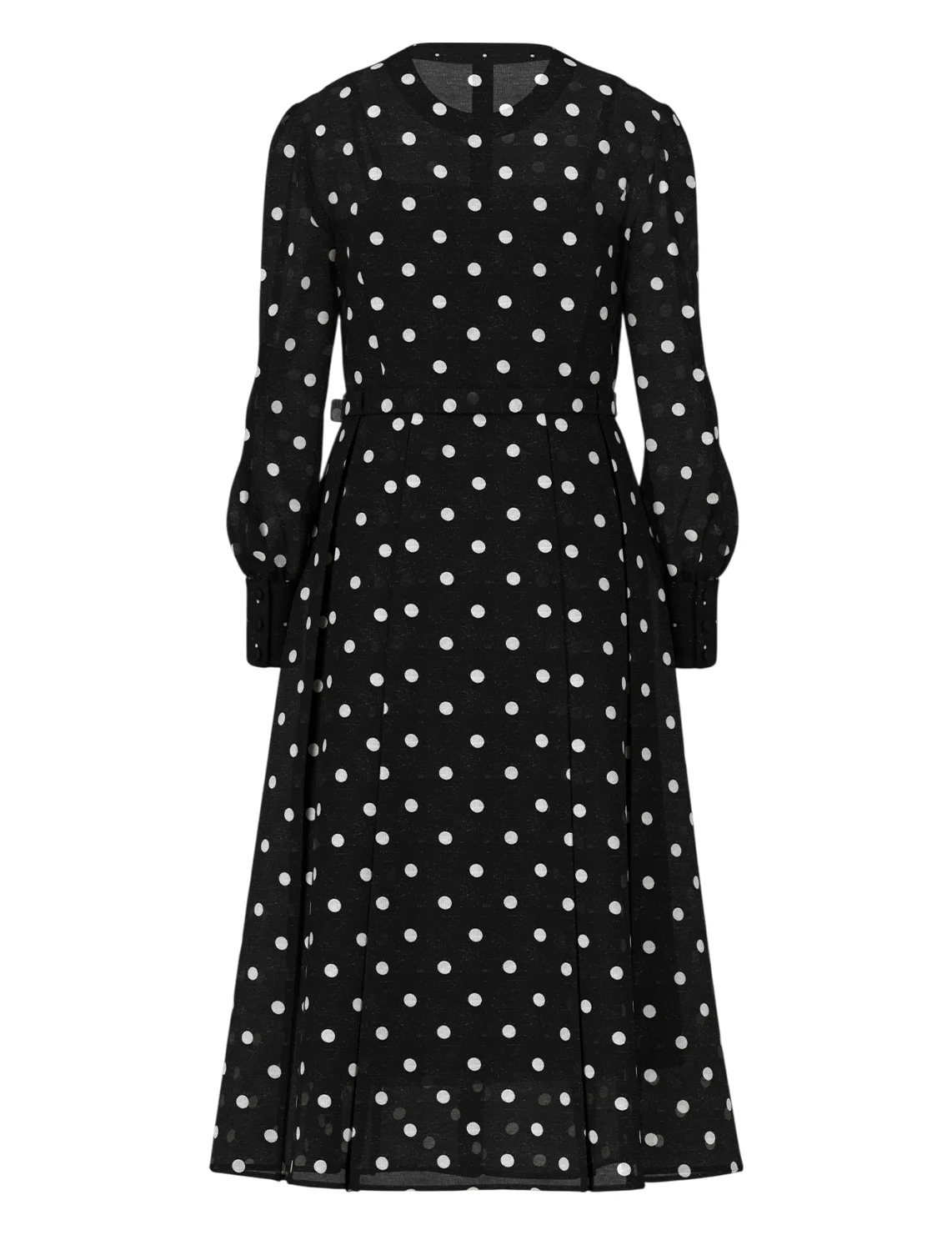 Сукня виготовлена з льону та шовку. Модель довжини міді виконана в розкльошеному крої. Має круглий виріз горловини, застібку на ґудзиках, пояс у тон і довгі рукави з манжетами. Декорована принтом у горошок.