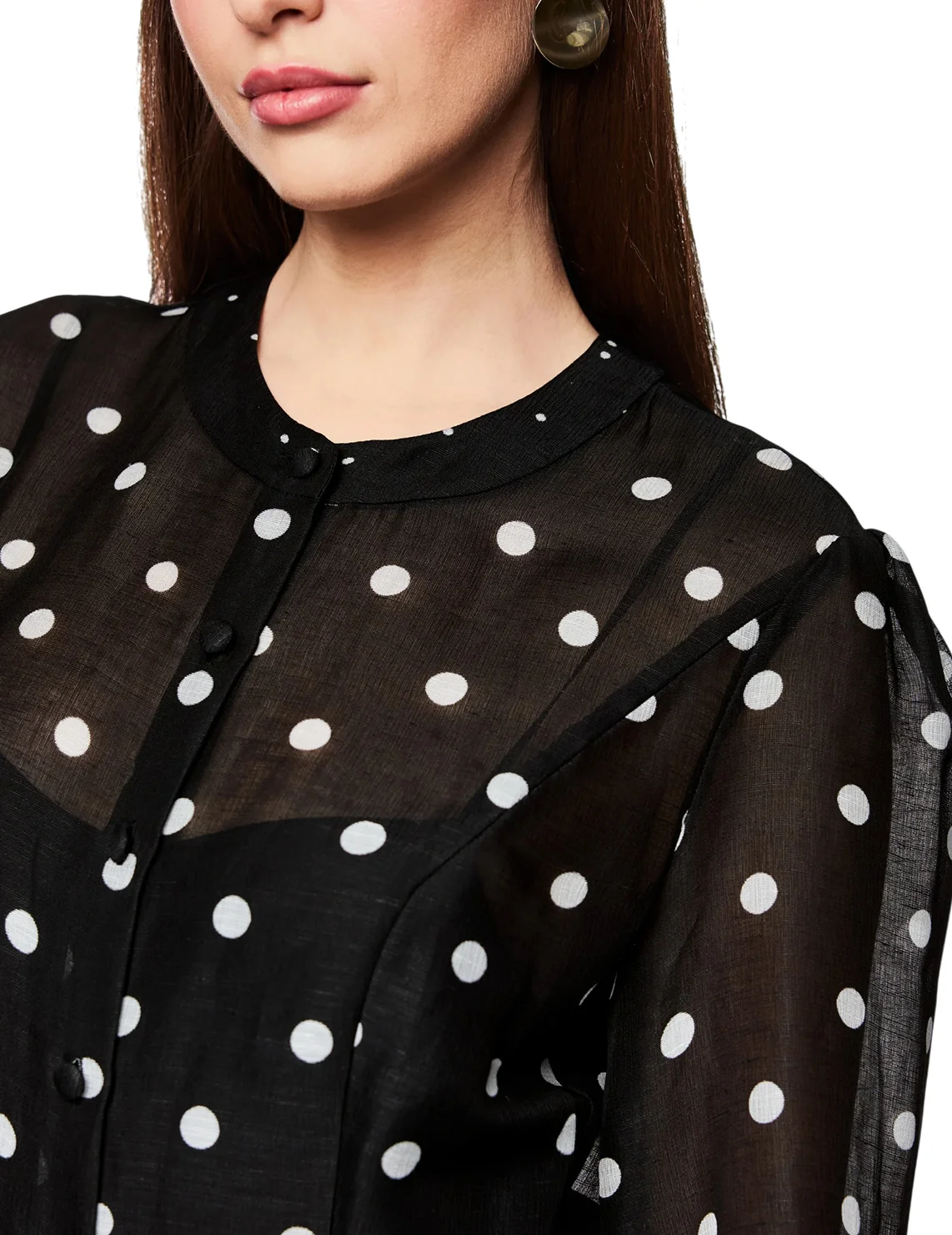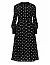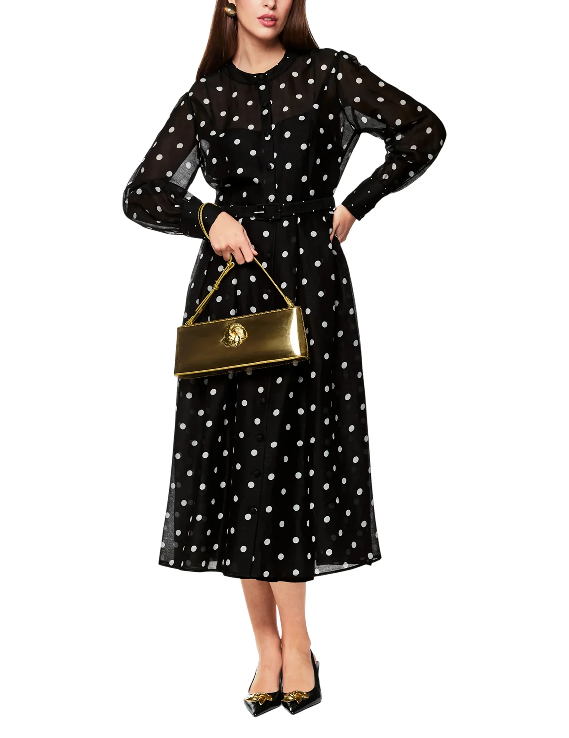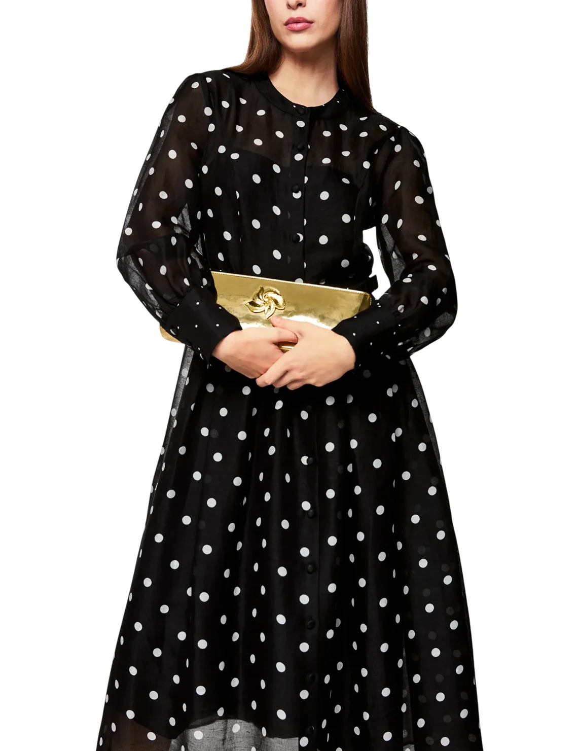 Сукня виготовлена з льону та шовку. Модель довжини міді виконана в розкльошеному крої. Має круглий виріз горловини, застібку на ґудзиках, пояс у тон і довгі рукави з манжетами. Декорована принтом у горошок.