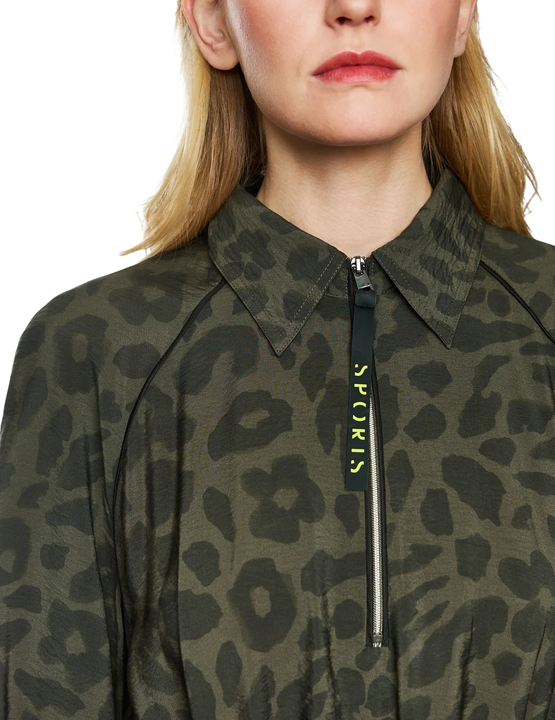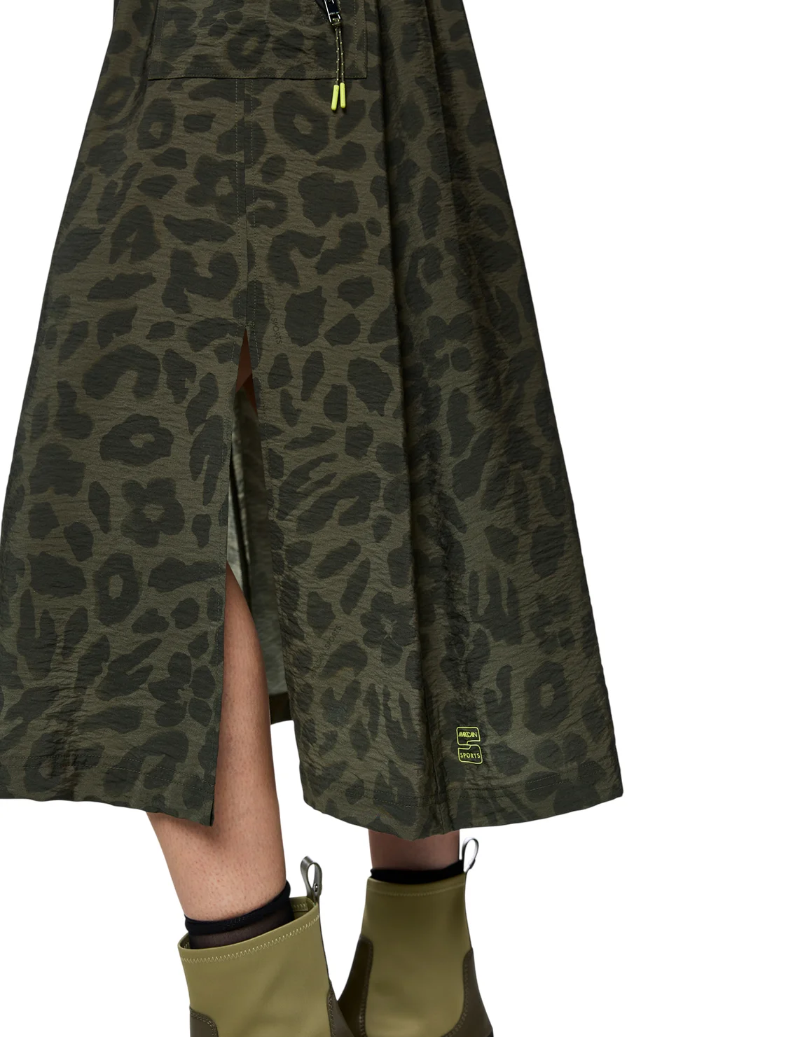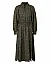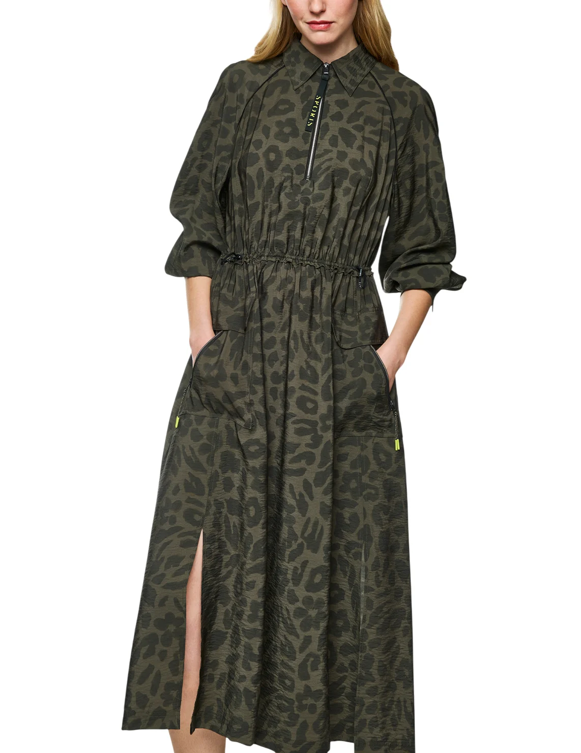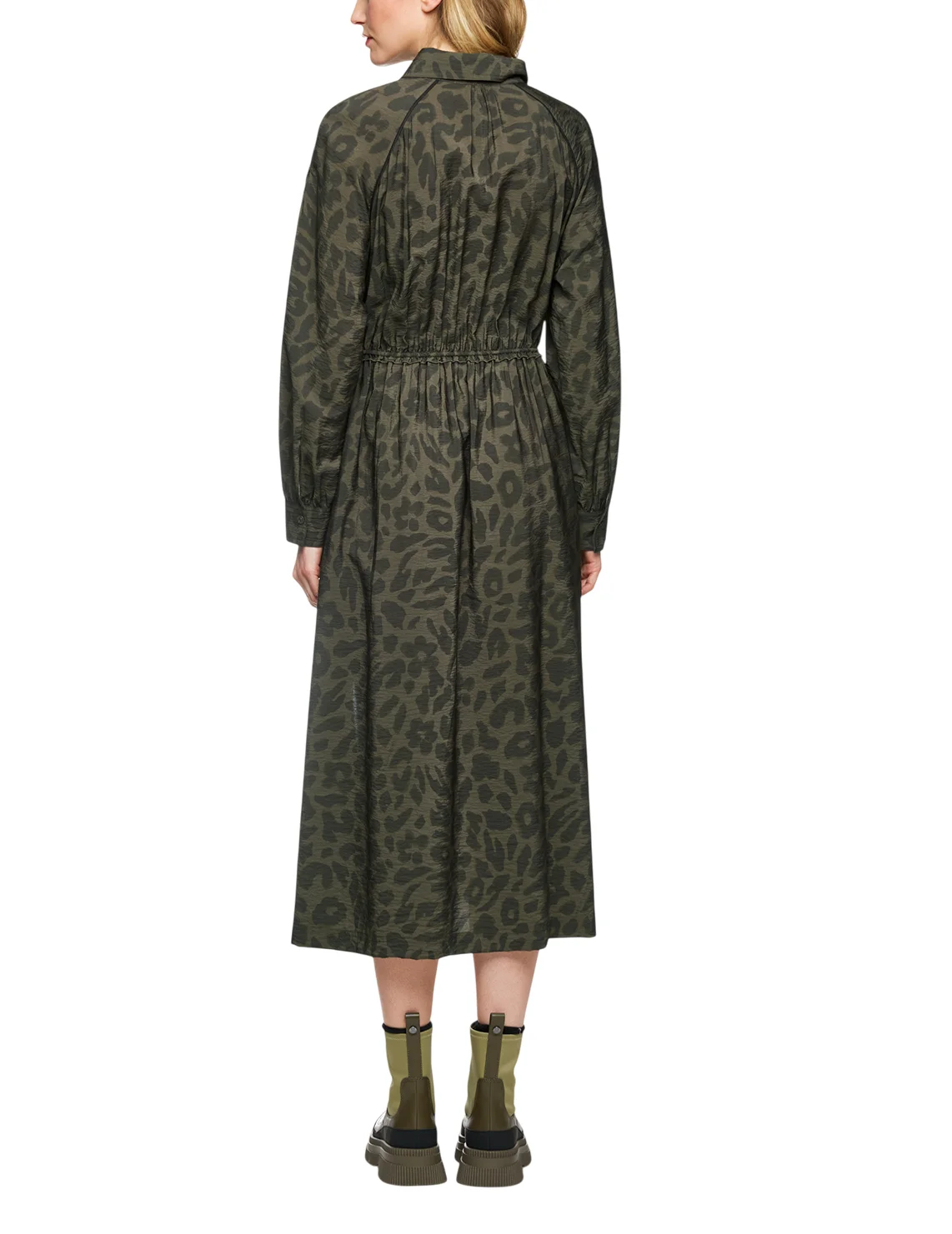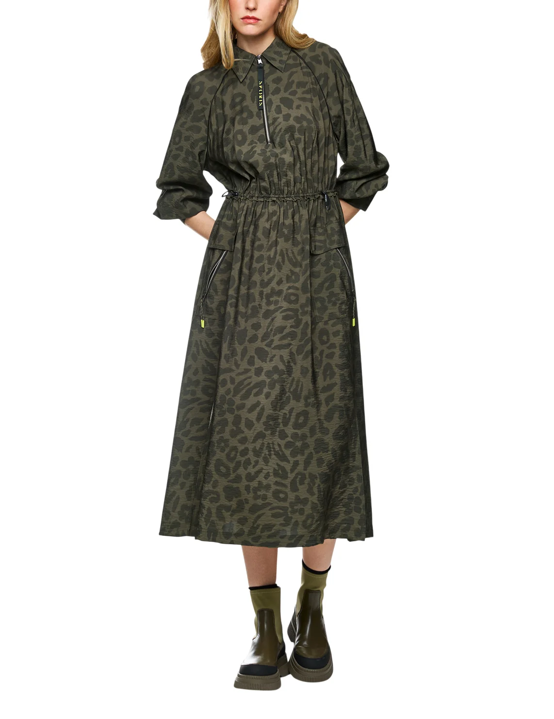 Сукня виготовлена з віскози та поліаміду. Модель довжини міді виконана в розкльошеному крої. Має відкладний комір, застібку-блискавку, кишені з клапанами, куліску на талії та довгі рукави з манжетами. Декоровано анімалістичним принтом.