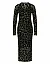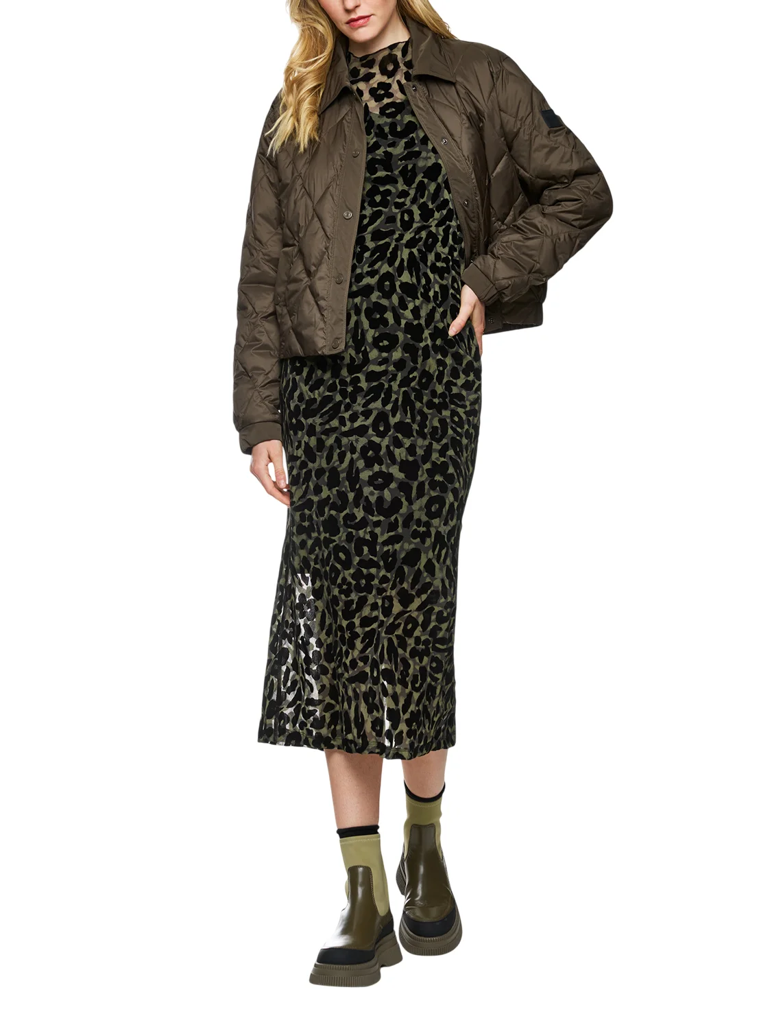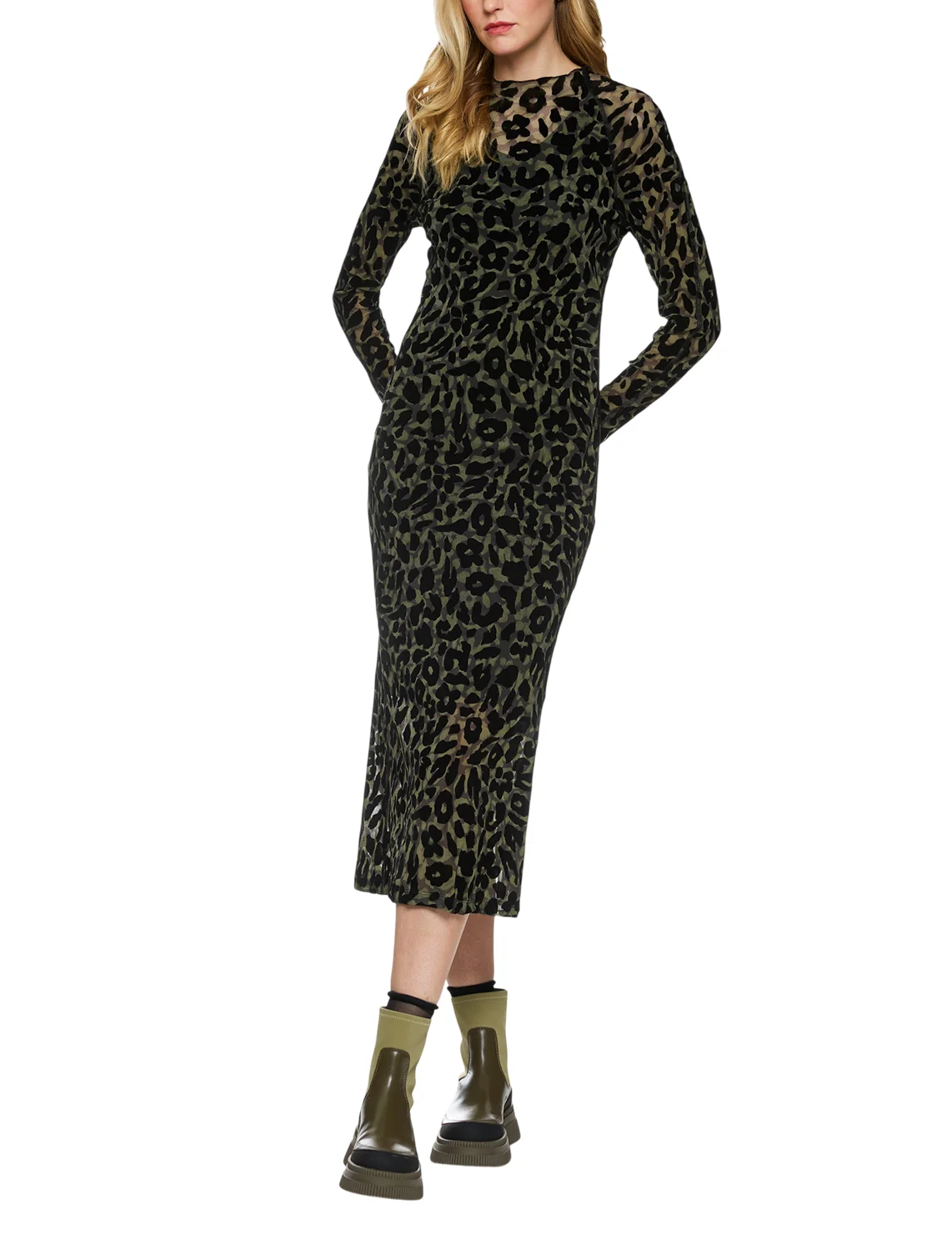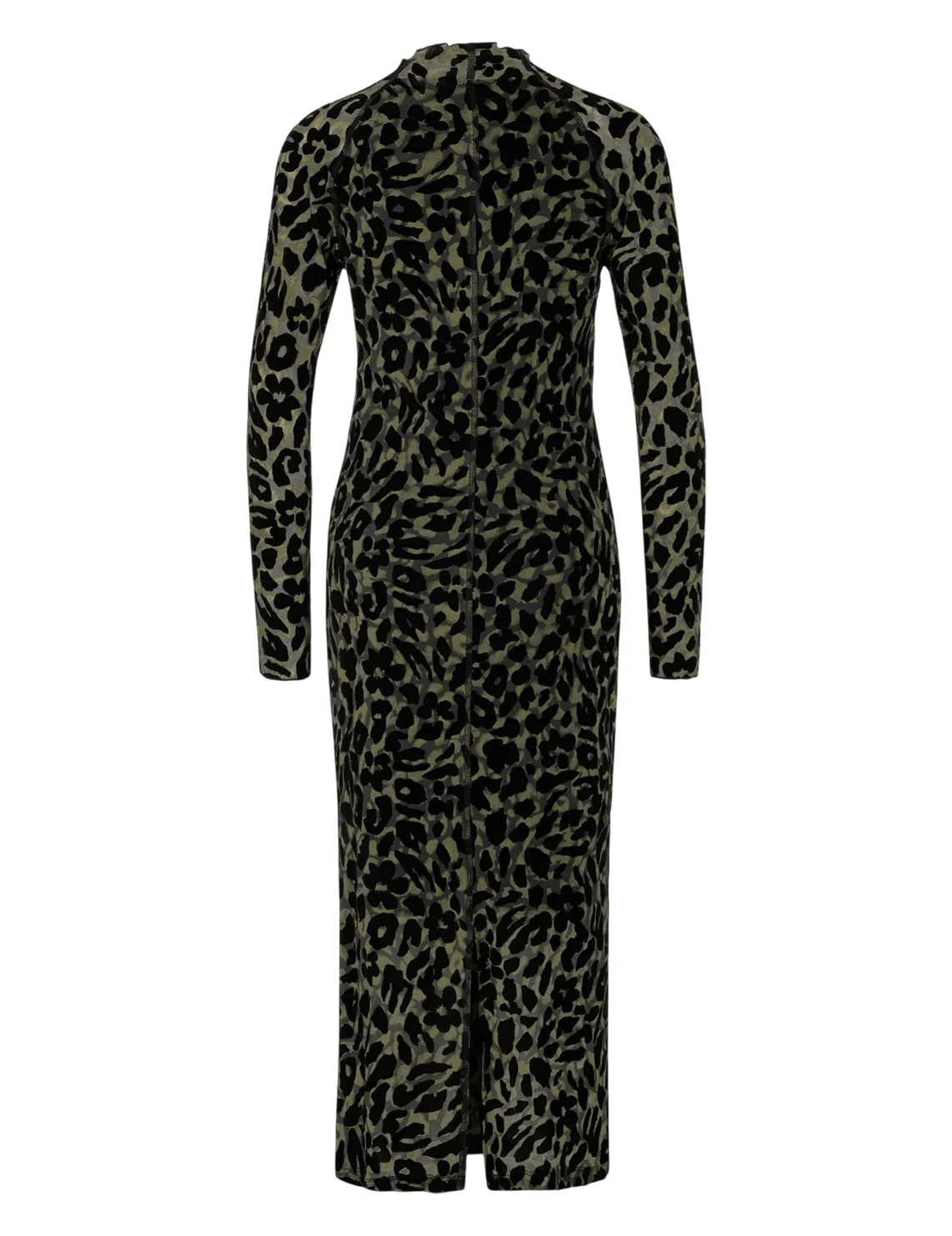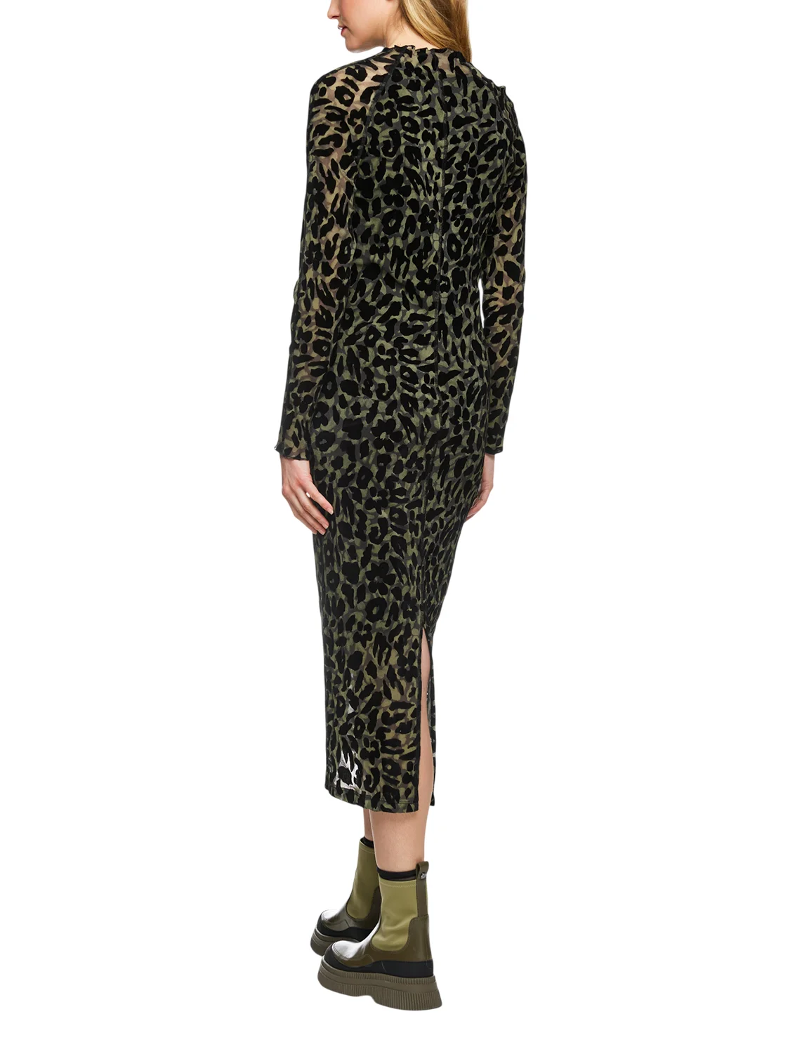 Сукня виготовлена з поліаміду і віскози, підкладка з поліаміду і еластану. Модель довжини міді виконана в приталеному крої. Має комір-стійку, розріз ззаду та довгі рукави. Декорована анімалістичним принтом.