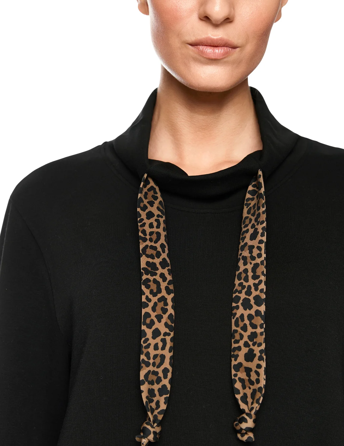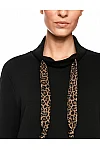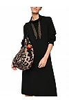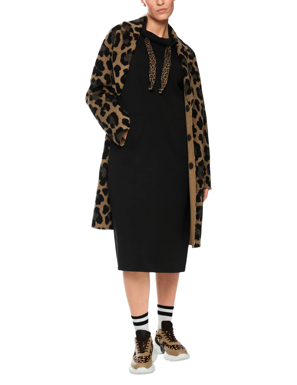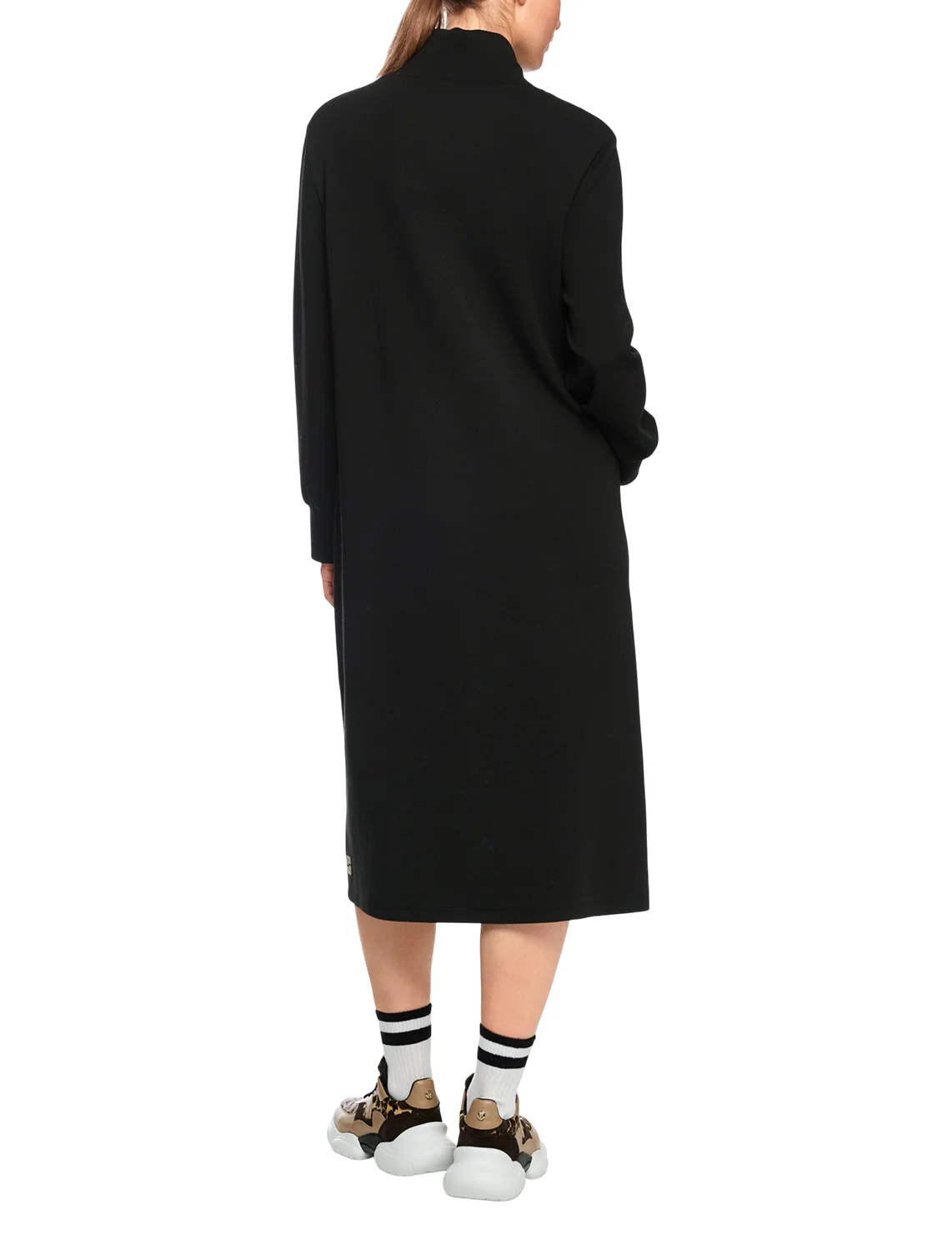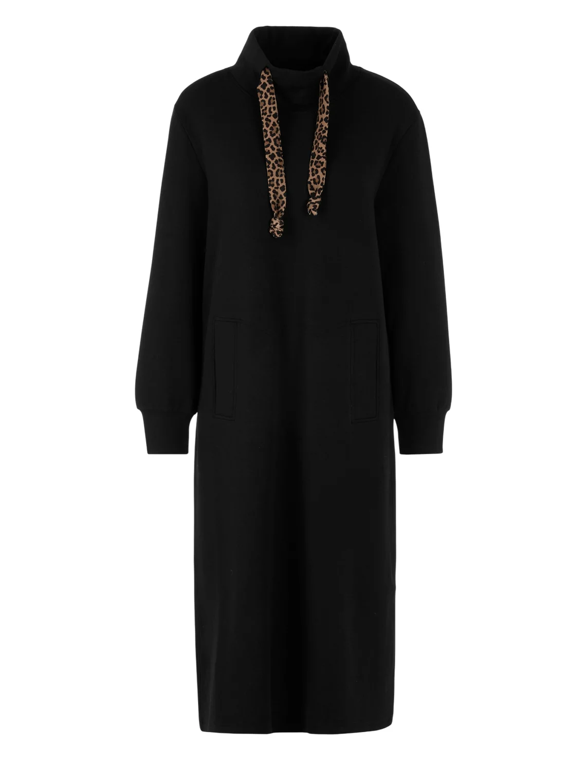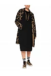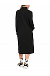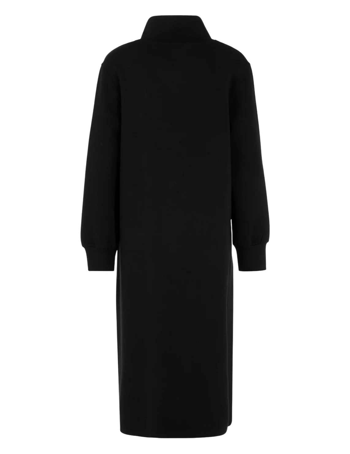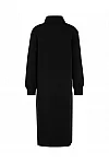 Сукня виготовлена з бавовни, поліестеру та еластану. Модель довжини міді виконана в прямому крої. Має комір-стійку, прорізні кишені, куліску та довгі рукави з манжетами.