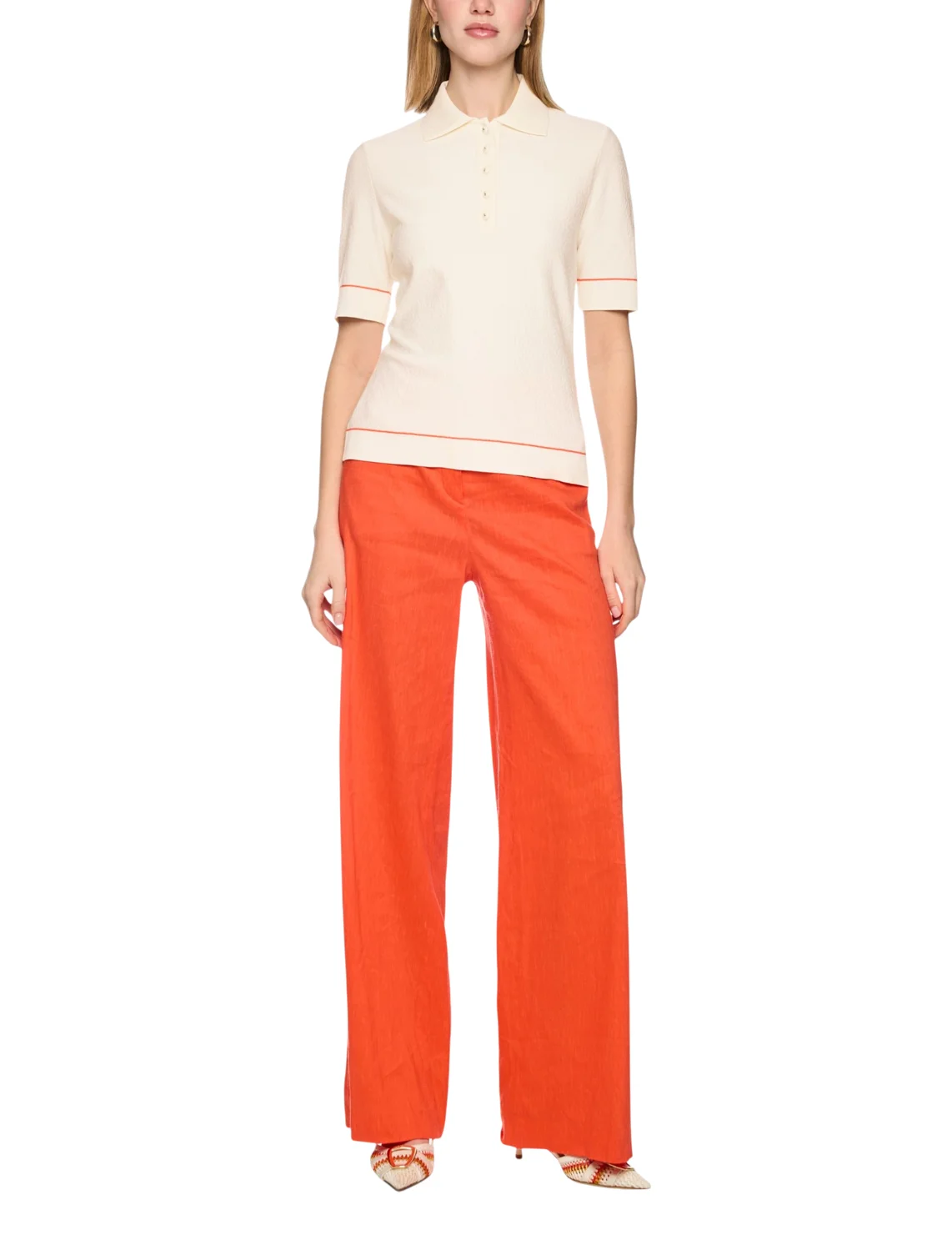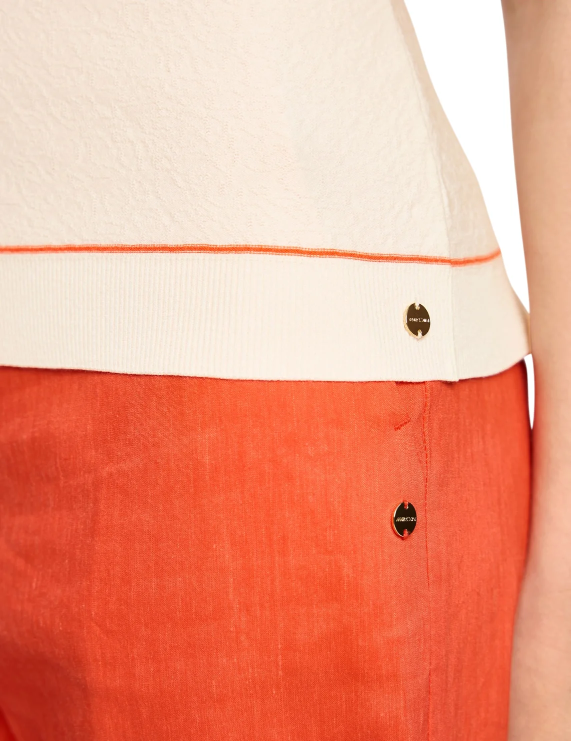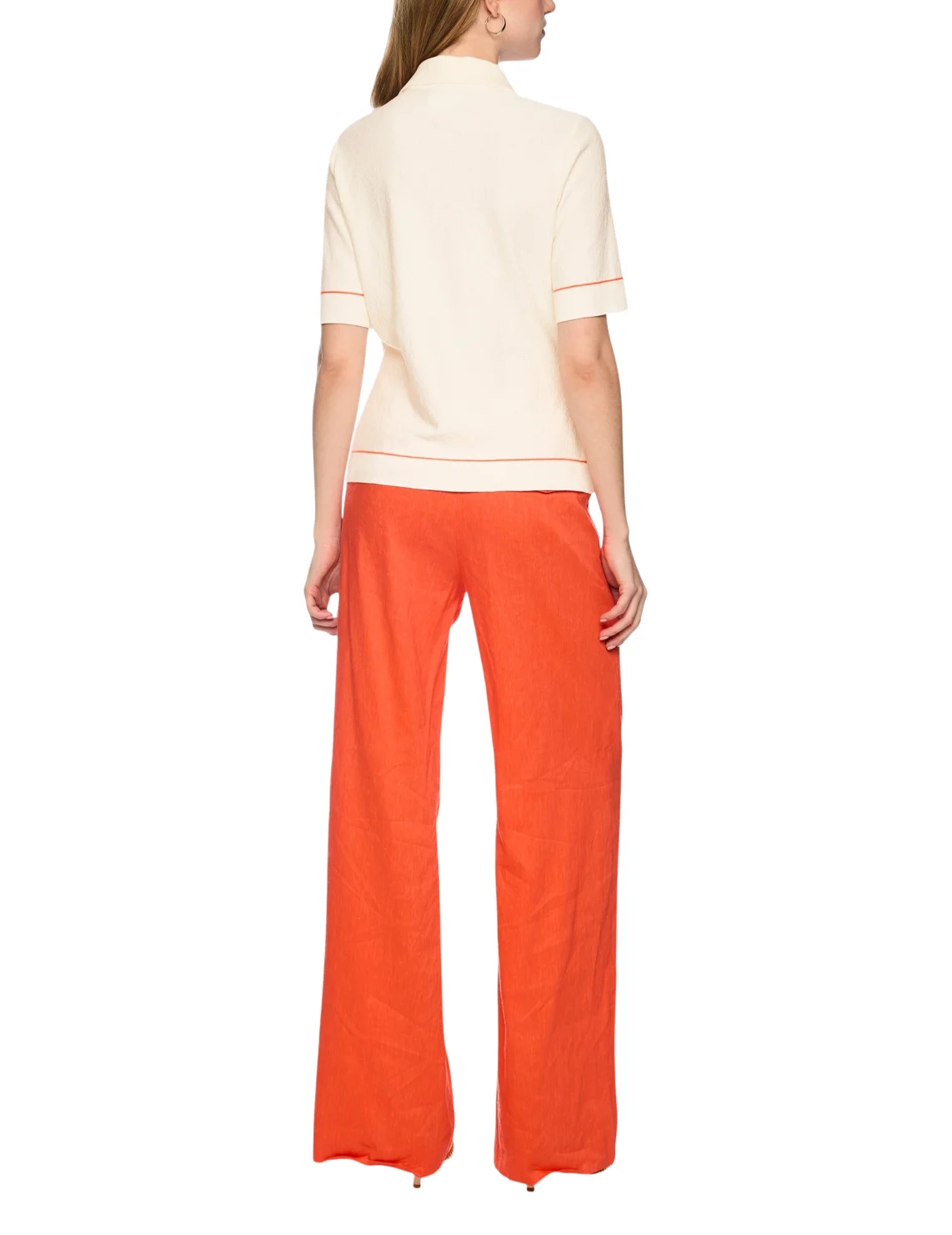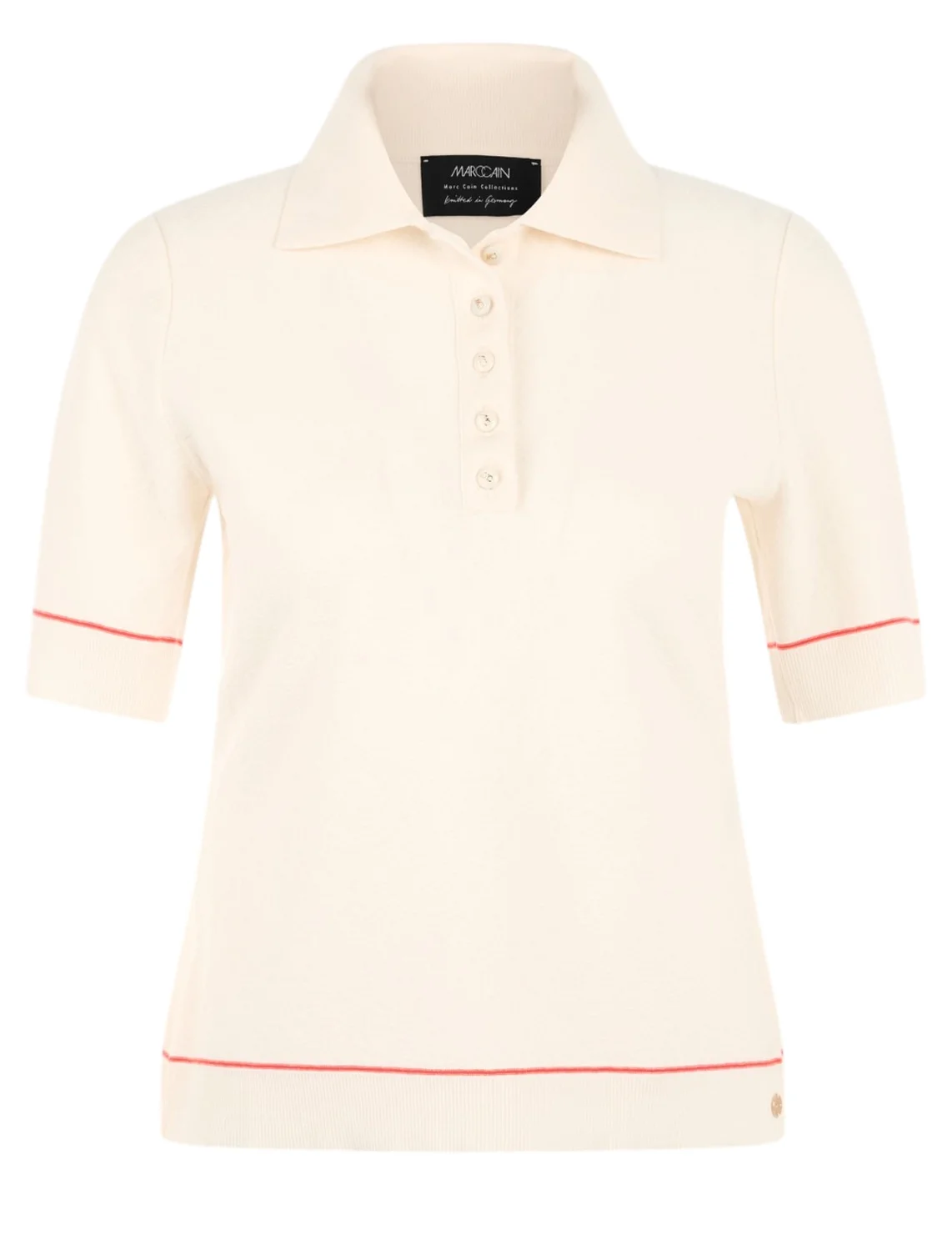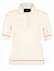 Поло виготовлено з віскози та поліестеру. Модель виконана в прямому, злегка приталеному крої. Має V-подібний виріз горловини, відкладний комір з планкою на ґудзики та короткі рукави з манжетами. Декороване контрастними смугами та оригінальною текстурою.