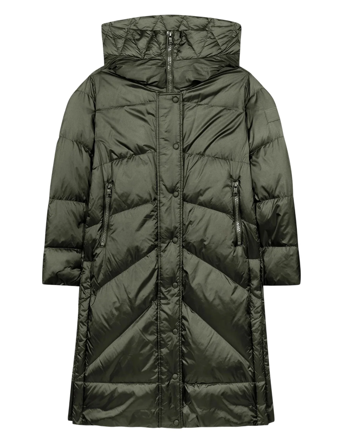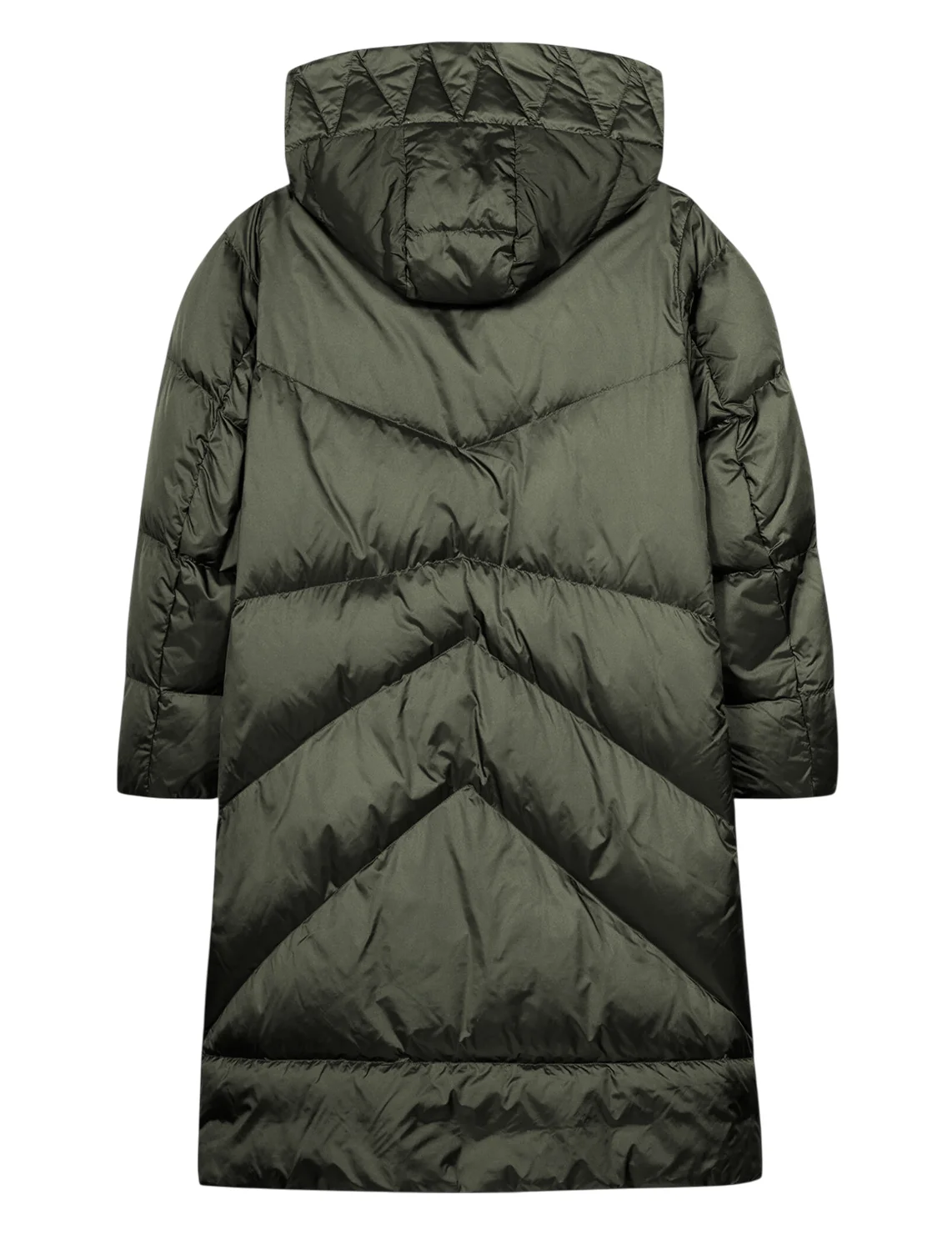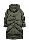Пуховик виготовлений зі 100% поліаміду, наповнювач - 90% пух і 10% перо. Модель виконана у вільному крої. Має капюшон з куліскою, довгі рукави, бічні розрізи на кнопках, прорізні кишені на блискавках, застібку-блискавку і кнопки.