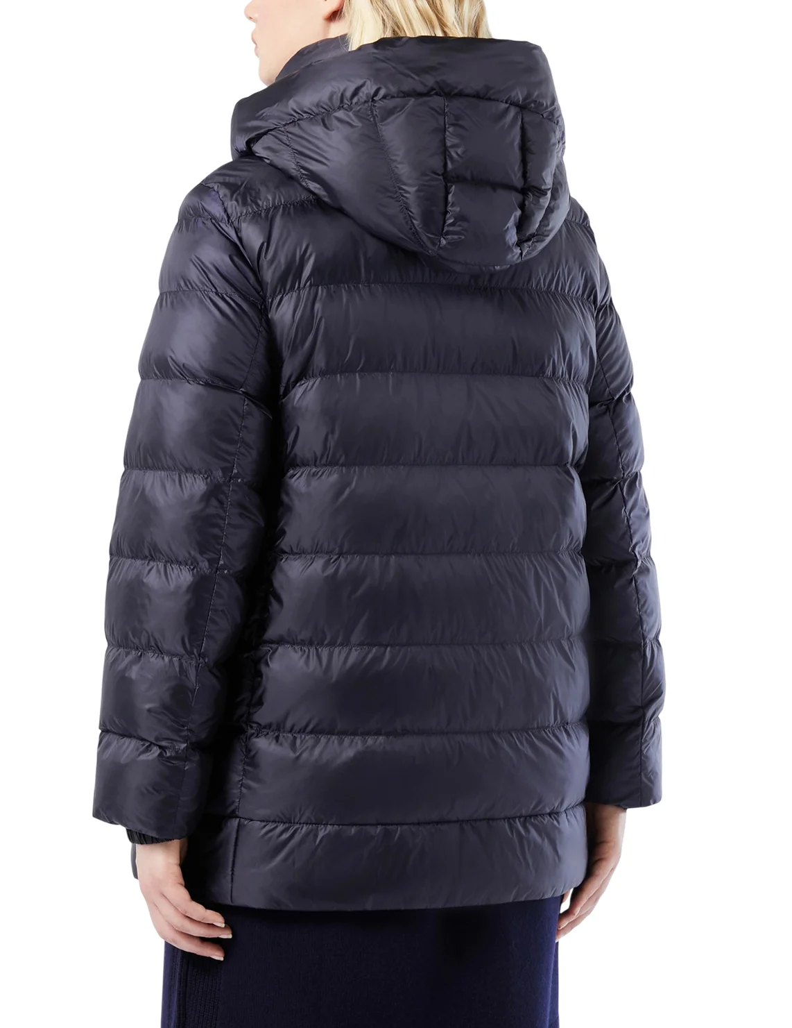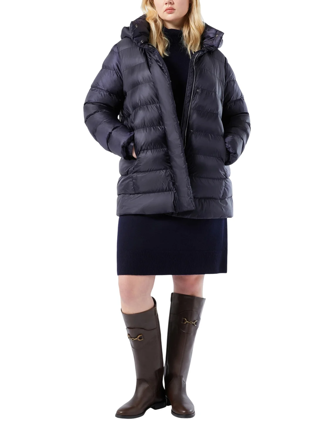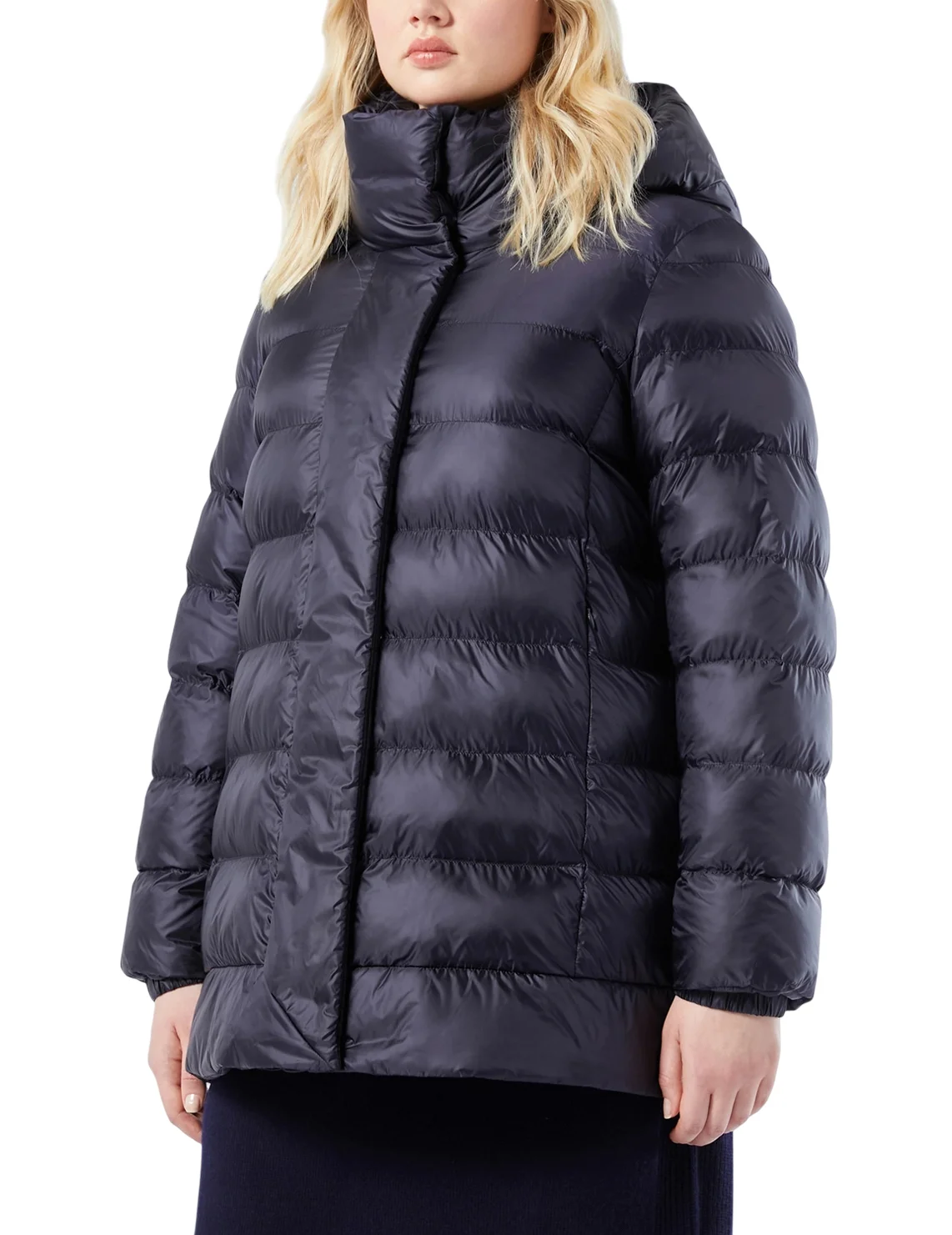 Пуховик виготовлений зі 100% поліаміду, підкладка з поліестеру, наповнювач з поліестеру, вовни та шовку. Модель виконана в прямому крої. Має знімний капюшон, довгі рукави, прорізні кишені, застібку на блискавці та кнопках.