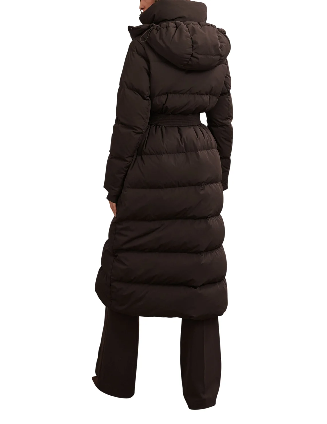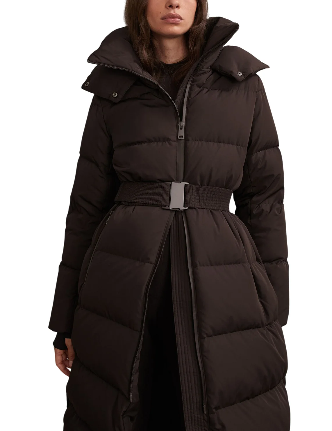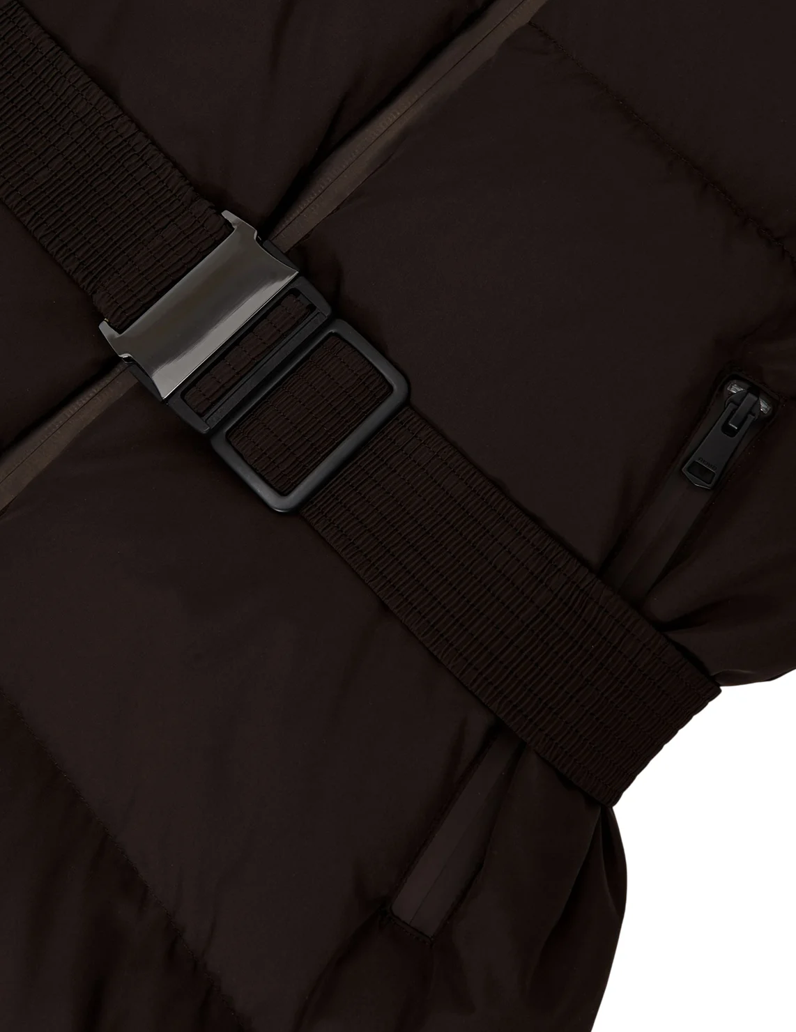 Пуховик виготовлений зі 100% поліестеру, наповнювач - 100% поліестер. Модель виконана у вільному крої. Має знімний капюшон з куліскою на кнопках, прорізні кишені на блискавках, застібку-блискавку, пояс у тон із пряжкою, довгі рукави та манжети з отворами для великих пальців.