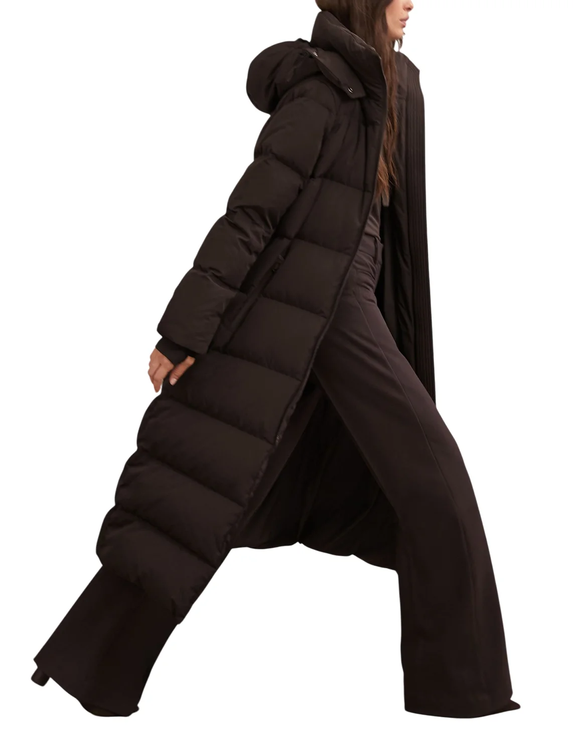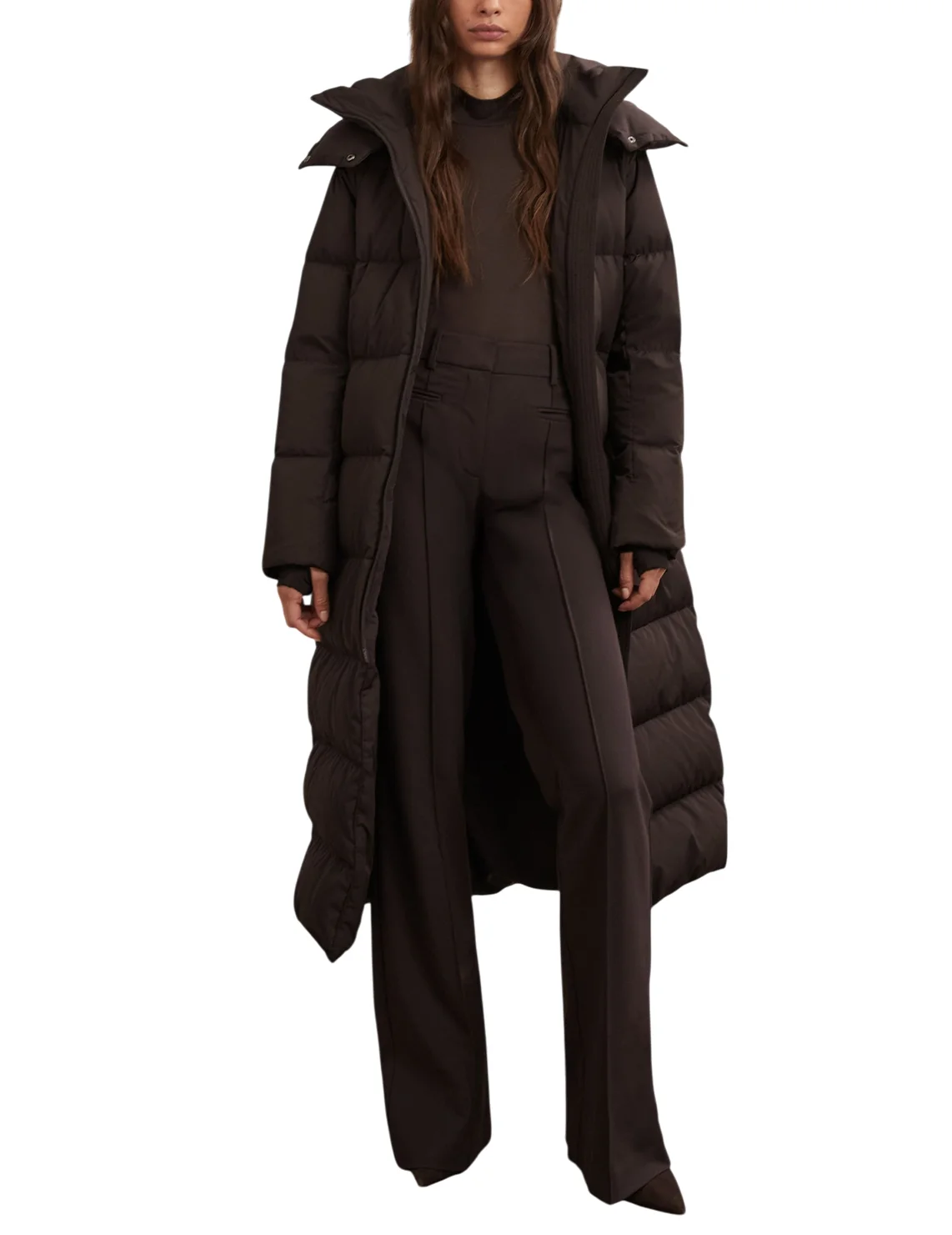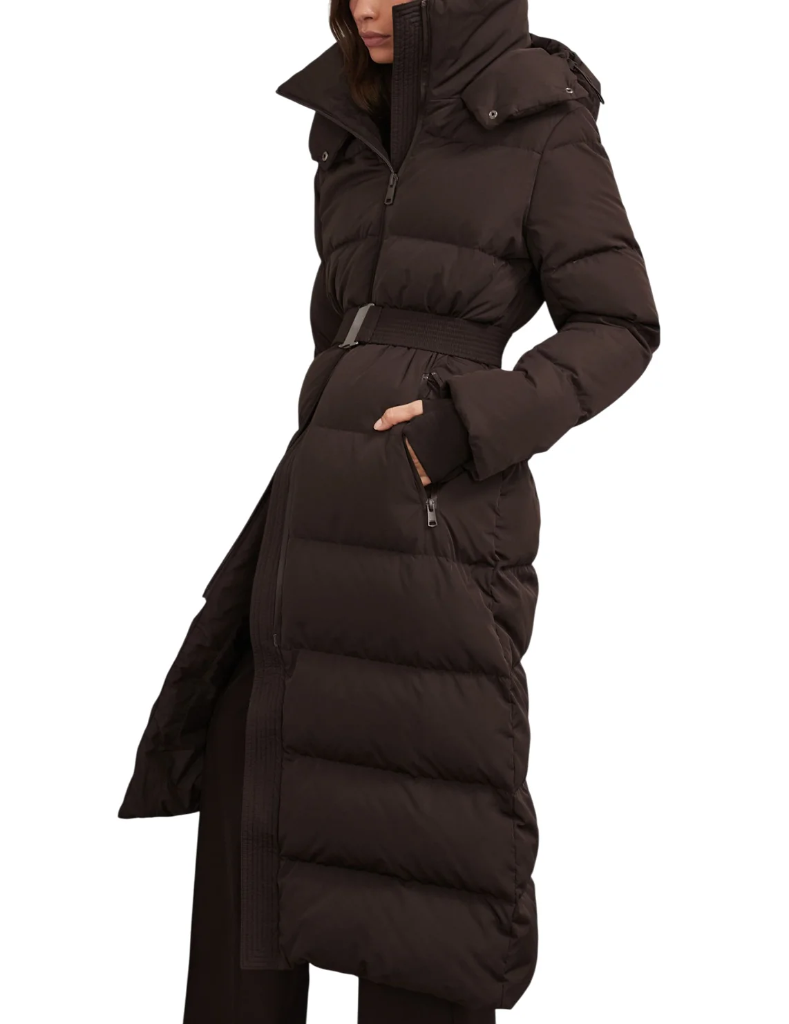 Пуховик виготовлений зі 100% поліестеру, наповнювач - 100% поліестер. Модель виконана у вільному крої. Має знімний капюшон з куліскою на кнопках, прорізні кишені на блискавках, застібку-блискавку, пояс у тон із пряжкою, довгі рукави та манжети з отворами для великих пальців.