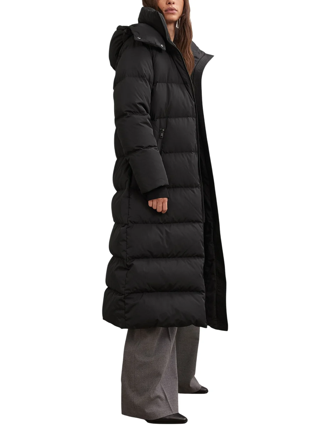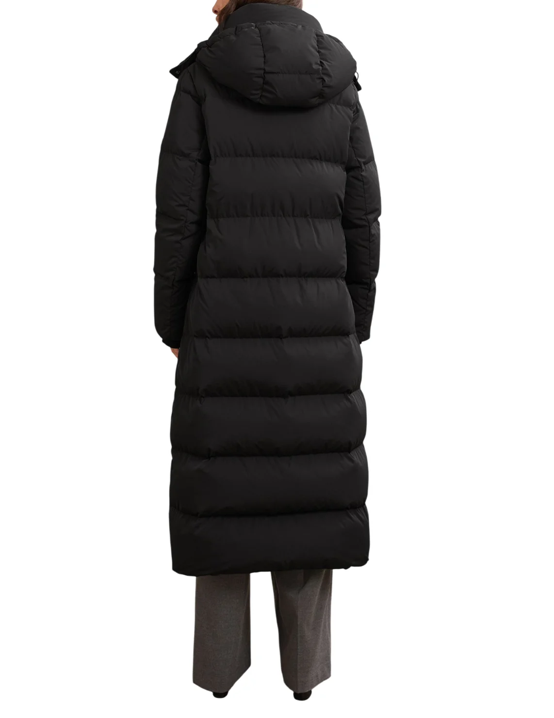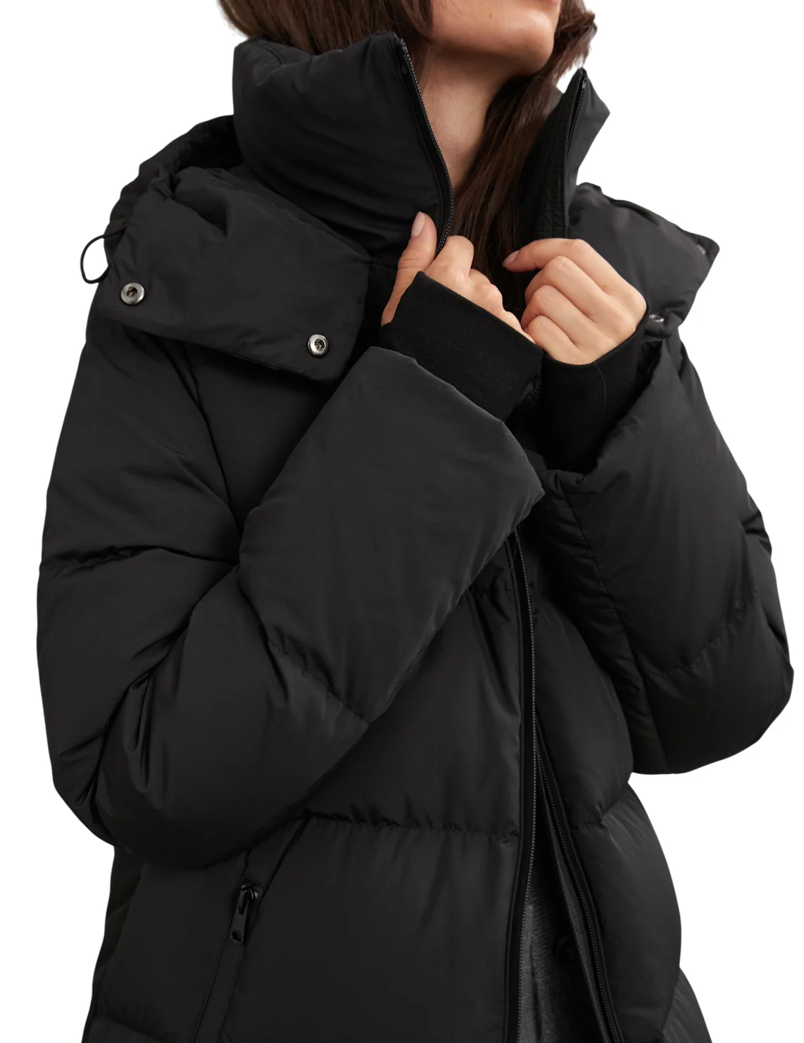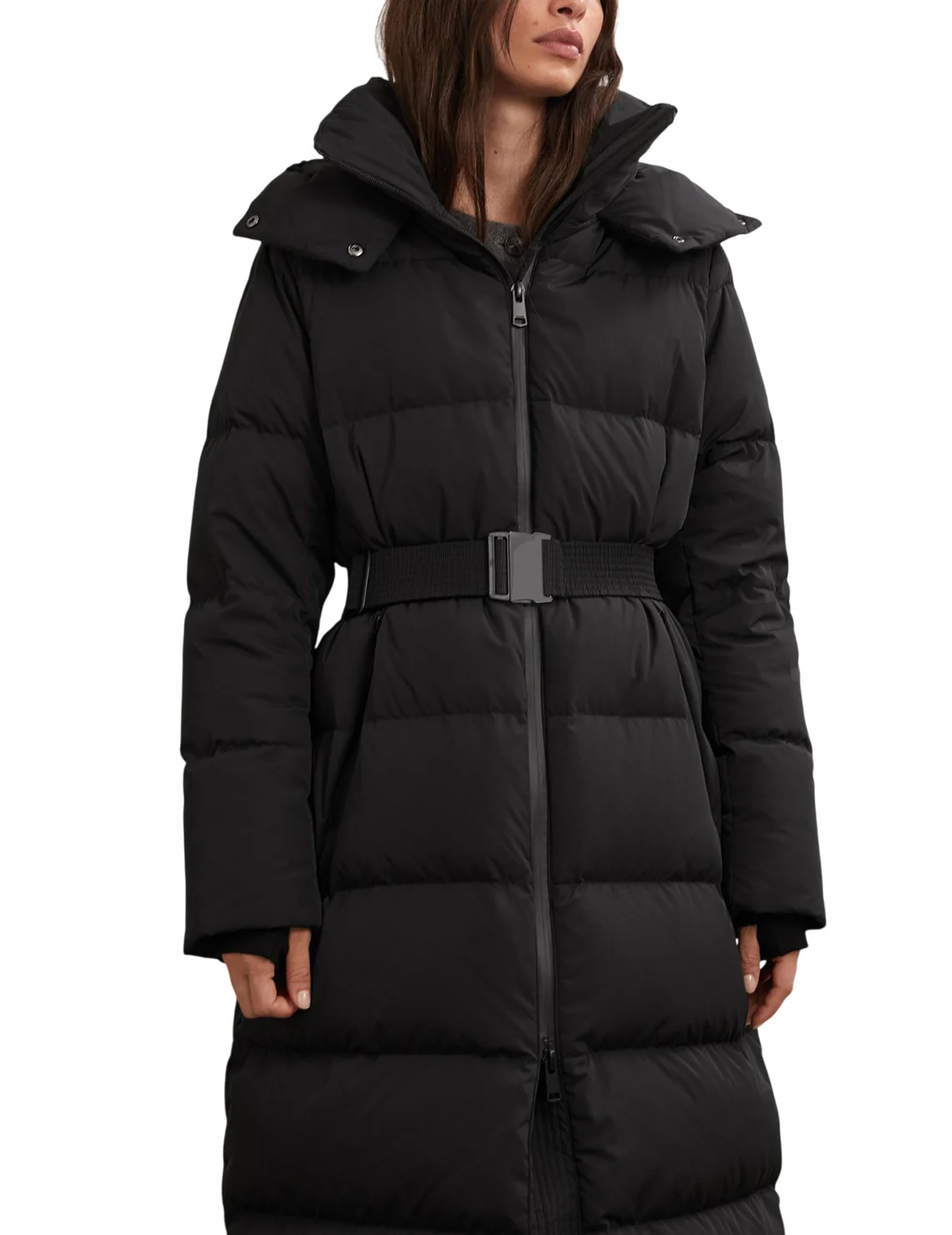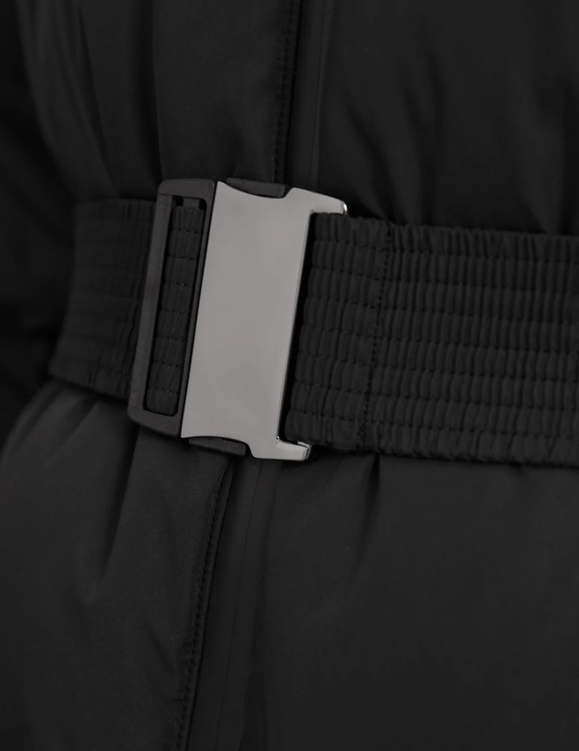 Пуховик виготовлений зі 100% поліестеру, наповнювач - 100% поліестер. Модель виконана у вільному крої. Має знімний капюшон з куліскою на кнопках, прорізні кишені на блискавках, застібку-блискавку, пояс у тон із пряжкою, довгі рукави та манжети з отворами для великих пальців.