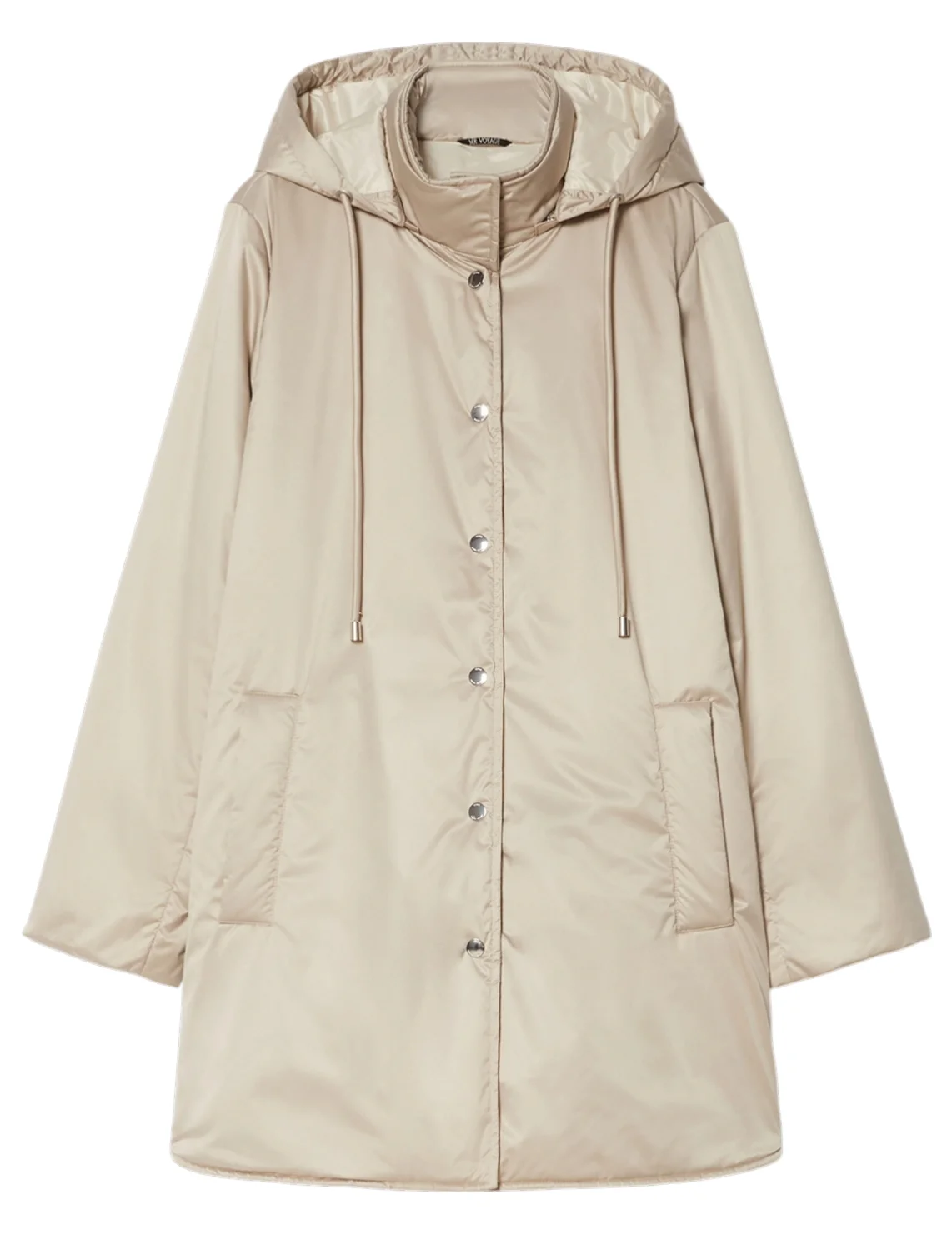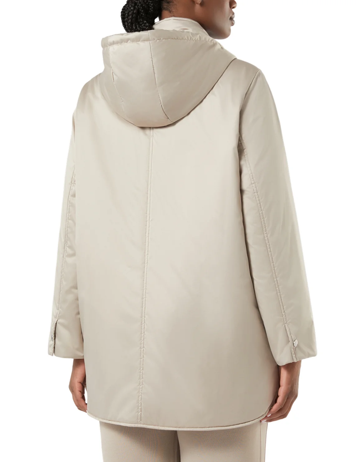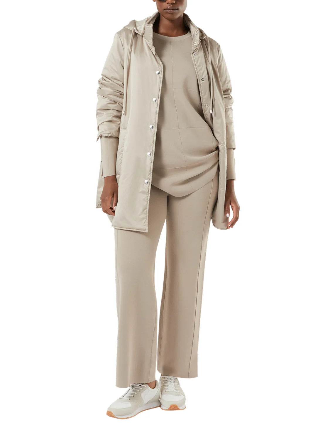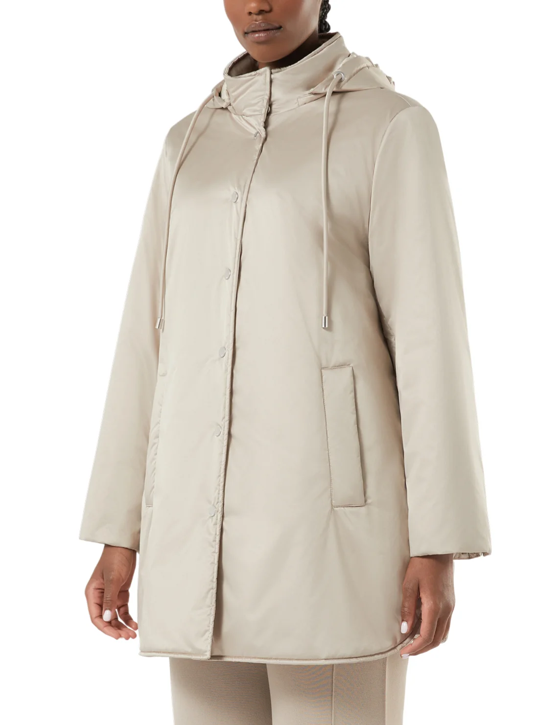 Пуховик виготовлено зі 100% поліестеру, наповнювач із кашеміру, поліестеру та вовни, підкладка з поліестеру. Модель виконана в прямому крої. Має комір-стійку, капюшон з куліскою, довгі рукави, застібку на кнопках і прорізні кишені.