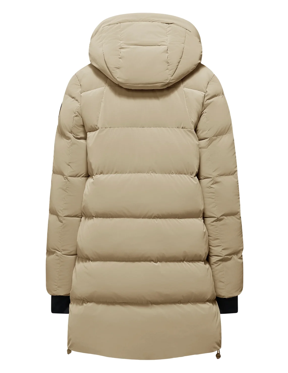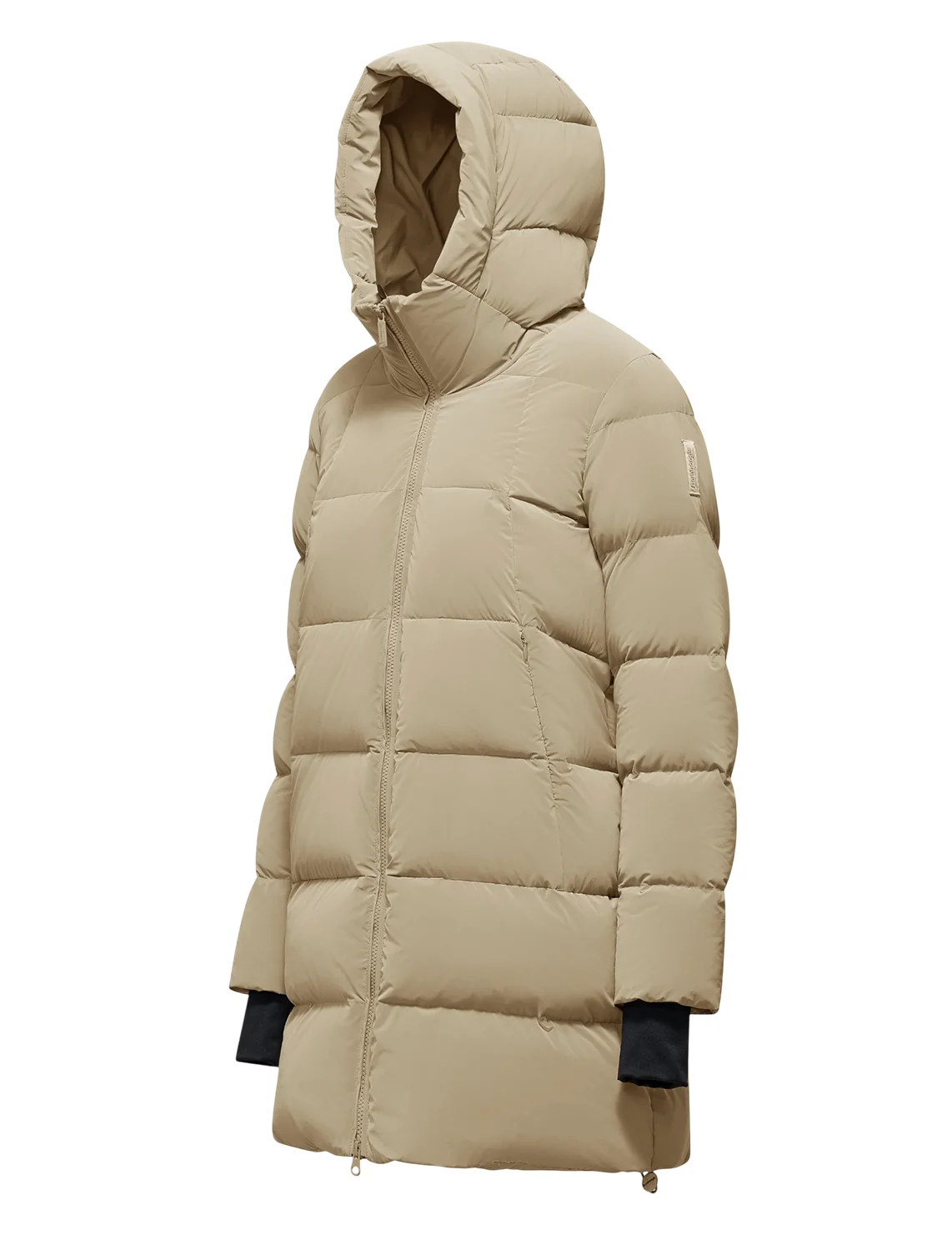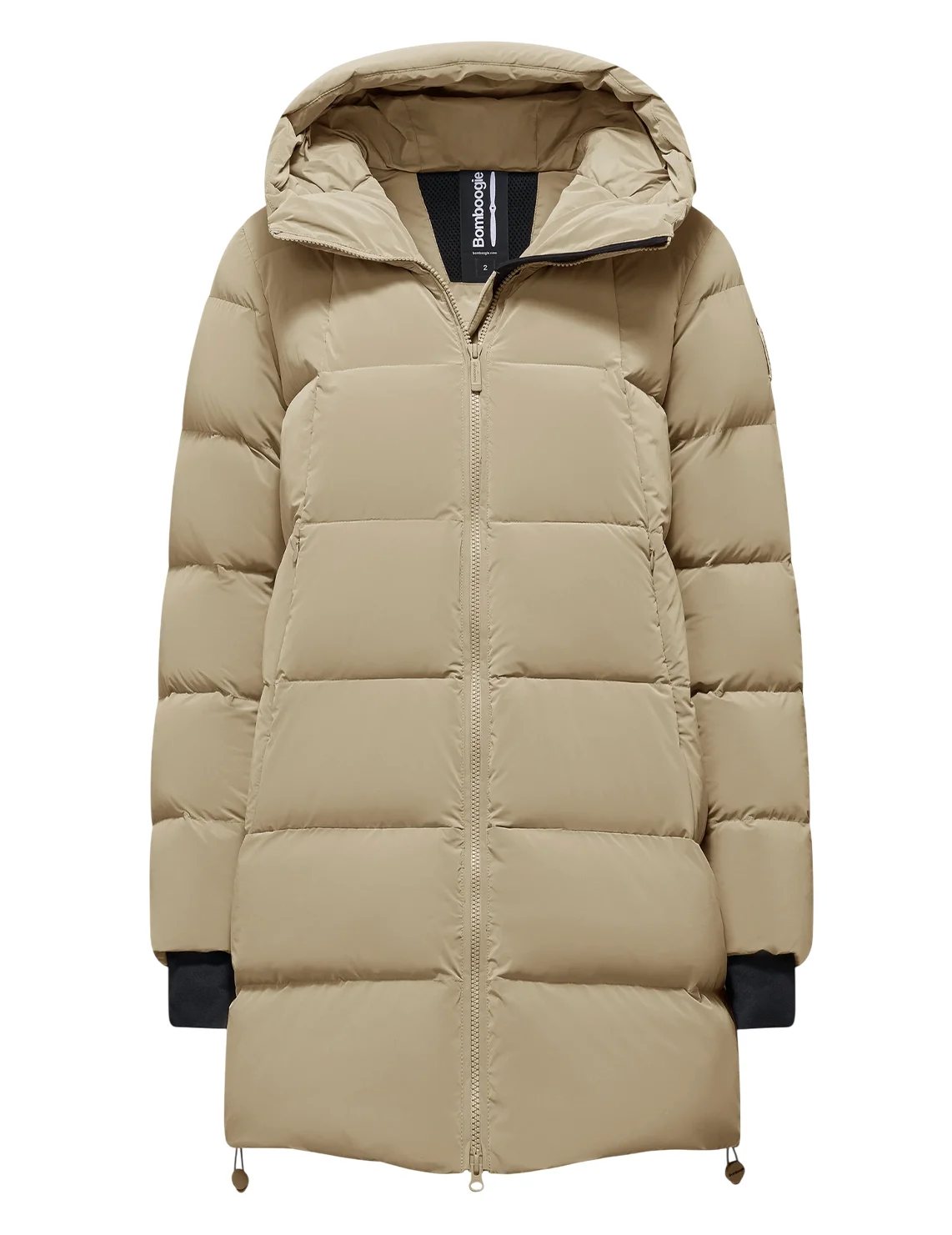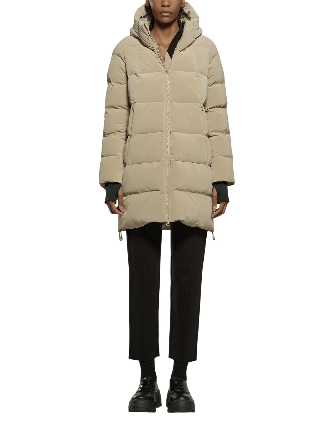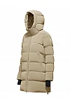 Пуховик виготовлений зі 100% поліаміду, наповнювач - 90% пух, 10% перо. Модель виконана в прямому крої. Має капюшон, куліску на подолі, кишені на блискавках, двосторонню застібку-блискавку та манжети з отворами для великих пальців.