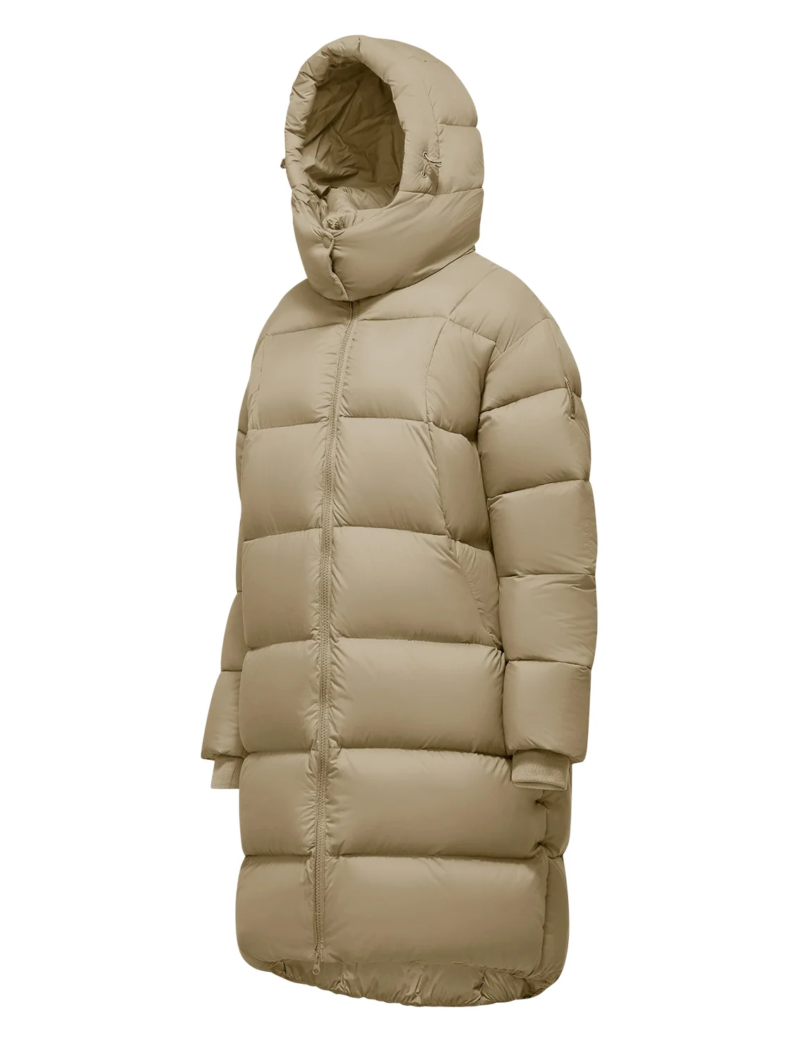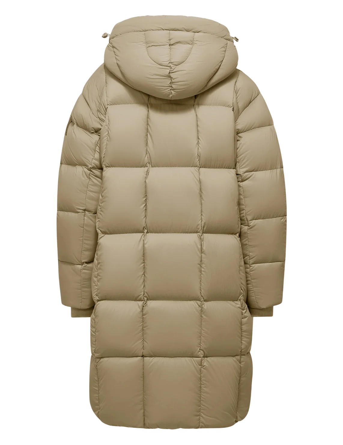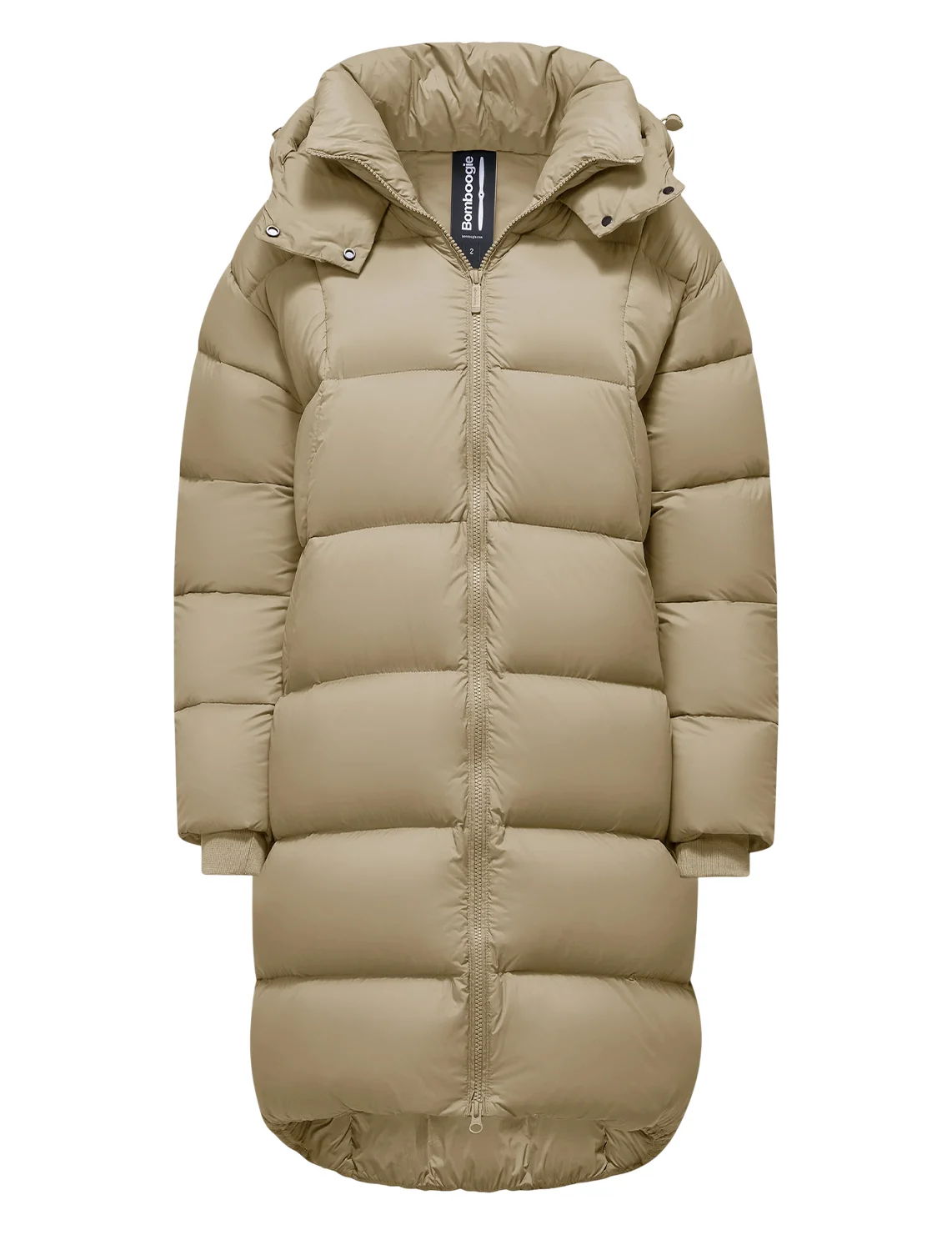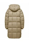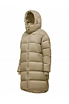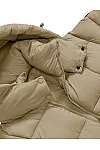 Пуховик виготовлений зі 100% нейлону, наповнювач - 90% пух, 10% перо. Модель прямого крою. Має капюшон на кнопках, куліску, двосторонню застібку-блискавку, довгі рукави з манжетами та прорізні кишені на блискавці.