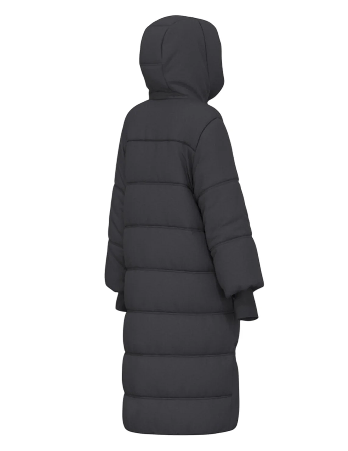 Пуховик виготовлений зі 100% поліестеру, наповнювач - 80% пух, 20% перо. Модель виконана в прямому крої. Має комір-стійку, довгі рукави з манжетами, прорізні кишені, капюшон з куліскою та двосторонню застібку-блискавку.