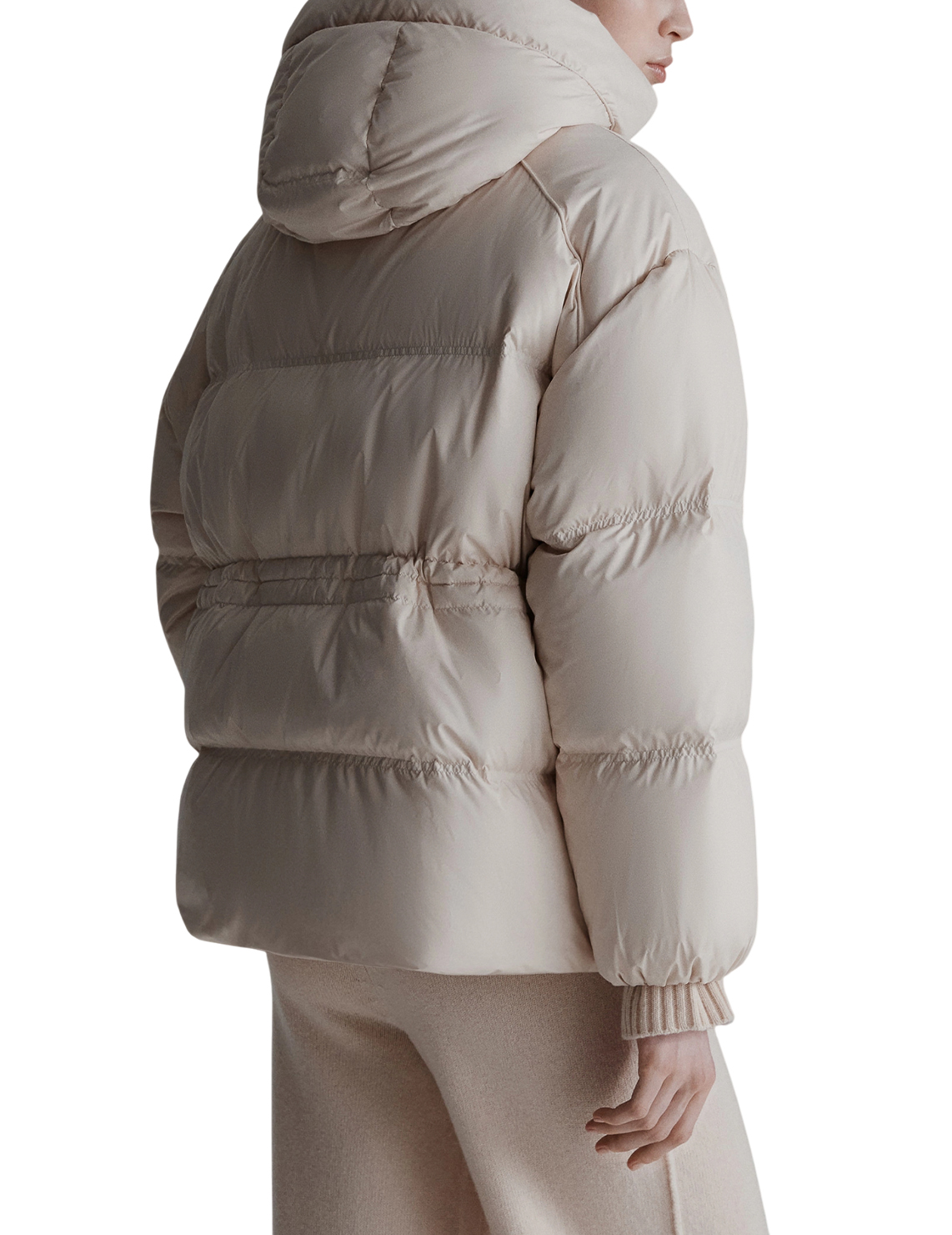Пуховик виготовлений зі 100% поліестеру, підкладка з поліестеру, а наповнювач зі 100% пуху. Модель виконана у вільному крої. Має капюшон, довгі рукави, еластичну талію, прорізні кишені на блискавках, застібку на блискавці та кнопках.