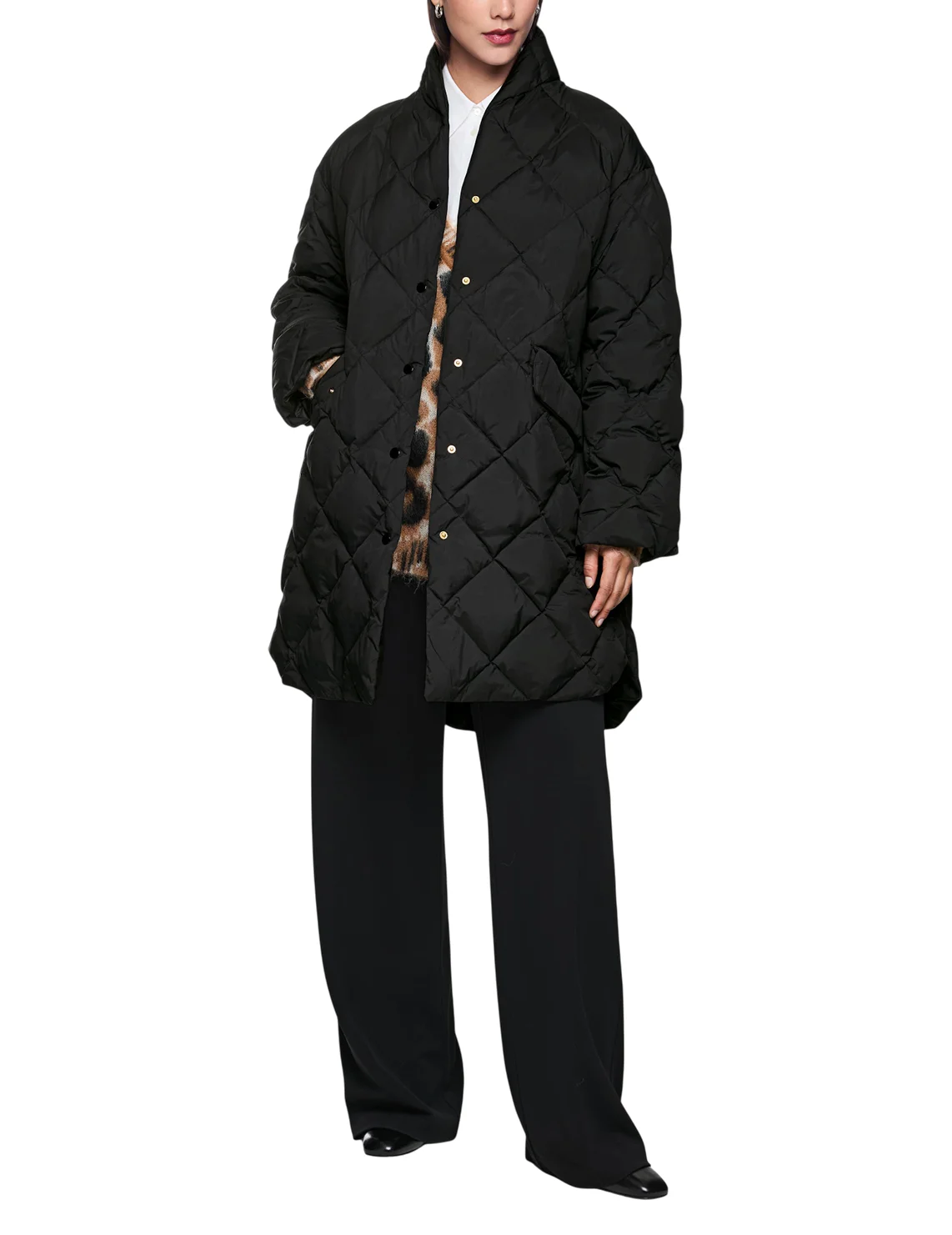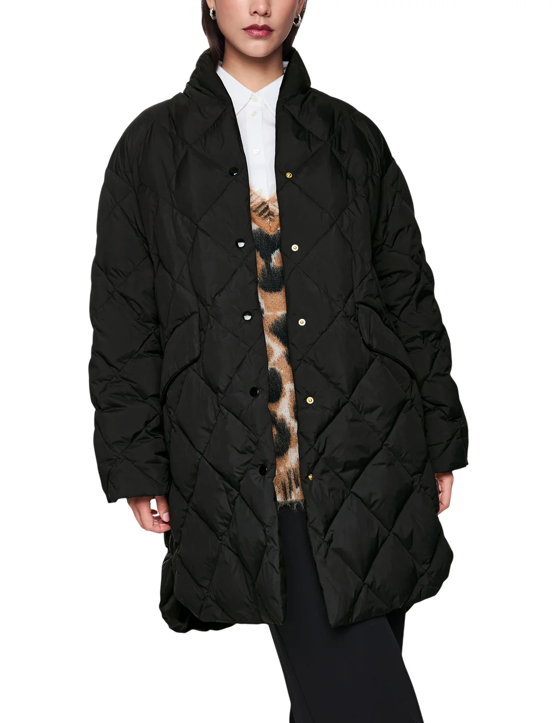 Пуховик виготовлений зі 100% поліаміду, наповнювач - 90% пух, 10% перо. Модель виконана у вільному крої. Має комір-стійку, довгі рукави, кишені з клапанами та застібку на кнопках.