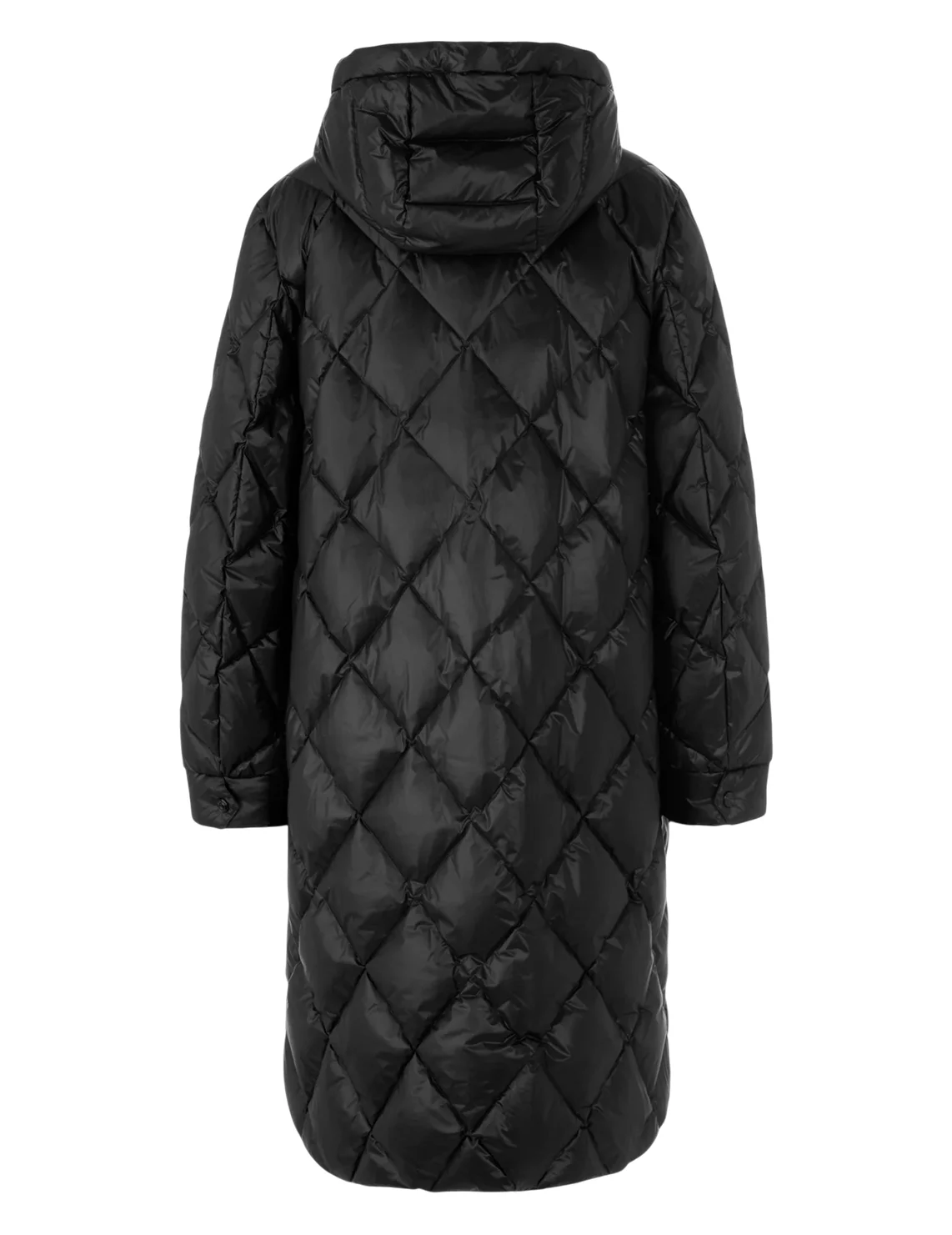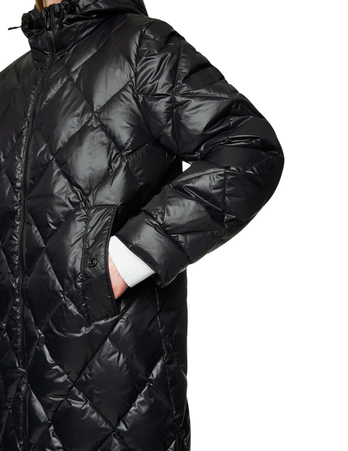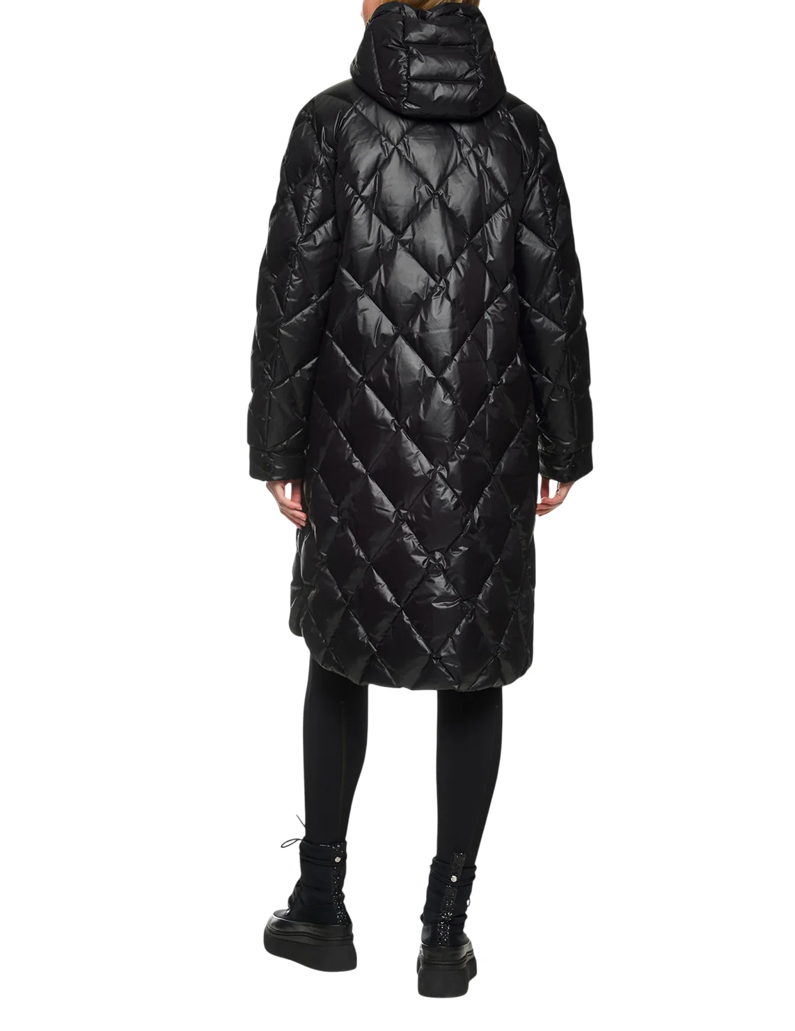 Пуховик виготовлений зі 100% поліаміду, наповнювач - 90% пух, 10% перо. Модель виконана в прямому крої. Має капюшон з куліскою, довгі рукави з манжетами, прорізні кишені на кнопках та двосторонню застібку-блискавку.
