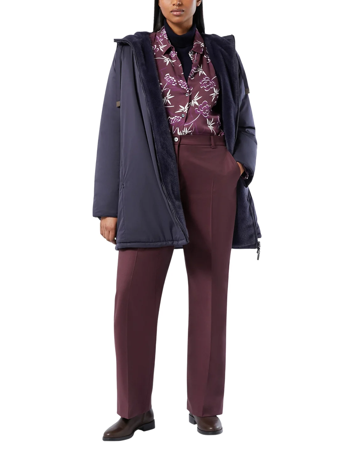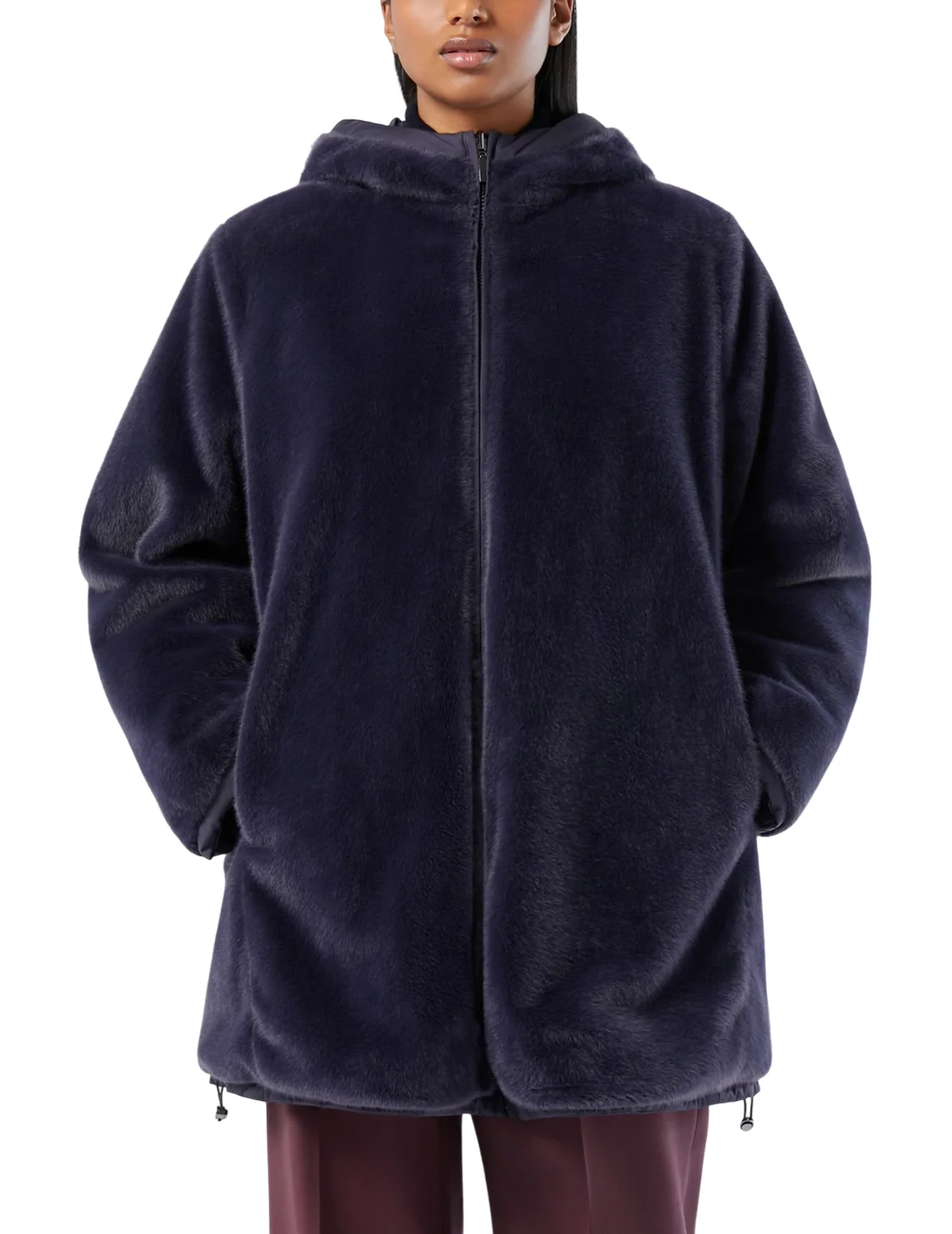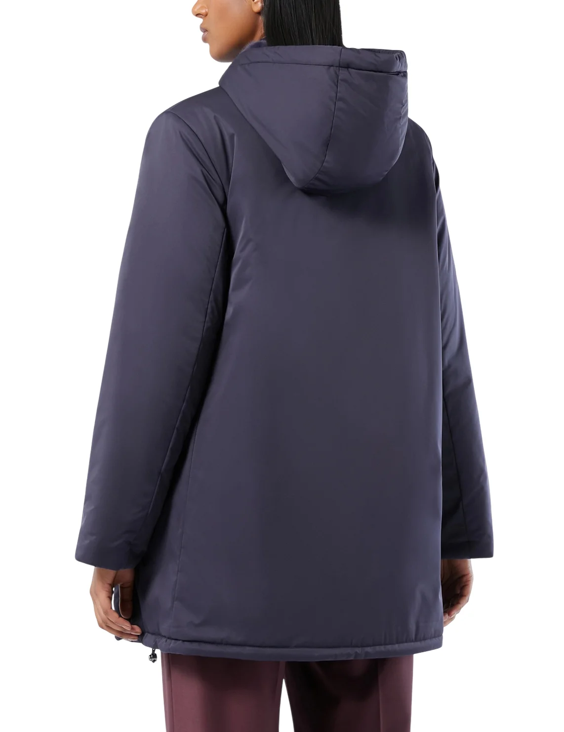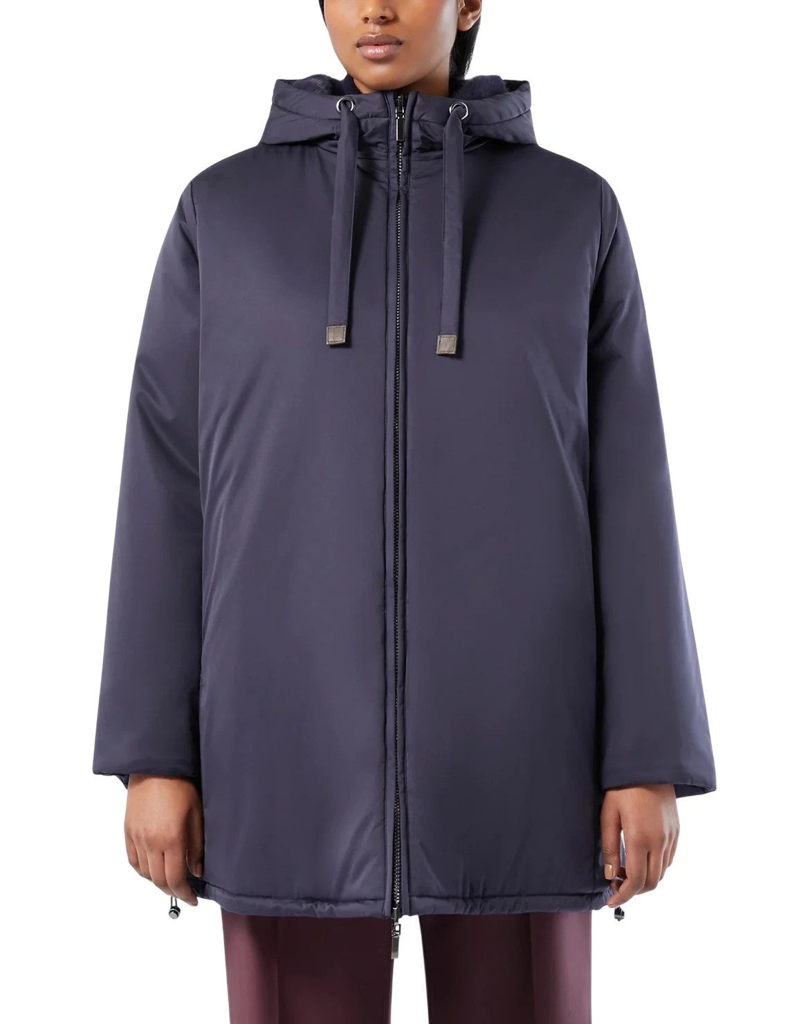 Двосторонній пуховик виготовлений зі 100% поліестеру, наповнювач - поліестер. Модель виконана в прямому крої. Має капюшон з куліскою, довгі рукави, прорізні кишені на блискавках, куліску на подолі та двосторонню застібку-блискавку.