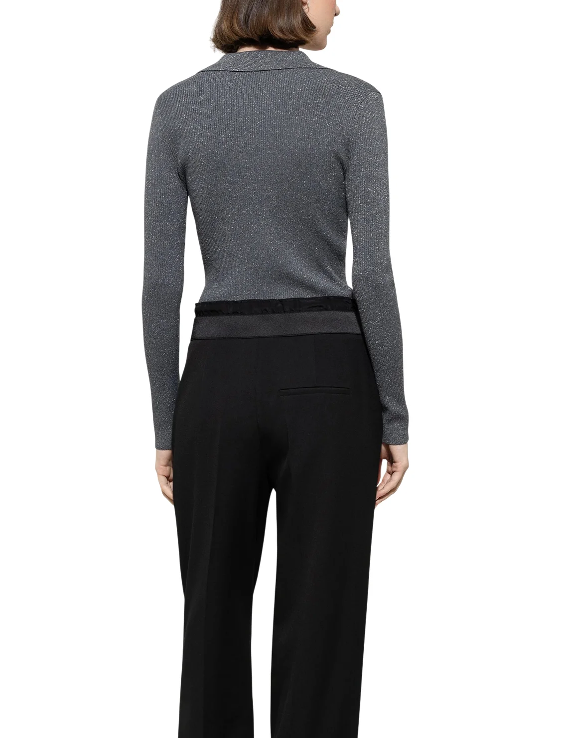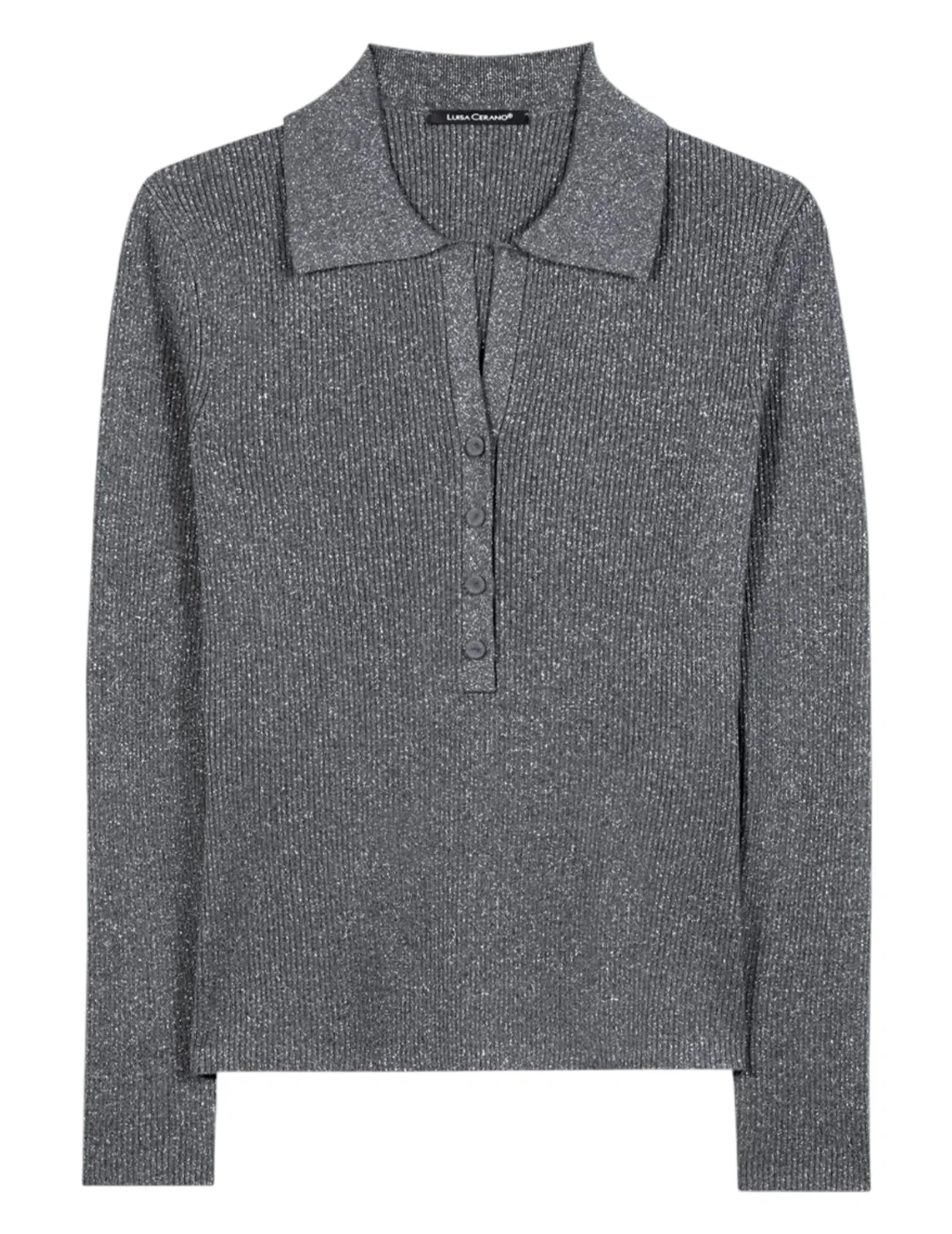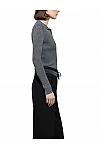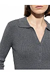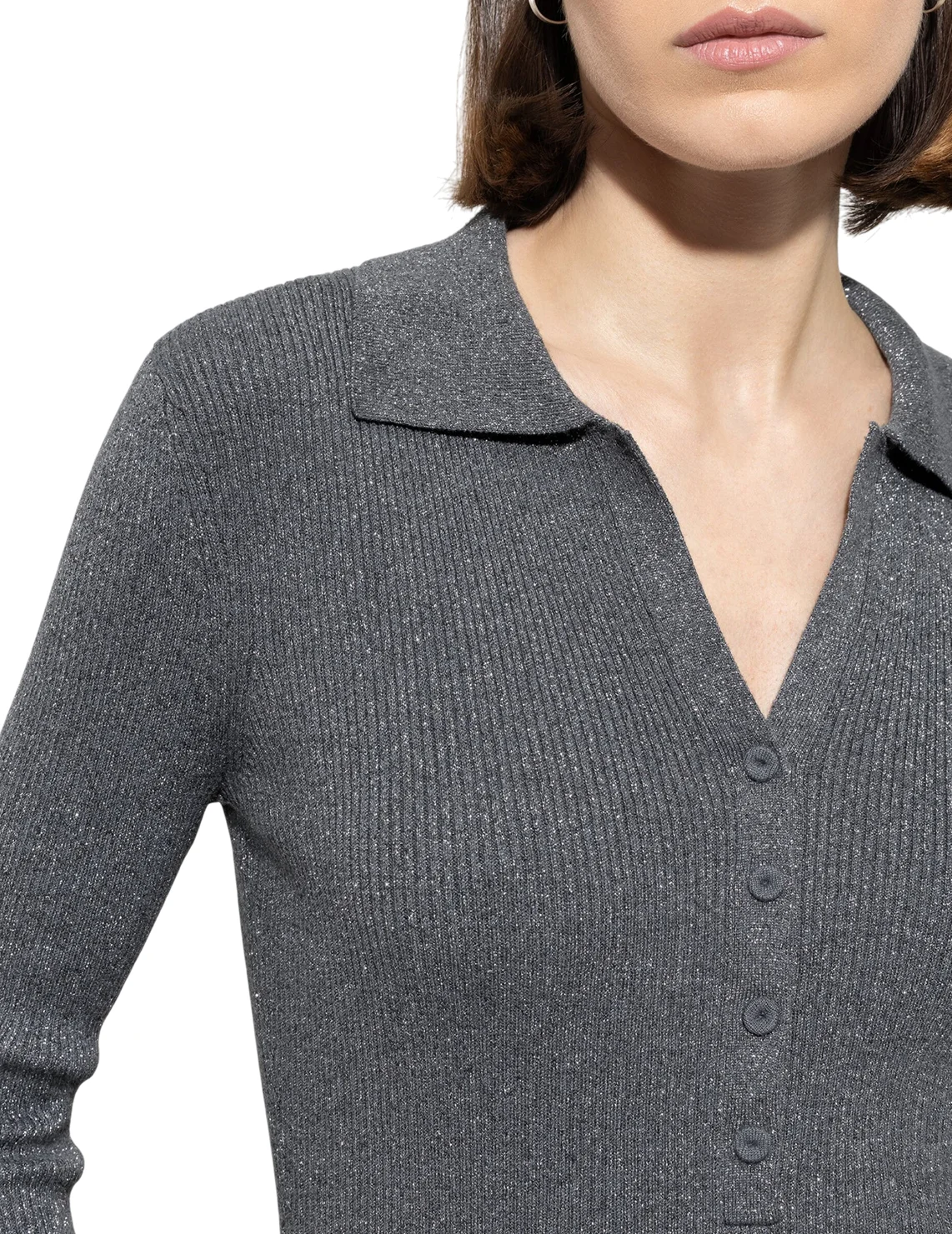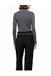 Пуловер виготовлений з віскози, поліаміду, поліестеру та вовни. Модель виконана в приталеному крої. Має відкладний комір, застібку на ґудзиках і довгі рукави з манжетами.